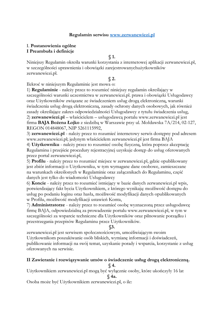 Regulamin serwisu www.zerwanewiezi.pl I. Postanowienia ogólne I Preambuła i definicje § 1. Niniejszy Regulamin określa warunki korzystania z internetowej aplikacji zerwanewiezi.pl, w szczególności uprawnienia i obowiązki zarejestrowanychużytkowników zerwanewiezi.pl. § 2. Ilekroć w niniejszym Regulaminie jest mowa o: 1) Regulaminie - należy przez to rozumieć niniejszy regulamin określający w szczególności warunki uczestnictwa w zerwanewiezi.pl. prawa i obowiązki Usługodawcy oraz Użytkowników związane ze świadczeniem usług drogą elektroniczną, warunki świadczenia usług drogą elektroniczną, zasady ochrony danych osobowych, jak również zasady określające zakres odpowiedzialności Usługodawcy z tytułu świadczenia usług, 2) zerwanewiezi.pl – właścicielem – usługodawcą portalu www.zerwanewiezi.pl jest firma BAJA Bożena Łojko z siedzibą w Warszawie przy ul. Mołdawska 7A/214, 02-127, REGON 014848067, NIP 5261115992, 3) zerwanewiezi.pl - należy przez to rozumieć internetowy serwis dostępny pod adresem www.zerwanewiezi.pl; jedynym właścicielem zerwanewiezi.pl jest firma BAJA 4) Użytkowniku - należy przez to rozumieć osobę fizyczną, która poprzez akceptację Regulaminu i przejście procedury rejestracyjnej uzyskuje dostęp do usług oferowanych przez portal zerwanewiezi.pl, 5) Profilu - należy przez to rozumieć miejsce w zerwanewiezi.pl, gdzie opublikowany jest zbiór informacji o Użytkowniku, w tym wymagane dane osobowe, zamieszczane na warunkach określonych w Regulaminie oraz załącznikach do Regulaminu, część danych jest tylko do wiadomości Usługodawcy 6) Koncie - należy przez to rozumieć istniejący w bazie danych zerwanewiezi.pl wpis, potwierdzający fakt bycia Użytkownikiem, z którego wynikają: możliwość dostępu do usług po podaniu loginu oraz hasła, możliwość modyfikacji danych opublikowanych w Profilu, możliwość modyfikacji ustawień Konta, 7) Administratorze - należy przez to rozumieć osobę wyznaczoną przez usługodawcę firmę BAJA, odpowiedzialną za prowadzenie portalu www.zerwanewiezi.pl, w tym w szczególności za wsparcie techniczne dla Użytkowników oraz pilnowanie porządku i przestrzegania przepisów Regulaminu przez Użytkowników. §3. zerwanewiezi.pl jest serwisem społecznościowym, umożliwiającym swoim Użytkownikom poszukiwanie osób bliskich, wymianę informacji i doświadczeń, publikowanie informacji na swój temat, uzyskanie porady i wsparcia, korzystanie z usług oferowanych na serwisie. II Zawieranie i rozwiązywanie umów o świadczenie usług drogą elektroniczną. § 4. Użytkownikiem zerwanewiezi.pl mogą być wyłącznie osoby, które ukończyły 16 lat § 4a. Osoba może być Użytkownikiem zerwanewiezi.pl, o ile: 1) posiada pełną zdolność do czynności prawnych albo uzyska zgodę przedstawiciela ustawowego w przypadku, gdy posiada ograniczoną zdolność do czynności prawnych. 2) przebywała lub przebywa w Domu Dziecka, pochodzi z rodziny adopcyjnej, rodziny zastępczej, rodziny biologicznej w której nastąpiło rozdzielenie itp. 3) pochodzi z rodziny w której zostało odebrana osoba poszukiwana i zostały ograniczone wedle niej prawa rodzicielskie 4) wyraża zgodę na przetwarzanie danych osobowych do celów poszukiwawczych 5) poszukuje osoby zaginionej 6) potrzebuje wsparcia, pomocy itp. § 5. 1. Rejestrując Konto Użytkownik wyraża zgodę na wszystkie warunki niniejszego Regulaminu i zobowiązuje się do ich przestrzegania. 2. Rejestrując konto Użytkownik wyraża zgodę na uiszczenie opłaty jednorazowej w formie wysłania sms’a w kwocie min. 5,00 zł 3. W przypadku cofnięcia zgody na którykolwiek z warunków Regulaminu Użytkownik zobowiązany jest do natychmiastowego usunięcia swojego Konta lub zawiadomienia Administratora o cofnięciu zgody. § 6. 1. Umowa o świadczenie usług drogą elektroniczną zostaje zawarta przez Użytkowników z chwili zaakceptowania regulaminu oraz wyboru usługi świadczonej przez BAJA w ramach www.zerwanewiezi.pl. Usługi świadczone są wyłącznie zarejestrowanym Użytkownikom po poprawnym zalogowaniu się na Konto. 2. Umowa zostaje zawarta na czas nieokreślony. 3. Każda ze stron może rozwiązać Umowę o świadczenie usług drogą elektroniczną bez podania przyczyn w trybie natychmiastowym. 4. BAJA – www.zerwanewiezi.pl rozwiązuje Umowę poprzez skasowanie Konta Użytkownika przez Administratora. 5. Użytkownik rozwiązuje Umowę poprzez: a) zgłoszenie żądania usunięcia Konta Administratorom. 6. W przypadku zgłoszenia żądania usunięcia Konta Administratorom zgodnie z § 6 ust. 5 pkt. 2), rozwiązanie Umowy następuje po upływie okresu wypowiedzenia wynoszącego 72 godziny. § 6a. BAJA zastrzega sobie prawo do usunięcia Konta Użytkownika, którego działania zostaną uznane za szkodliwe dla portalu www.zerwanewiezi.pl. oraz na rzecz Fundacji Zerwane Więzi Baja w przypadku łamania prawa karnego oraz prawa cywilnego przez Użytkownika na łamach serwisu ma obowiązek zgłoszenia faktu odpowiednim organom państwowym. § 7. 1. Użytkownik sam wybiera usługę z której chce skorzystać. 2. BAJA zastrzega sobie prawo do zmiany kwot za płatne usługi na portalu www.zerwanewiezi.pl w celu wsparcia Użytkownika. 3. Użytkownik może zostać zobowiązany do uiszczenia opłaty za usługę, na której odpłatne otrzymywanie wyraził zgody akceptując regulamin. 4. Użytkownik wyraża zgodę na uiszczenie na rzecz właściciela portalu firmy BAJA, opłatę jednorazową związaną z kosztami rejestracyjnymi. § 8. BAJA zastrzega sobie prawo dowolnej modyfikacji usług, narzędzi oraz sposobu działania www.zerwanewiezi.pl, w tym usunięcia wszelkich zgromadzonych danych w bazie, zaprzestania działalności, podjęcia wszelkich dozwolonych przez prawo czynności związanych z serwisem. Użytkownikowi nie przysługują z tytułu wskazanych czynności żadne roszczenia względem BAJA. § 8a. Użytkownik udziela 