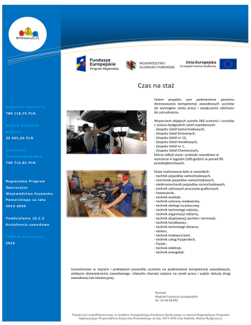 Rozwiązania informatyczne Czas na staż W A R T O ŚĆ P R O J E K T U : 788 118,75 PLN WKŁAD BUDŻETU M I A ST A: 39 405,94 PLN W Y SO K O ŚĆ D O F I NA N SO W A N I A : 748 712,81 PLN R e g i o n a ln y P r o g r a m Operacyjny Województwa KujawskoP o m o r s k ie g o n a l a t a 2014-2020 P o d d z ia ł a n i e 1 0 . 2 . 3 K s z t a ł c e n ie z a w o d o w e TERMIN REALIZACJI: 2016 Celem projektu jest podniesienie poziomu dostosowania kompetencji zawodowych uczniów do wymogów rynku pracy i zwiększenie zdolności do zatrudnienia. Wsparciem objętych zostało 260 uczennic i uczniów z sześciu bydgoskich szkół zawodowych: - Zespołu Szkół Samochodowych, - Zespołu Szkół Drzewnych, - Zespołu Szkół nr 12, - Zespołu Szkół Handlowych, - Zespołu Szkół nr 1, - Zespołu Szkół Chemicznych, którzy odbyli staże i praktyki zawodowe w wymiarze 4 tygodni (160 godzin) w ponad 90 przedsiębiorstwach. Staże realizowane były w zawodach: - technik pojazdów samochodowych, - mechanik pojazdów samochodowych, - elektromechanik pojazdów samochodowych, - technik cyfrowych procesów graficznych, - fototechnik, - technik analityk, - technik ochrony środowiska, - technik obsługi turystycznej, - technik technologii odzieży, - technik organizacji reklamy, - technik eksploatacji portów i terminali, - technik handlowiec, - technik technologii drewna, - stolarz, - technik hodowca koni, - technik usług fryzjerskich, - fryzjer, - technik elektryk, - technik energetyk. Uczestnictwo w stażach i praktykach pozwoliło uczniom na podniesienie kompetencji zawodowych, zdobycie doświadczenia zawodowego. Ułatwiło również wejście na rynek pracy i wybór dalszej drogi zawodowej lub edukacyjnej. Kontakt: Wydział Funduszy Europejskich tel. 52 58 58 091 Projekt jest współfinansowany ze środków Europejskiego Funduszu Społecznego w ramach Regionalnego Programu Operacyjnego Województwa Kujawsko-Pomorskiego na lata 2014-2020 oraz budżetu Miasta Bydgoszczy.
