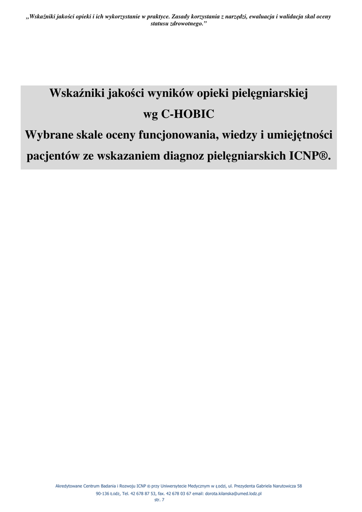 „Wskaźniki jakości opieki i ich wykorzystanie w praktyce. Zasady korzystania z narzędzi, ewaluacja i walidacja skal oceny statusu zdrowotnego.” Wskaźniki jakości wyników opieki pielęgniarskiej wg C-HOBIC Wybrane skale oceny funcjonowania, wiedzy i umiejętności pacjentów ze wskazaniem diagnoz pielęgniarskich ICNP®. ® przy Uniwersytecie Medycznym w Łodzi, ul. Prezydenta Gabriela Narutowicza 58 Łódź, Tel. 42 678 87 53, fax. 42 678 03 67 email: [email protected] Akredytowane Centrum Badania i Rozwoju ICNP 90-136 str. 7 „Wskaźniki jakości opieki i ich wykorzystanie w praktyce. Zasady korzystania z narzędzi, ewaluacja i walidacja skal oceny statusu zdrowotnego.” Tab. 1 Ocena statusu funkcjonalnego (skala ADL) terminologia dla opieki ostrej Status funkcjonalny (skala ADL) ADL – samodzielność – ocena samodzielności, wynikająca ze wszystkich aktywności podejmowanych w ciągu doby (interRAI AC:G1) C - HOBIC ICNP 0 – niezależny Efektywna zdolność 1 – tylko pomoc wstępna (set up help Negatywna zdolność only) 2. – nadzór Negatywna zdolność Negatywna zdolność 3 – asystowanie ograniczone 4 – asystowanie w szerokim zakresie Negatywna zdolność 5 – asystowanie w maksymalnym Negatywna zdolność zakresie 6 – całkowita zależność Negatywna zdolność C - HOBIC ICNP Kąpanie się 0 zdolny/a do kąpania się +10028224 10028224+0 1-6 zaburzona zdolność kąpania się = 10000956+1,2,3,4, 5, lub 6 10000956 Higiena osobista 0 zdolny/a do wykonania higieny osobistej = 10028708+0 10028708 1-6 zaburzona zdolność wykonania higieny 10000987+1,2,3,4, 5, lub 6 osobistej = 10000987 0 zdolny/a do chodzenia = 10028333 10028333 + 0 Chodzenie 1-6 zaburzone chodzenie+10001046 10001046 + 1,2,3,4,5 lub 6 0 zdolny/a do przemieszczania się + 10028322 + 0 10028322 Przemieszczanie się do toalety 1-6 zaburzona zdolność przemieszczania się + 10001005 + 1,2,3,4,5 lub 6 10001005 zdolny/a do samodzielnego korzystania z 10028314 +0 0 toalety + 10028314 Korzystanie z toalety 1-6 zaburzone samodzielne korzystanie z 10000994 +1,2,3,4,5 lub 6 toalety +10000994 0 zdolny/a do mobilności w łóżku + 10029240 +0 10029240 Mobilność w łóżku 1-6 zaburzona mobilność w łóżku +10001067 10001067 +1,2,3,4,5 lub 6 0 zdolny/a do samodzielnego jedzenia + 10028253 +0 10028253 Jedzenie 1-6 zaburzone samodzielne jedzenie + 10000973 +1,2,3,4,5 lub 6 10000973 źródło: Nursing Outcome Indicators. International Classification for Nursing Practice ( ICNP®) Catalogue. International Council of Nurses.Genewa 2011 s.5. ® przy Uniwersytecie Medycznym w Łodzi, ul. Prezydenta Gabriela Narutowicza 58 Łódź, Tel. 42 678 87 53, fax. 42 678 03 67 email: [email protected] Akredytowane Centrum Badania i Rozwoju ICNP 90-136 str. 8 „Wskaźniki jakości opieki i ich wykorzystanie w praktyce. Zasady korzystania z narzędzi, ewaluacja i walidacja skal oceny statusu zdrowotnego.” Tab. 2 Ocena statusu funkcjonalnego (skala ADL) terminologia dla obszaru ciągłej kompleksowej opieki i opieki długoterminowej status funkcjonalny/ADL ADL – samodzielność – ocena postępów rezydenta w czasie wszystkich dyżurów pielęgniarskich, podczas ostatnich 7 dni, wykluczając stan przy przyjęciu (MDS-2.0: G1A and G2A) C - HOBIC ICNP 0 niezależny Efektywna zdolność 1 nadzór Negatywna zdolność 2 asystowanie ograniczone Negatywna zdolność 3 asystowanie w szerokim zakresie Negatywna zdolność 4 całkowita zależność Negatywna zdolność C – HOBIC ICNP Mobilność w łóżku 0 zdolny/a do mobilności w łóżku = 10029240+0 10029240 1-4 zaburzona mobilność w łóżku = 10001067 10001067+1,2,3 lub 4 Przemieszczanie się 0 zdolny/a do przemieszczania się = 10028322+0 10028322 1-4 zaburzona zdolność przemieszczania się = 10001005+1,2,3 ,4 10001005 Chodzenie po pokoju 0 zdolny/a do chodzenia = 10028333 10028333+ „oś”Lokalizacja+0 1-4 zaburzone chodzenie = 10001046 10001046+„oś” Lokalizacja+1,2,3, 4 Chodzenie po korytarzu 0 zdolny/a do chodzenia = 10028333 10028333+„oś” Lokalizacja +0 1-4 zaburzone chodzenie= 10001046 10001046+„oś” Lokalizacja +1,2,3, 4 Poruszanie się po oddziale 0 zdolny/a do poruszania się = 10028461 10028461+„oś” Lokalizacja +0 1-4 zaburzona mobilność = 10001219 10001219+„oś” Lokalizacja +1,2,3, 4 Poruszanie się poza 0 zdolny/a do poruszania się = 10028461 10028461+„oś” Lokalizacja +0 oddziałem 1-4 zaburzona mobilność = 10001219 10001219+„oś” Lokalizacja +1,2,3, 4 Ubieranie się 0 zdolny/a do ubierania się = 10028211 10028211+0 1-4 zaburzona zdolność ubierania się = 10027578+1,2,3, 4 10027578 Jedzenie 0 zdolny/a do samodzielnego jedzenia = 10028253+0 10028253 1-4 zaburzone samodzielne jedzenie = 10000973+1,2,3, 4 10000973 Korzystanie z toalety 0 zdolny/a do samodzielnego korzystania z 10028314+0 toalety = 10028314 1-4 zaburzone samodzielne korzystanie z 10000994+1,2,3, 4 toalety = 10000994 Higiena osobista 0 zdolny/a do wykonania higieny osobistej = 10028708+0 10028708 1-4 zaburzona zdolność wykonania higieny 10000987+1,2,3,4 osobistej = 10000987 źródło: Nursing Outcome Indicators. International Classification for Nursing Practice ( ICNP®) Catalogue. International Council of Nurses.Genewa 2011 s.6. ® przy Uniwersytecie Medycznym w Łodzi, ul. Prezydenta Gabriela Narutowicza 58 Łódź, Tel. 42 678 87 53, fax. 42 678 03 67 email: [email protected] Akredytowane Centrum Badania i Rozwoju ICNP 90-136 str. 9 „Wskaźniki jakości opieki i ich wykorzystanie w praktyce. Zasady korzystania z narzędzi, ewaluacja i walidacja skal oceny statusu zdrowotnego.” Tab. 3 Ocena statusu funkcjonalnego (skala ADL) terminologa dla obszaru opieki domowej Status funkcjonalny (skala ADL) ocena postępów rezydenta w czasie wszystkich dyżurów pielęgniarskich, podczas ostatnich 7 dni, wykluczając stan przy przyjęciu (RAI:HC H2) C – HOBIC 0 niezależny 1 tylko pomoc wstępna 2. nadzór 3 asystowanie ograniczone 4 asystowa