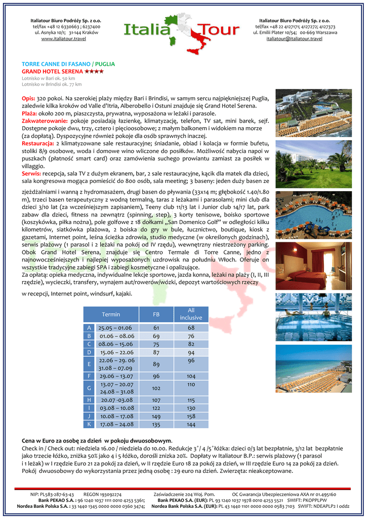 Italiatour Biuro Podróży Sp. z o.o. tel/fax +48 12 6330663 ; 6237400 ul. Asnyka 10/1; 31-144 Kraków www.italiatour.travel Italiatour Biuro Podróży Sp. z o.o. tel/fax +48 22 4127171; 4127272; 4127373 ul. Emilii Plater 10/54; 00-669 Warszawa [email protected] TORRE CANNE DI FASANO / PUGLIA GRAND HOTEL SERENA Lotnisko w Bari ok. 50 km Lotnisko w Brindisi ok. 77 km Opis: 320 pokoi. Na szerokiej plaży między Bari i Brindisi, w samym sercu najpiękniejszej Puglia, zaledwie kilka kroków od Valle d’Itria, Alberobello i Ostuni znajduje się Grand Hotel Serena. Plaża: około 200 m, piaszczysta, prywatna, wyposażona w leżaki i parasole. Zakwaterowanie: pokoje posiadają łazienkę, klimatyzację, telefon, TV sat, mini barek, sejf. Dostępne pokoje dwu, trzy, cztero i pięcioosobowe; z małym balkonem i widokiem na morze (za dopłatą). Dyspozycyjne również pokoje dla osób sprawnych inaczej. Restauracja: 2 klimatyzowane sale restauracyjne; śniadanie, obiad i kolacja w formie bufetu, stoliki 8/9 osobowe, woda i domowe wino wliczone do posiłków. Możliwość nabycia napoi w puszkach (płatność smart card) oraz zamówienia suchego prowiantu zamiast za posiłek w villaggio. Serwis: recepcja, sala TV z dużym ekranem, bar, 2 sale restauracyjne, kącik dla matek dla dzieci, sala kongresowa mogąca pomieścić do 800 osób, sala meeting; 3 baseny: jeden duży basen ze zjeżdżalniami i wanną z hydromasażem, drugi basen do pływania (33x14 m; głębokość 1.40/1.80 m), trzeci basen terapeutyczny z wodną termalną, taras z leżakami i parasolami; mini club dla dzieci 3/10 lat (za wcześniejszym zapisaniem), Teeny club 11/13 lat i Junior club 14/17 lat, park zabaw dla dzieci, fitness na zewnątrz (spinning, step), 3 korty tenisowe, boisko sportowe (koszykówka, piłka nożna), pole golfowe z 18 dołkami „San Domenico Golf” w odległości kilku kilometrów, siatkówka plażowa, 2 boiska do gry w bule, łucznictwo, boutique, kiosk z gazetami, Internet point, leśna ścieżka zdrowia, studio medyczne (w określonych godzinach), serwis plażowy (1 parasol i 2 leżaki na pokój od IV rzędu), wewnętrzny niestrzeżony parking. Obok Grand Hotel Serena, znajduje się Centro Termale di Torre Canne, jedno z najnowocześniejszych i najlepiej wyposażonych uzdrowisk na południu Włoch. Oferuje on wszystkie tradycyjne zabiegi SPA i zabiegi kosmetyczne i opalizujące. Za opłatą: opieka medyczna, indywidualne lekcje sportowe, jazda konna, leżaki na plaży (I, II, III rzędzie), wycieczki, transfery, wynajem aut/rowerów/wózki, depozyt wartościowych rzeczy w recepcji, Internet point, windsurf, kajaki. Termin A B C D E F G H I J K 25.05 – 01.06 01.06 – 08.06 08.06 – 15.06 15.06 – 22.06 22.06 – 29. 06 31.08 – 07.09 29.06 – 13.07 13.07 – 20.07 24.08 – 31.08 20.07 -03.08 03.08 – 10.08 10.08 – 17.08 17.08 – 24.08 FB 61 69 75 87 89 96 102 107 122 149 135 All inclusive 68 76 82 94 96 104 110 115 130 158 144 Cena w Euro za osobę za dzień w pokoju dwuosobowym. Check in / Check out: niedziela 16.00 / niedziela do 10.00. edukcje 3 / 4 /5 łóżka: dzieci 0/3 lat bezpłatnie, 3/12 lat bezpłatnie jako trzecie łóżko, zniżka 50% jako 4 i 5 łóżko, dorośli znizka 20%. Dopłaty w Italiatour B.P.: serwis plażowy (1 parasol i 1 leżak) w I rzędzie Euro 21 za pokój za dzień, w II rzędzie Euro 18 za pokój za dzień, w III rzędzie Euro 14 za pokój za dzień. Pokój dwuosobowy do wykorzystania przez jedną osobę : 29 euro na dzień. Zwierzęta: nieakceptowane. NIP: PL583-287-63-43 REGON 193092274 Bank PEKAO S.A. : 96 1240 1037 1111 0010 4253 5361; Nordea Bank Polska S.A. : 33 1440 1345 0000 0000 0360 3474; Zaświadczenie 204 Woj. Pom. OC Gwarancja Ubezpieczeniowa AXA nr 01.495160 Bank PEKAO S.A. (EUR): PL 93 1240 1037 1978 0010 4253 5521 SWIFT: PKOPPLPW Nordea Bank Polska S.A. (EUR): PL 43 1440 1101 0000 0000 0583 7103 SWIFT: NDEAPLP2 I oddz