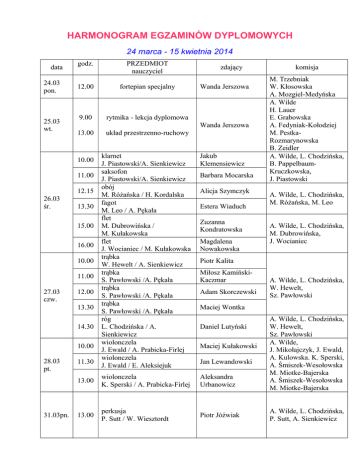 HARMONOGRAM EGZAMINÓW DYPLOMOWYCH 24 marca - 15 kwietnia 2014 data 24.03 pon. 25.03 wt. godz. 12.00 fortepian specjalny 9.00 rytmika - lekcja dyplomowa 13.00 13.00 wiolonczela K. Sperski / A. Prabicka-Firlej Aleksandra Urbanowicz 13.00 perkusja P. Sutt / W. Wiesztordt Piotr Jóźwiak 13.30 15.00 16.00 10.00 11.00 12.00 13.30 14.30 10.00 31.03pn. układ przestrzenno-ruchowy Jakub Klemensiewicz 12.15 28.03 pt. Wanda Jerszowa klarnet J. Piastowski/A. Sienkiewicz saksofon J. Piastowski/A. Sienkiewicz obój M. Różańska / H. Kordalska fagot M. Leo / A. Pękała flet M. Dubrowińska / M. Kułakowska flet J. Wocianiec / M. Kułakowska trąbka W. Hewelt / A. Sienkiewicz trąbka S. Pawłowski /A. Pękała trąbka S. Pawłowski /A. Pękała trąbka S. Pawłowski /A. Pękała róg L. Chodzińska / A. Sienkiewicz wiolonczela J. Ewald / A. Prabicka-Firlej wiolonczela J. Ewald / E. Aleksiejuk 11.00 27.03 czw. zdający Wanda Jerszowa 10.00 26.03 śr. PRZEDMIOT nauczyciel 11.30 Barbara Mocarska Alicja Szymczyk Estera Wiaduch Zuzanna Kondratowska Magdalena Nowakowska komisja M. Trzebniak W. Kłosowska A. Mozgiel-Medyńska A. Wilde H. Lauer E. Grabowska A. Fedyniak-Kołodziej M. PestkaRozmarynowska B. Zeidler A. Wilde, L. Chodzińska, B. PappelbaumKruczkowska, J. Piastowski A. Wilde, L. Chodzińska, M. Różańska, M. Leo A. Wilde, L. Chodzińska, M. Dubrowińska, J. Wocianiec Piotr Kalita Miłosz KamińskiKaczmar Adam Skorczewski A. Wilde, L. Chodzińska, W. Hewelt, Sz. Pawłowski Maciej Wontka Daniel Lutyński Maciej Kułakowski Jan Lewandowski A. Wilde, L. Chodzińska, W. Hewelt, Sz. Pawłowski A. Wilde, J. Mikołajczyk, J. Ewald, A. Kulowska. K. Sperski, A. Śmiszek-Wesołowska M. Miotke-Bajerska A. Śmiszek-Wesołowska M. Miotke-Bajerska A. Wilde, L. Chodzińska, P. Sutt, A. Sienkiewicz 10.00 1.04 wt. 11.15 12.30 10.00 2.04 śr. 11.30 13.00 10.00 3.04 czw. 11.30 13.00 10.00 11.30 4.04 pt. 7.04 pn 13.00 15.00 altówka I. Albrecht / D. Rogowicz 10.00 fortepian H. Tokarska 11.30 12.30 10.00 11.30 8.04 wt. 9.04 śr. gitara J. Rudnicka gitara J. Rudnicka gitara J. Rudnicka skrzypce M. Skorupa / A. Siarkiewicz skrzypce K. Jurecka / K. Stojek skrzypce D. Prystasz / K. Stojek skrzypce J. Mikołajczyk / H. Kordalska skrzypce J. Mikołajczyk / K. Stojek skrzypce J. Fuławka / E. Aleksiejuk skrzypce J. Hazuka / E. Aleksiejuk skrzypce A. Kacprzak / H. Kordalska skrzypce M. Skorupa / A. Siarkiewicz 13.00 fortepian E. Aleksiejuk fortepian A. Artykiewicz fortepian E. Szurek fortepian W. Wojtal fortepian P. Rydel Julia Kikcio Wojciech Mocarski Zuzanna Wężyk A. Wilde, J. Mikołajczyk, A. Matysek, E. Ocieszak, J. Rudnicka, Emilia Dagil Katarzyna Goliat Magdalena Klauze Aleksandra Kujawska Angelika Kwiatkowska Robert Łukasik A. Wilde, J. Mikołajczyk J. Fułąwka, J. Hazuka K. Jurecka, A. Kacprzak D. Prystasz, M. Skorupa Julia Morawska Karolina Rupczak Karolina Sutt Aleksandra Lipke A. Wilde, J. Mikołajczyk I. Albrecht., B. Maliszewski Monika Boniecka Zofia Góral Kinga Kasicka Anna Wróblewska A. Wilde, M. Trzebniak, E. Aleksiejuk, A. Artykiewicz, P. Rydel, E. Szurek, H. Tokarska, W. Wojtal Marek Zacharewicz Marta Żak 16.00 organy Maciej Jachimowicz 9.00 9.20 9.40 10.00 10.20 10.40 11.30 12.00 12.20 HISTORIA MUZYKI Wanda Jerszowa Jakub Klemensiewicz Barbara Mocarska Magdalena Nowakowska Piotr Kalita Miłosz Kamiński-Kaczmar PRZERWA Zuzanna Kondratowska Adam Skorczewski A. Wilde, M. Trzebniak, H. Dys, M. Zakrzewski, P. Rydel A. Wilde H. Lauer G. Trybułowska M. Werdon 10.04. czw. 11.04 pt. 15.04 wt. 12.40 13.00 13.20 9.00 9.20 9.40 10.00 10.20 10.40 11.30 12.00 12.20 12.40 13.00 13.20 13.40 9.00 9.20 9.40 10.00 10.20 10.40 11.30 12.00 12.20 12.40 13.00 13.20 13.40 Alicja Szymczyk Estera Wiaduch Maciej Wontka Katarzyna Goliat Piotr Jóźwiak Magdalena Klauze Aleksandra Kujawska Maciej Kułąkowski Jan Lewandowski PRZERWA Daniel Lutyński Wojciech Mocarski Aleksandra Urbanowicz Zuzanna Wężyk Emilia Dagil Julia Kikcio Monika Boniecka Zofia Góral Maciej Jachimowicz Kinga Kasicka Aleksandra Lipke Robert Łukasik PRZERWA Julia Morawska Karolina Rupczak Karolina Sutt Anna Wróblewska Marek Zacharewicz Marta Żak 14.00 Podsumowanie egzaminów dyplomowych A. Wilde H. Lauer G. Trybułowska M. Werdon A. Wilde H. Lauer G. Trybułowska M. Werdon A. Wilde, kierownicy sekcji nauczyciele powołani do komisji dyplomowych