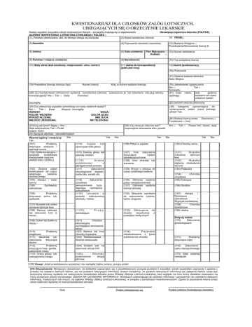 KWESTIONARIUSZ DLA CZŁONKÓW ZAŁÓG LOTNICZYCH, UBIEGAJĄCYCH SIĘ O ORZECZENIE LEKARSKIE Należy wypełnić wszystkie rubryki drukowanymi literami - szczegóły znajdują się w objaśnieniach GŁÓWNY INSPEKTORAT LOTNICTWA CYWILNEGO ( POLSKA ) (1)_Państwo członkowskie JAA, do którego ubiega się kandydat (2) Klasa świadectwa zdrowia Obowiązuje tajemnica lekarska (POUFNE). 1D PESEL: (12) Badania Wstępne □ Przedłużenie/Wznowienie licencji D (3)=Nazwisko: (4) Poprzednie nazwisko (nazwiska) (5) Imiona: (6) Data urodzenia:(7 Płeć Mężczyzna □ (13) Numer odniesienia Kobieta □ (8) Państwo i miejsce urodzenia: (9) Narodowość: (14) Typ pożądanej licencji (10) Stały adres (kod pocztowy, miejscowość, ulica, numer): £11 )Adres do korespondencji (jeżeli jest inny) 15) Zawód (podstawowy) (16) Pracownik (17) Ostatnie badanie lekarskie Data: Miejsce (18) Posiadana licencja lotnicza (typ) Numer licencji Kraj, w którym wydano licencję (20) czy kiedykolwiek odmówiono wydania, świadectwa zdrowia, zawieszono je lub odwołano decyzją władzy licencjonującej? Nie □ Tak □ Data: Państwo: (19) Jakiekolwiek ograniczenia Nie □ Tak □ Szczeaółv: godziny (21) Czas nalotu (22) wylatane od czasu ogólnego: ostatnich badań: Szczegóły: (23) samolot obecnie pilotowany (24) Czy zdarzył się wypadek samolotowy od czasu ostatnich badań? Nie □ Tak □ Data: Miejsce: Szczegóły: WZROST: WAGA: KOLOR WŁOSÓW: KOLOR OCZU: WYKSZTAŁCENIE: IMIE OJCA: MIEJSCE URODZENIA: NR TELEFONU: (25) kategoria uprawniająca do wykonywania zadań przez jednego pilota? Tak (27)Czy pali tytoń? Nigdy □ Nie □ Data zakończenia: Tak □ Podai rodzai i ilości29) Spożycie alkoholu - iednostki/tvdzień: Nie Wywiad ogólny i medyczny Tak (101) Problemy dotyczące widzenia / operacje oczne (102) Szkła korekcyjne / soczewki kontaktowe kiedykolwiek noszone (WARTOŚCI SZKIEŁ) (103) Zmiana szkieł korekcyjnych od czasu ostatniego badania okulistycznego (104) Alergia / katar sienny (105) Dychawica oskrzelowa (106) dotyczące zastawek (28) Czy stosuje obecnie leki? rozpoczęcia stosowania leku, powód Tak (107) Wysokie lub niskie ciśnienie tętnicze krwi (108) Kamica nerkowa lub obecność krwi w moczu Nie Tak (115) Zawroty głowy lub epizody omdleń (127) Inne zaburzenia dotyczące badań laboratoryjnych krwi (128) Inne choroby lub zranienia (151) W ysokie ciśnienie tętnicze krwi (152) W ysokie stężenie cholesterolu we krwi (153) Padaczka (116) Utrata przytomności z jakiegokolwiek powodu (117) Zaburzenia neurologiczne: drgawki, padaczka, paraliż etc. Próby (129) Wizyty u lekarza od czasu ostatniego badania (130) Odmowa wydania polisy ubezpieczeniowej (131) Odmowa wydania licencji lotniczej (132) Skazanie wyrokiem za wykroczenia cywilne, karne, drogowe (133) Odroczenie służby wojskowej powodów medycznych od z (134) Przyznanie odszkodowania z tytułu zranienia lub choroby Zawodowy □ Podać leki, dawki, datę (150) Choroby serca (121) Choroba lokomocyjna wymagająca stosowania leków (122) Malaria lub inne choroby tropikalne (123) Niedokrwistość / Anemia sierpowata (110) Problemy żołądkowe (111) Głuchota lub zaburzenia dotyczące słuchu (112) Problemy dotyczące nosa, gardła, zaburzenia mowy (113) Urazy głowy lub wstrząśnienia mózgu Tak Tak □ (126) Pobyt w szpitalu (120) samobójcze (109) Cukier lub białko w moczu Nie Nie □ (114) Częste lub uporczywe bóle głowy (118) Zaburzenia umysłowe jakiegokolwiek typu, depresja, nadmierna pobudliwość ( 119 ) L ecze nie z powodu nadużywania alkoholu / leków Problemy serca lub (26) Rodzaj licencji pilota Turystyczny □ Inny: Nie (154) Choroba umysłowa (155) Cukrzyca (156) Gruźlica (157) Alergia / Dychawica oskrzelowa / Wyprysk kontaktowy (158) Choroby dziedziczne (159) Jaskra Dotyczy kobiet (170) Zaburzenia ginekologiczne (171) Problemy dotyczące ciąży (124) Dodatni test na obecność wirusa HIV (172) Zaburzenia cyklu miesiączkowego (125) Choroby przenoszone drogą płciową (173) Data ostatniej miesiączki I (30) Uwagi: Jeżeli przedstawiono wcześniej i nie nastąpiły żadne zmiany, proszę podać. (31) Oświadczenie: Niniejszym oświadczam, że dokładnie zapoznałem się z przedstawionymi powyżej punktami i wszystkie rubryki wypełniłem poprawnie i zgodnie z prawdą nie zataiłem żadnych faktów, ani nie podałem fałszywych informacji Jestem świadomy, że podanie fałszywych informacji lub zatajenie faktów może być przyczyną odmowy wydania lub wstrzymania świadectwa zdrowia przez Władzę (Sekcja Lotniczo-Lekarska), bez względu na inne formy działania stosowane na mocy przepisów prawa narodowego. ZGODA NA UZYSKANIE INFORMACJI: Niniejszym zobowiązuję się udzielać informacji i upoważniam do udzielania dalszych informacji, medycznych lub innych, na żądanie Władzy (Sekcji Lotniczo-Lekarskiej), w związku z powyższym kwestionariuszem. Zgoda ta pozostanie ważna przez okres ważności wydanej mi licencji/świadectwa zdrowia: Data Podpis ubiegającego się Podpis Lekarza Orzekającego (świadka)