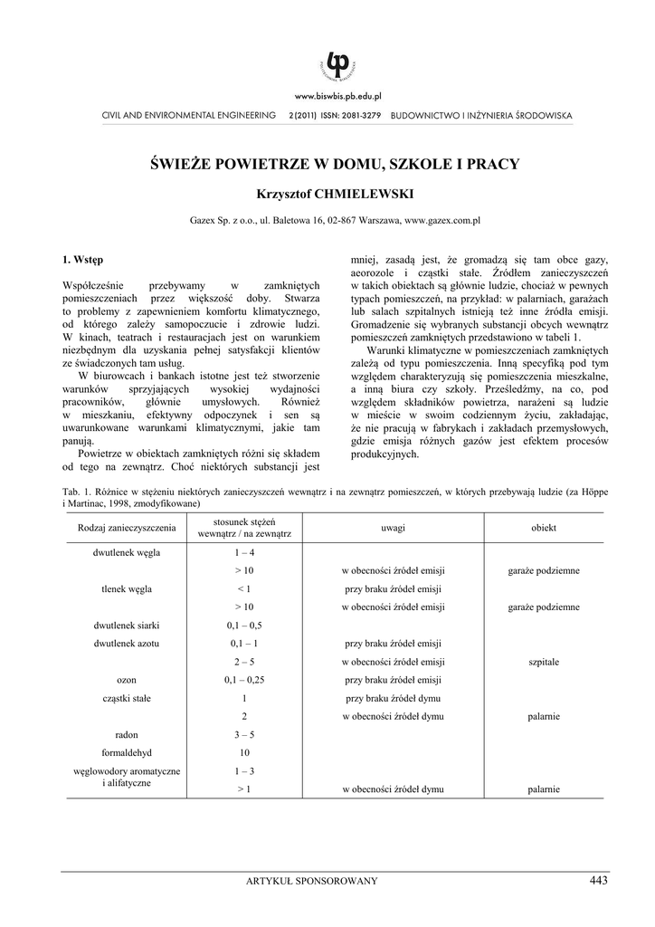 ŚWIEŻE POWIETRZE W DOMU, SZKOLE I PRACY Krzysztof CHMIELEWSKI Gazex Sp. z o.o., ul. Baletowa 16, 02-867 Warszawa, www.gazex.com.pl 1. Wstęp Współcześnie przebywamy w zamkniętych pomieszczeniach przez większość doby. Stwarza to problemy z zapewnieniem komfortu klimatycznego, od którego zależy samopoczucie i zdrowie ludzi. W kinach, teatrach i restauracjach jest on warunkiem niezbędnym dla uzyskania pełnej satysfakcji klientów ze świadczonych tam usług. W biurowcach i bankach istotne jest też stworzenie warunków sprzyjających wysokiej wydajności pracowników, głównie umysłowych. Również w mieszkaniu, efektywny odpoczynek i sen są uwarunkowane warunkami klimatycznymi, jakie tam panują. Powietrze w obiektach zamkniętych różni się składem od tego na zewnątrz. Choć niektórych substancji jest mniej, zasadą jest, że gromadzą się tam obce gazy, aeorozole i cząstki stałe. Źródłem zanieczyszczeń w takich obiektach są głównie ludzie, chociaż w pewnych typach pomieszczeń, na przykład: w palarniach, garażach lub salach szpitalnych istnieją też inne źródła emisji. Gromadzenie się wybranych substancji obcych wewnątrz pomieszczeń zamkniętych przedstawiono w tabeli 1. Warunki klimatyczne w pomieszczeniach zamkniętych zależą od typu pomieszczenia. Inną specyfiką pod tym względem charakteryzują się pomieszczenia mieszkalne, a inną biura czy szkoły. Prześledźmy, na co, pod względem składników powietrza, narażeni są ludzie w mieście w swoim codziennym życiu, zakładając, że nie pracują w fabrykach i zakładach przemysłowych, gdzie emisja różnych gazów jest efektem procesów produkcyjnych. Tab. 1. Różnice w stężeniu niektórych zanieczyszczeń wewnątrz i na zewnątrz pomieszczeń, w których przebywają ludzie (za Höppe i Martinac, 1998, zmodyfikowane) Rodzaj zanieczyszczenia stosunek stężeń wewnątrz / na zewnątrz dwutlenek węgla 1–4 tlenek węgla uwagi obiekt > 10 w obecności źródeł emisji garaże podziemne <1 przy braku źródeł emisji > 10 w obecności źródeł emisji garaże podziemne dwutlenek siarki 0,1 – 0,5 dwutlenek azotu 0,1 – 1 przy braku źródeł emisji 2–5 w obecności źródeł emisji ozon 0,1 – 0,25 przy braku źródeł emisji cząstki stałe 1 przy braku źródeł dymu 2 w obecności źródeł dymu palarnie w obecności źródeł dymu palarnie radon 3–5 formaldehyd 10 węglowodory aromatyczne i alifatyczne 1–3 >1 ARTYKUŁ SPONSOROWANY szpitale 443 Civil and Environmental Engineering / Budownictwo i Inżynieria Środowiska 2 (2011) 443-447 wysokie, oczywiście pod warunkiem przestrzegania tych norm przez producentów. 2. Mieszkanie W pomieszczeniach mieszkalnych istnieje wiele źródeł emisji gazów. Najważniejszym źródłem jest człowiek, który podczas oddychania wytwarza dwutlenek węgla (CO2). Gaz ten jest naturalnym składnikiem powietrza. Jego stężenie w atmosferze ziemskiej wynosi około 400 ppm (parts per milion, części na milion) czyli 0,04% objętościowo. W pomieszczeniach, w których przebywają ludzie, stężenie CO2 szybko wzrasta do około 1000 ppm, a nawet powyżej. Oprócz dwutlenku węgla, w powietrzu w pomieszczeniach mieszkalnych może występować również tlenek węgla, śmiertelnie trujący gaz będący produktem niepełnego spalania. Jego źródłem mogą być piece węglowe, niesprawne termy i kuchnie gazowe, kominki, a także dym papierosowy. Oczywiście, tlenek węgla rzadko kiedy osiąga w mieszkaniach poziom zagrażający wprost życiu. Jednak efekty działania tego gazu mogą się kumulować, a więc tlenek węgla występujący nawet w niewielkim stężeniu może być szkodliwy w dłuższej skali czasowej. Dodatkowo, istnieje współzależność między poziomem dwutlenku węgla i toksycznym działaniem tlenku węgla. Częstość oddechów człowieka zależy od wielu czynników, w tym od poziomu dwutlenku węgla w powietrzu. Ośrodek oddechowy jest stymulowany wyższym stężeniem tego gazu. W efekcie, w pomieszczeniu zamkniętym, w którym gromadzi się CO2 i jednocześnie występuje tlenek węgla, na przykład w kuchni czy w łazience, intensywność oddechowa jest wzmagana, co prowadzi do szybszego wchłaniania toksycznego CO i kumulacji negatywnych dla zdrowia skutków. Trzeba pamiętać, że zagrożenie od strony połączonego działania CO2 i CO nie ogranicza się tylko do mieszkań z termami i kuchniami gazowymi, z reguły starszymi i źle wentylowanymi. Ten sam problem może wystąpić w nowoczesnych domach i mieszkaniach, nawet jeśli ogrzewanie budynku jest centralne, a zasilanie kuchni elektryczne. Częstym problemem w takich obiektach jest podwyższony poziom dwutlenku węgla wydzielającego się ze ścian. Zjawisko to jest związane z „dojrzewaniem” świeżych tynków i innych składników ścian, w wyniku którego dochodzi do powstawania CO2. W nowych pomieszczeniach mieszkalnych przez pierwsze kilka lat obserwuje się wysokie stężenie dwutlenku węgla wynoszące nawet 2000 ppm w pomieszczeniach nie wietrzonych i około 800 ppm w pomieszczeniach wietrzonych, nawet jeśli nie przebywają tam ludzie stanowiący z reguły główne źródło tego gazu. Dwutlenek węgla w takich stężeniach powoduje u ludzi uczucie zmęczenia, a nawet bóle głowy, natomiast w połączeniu z tlenkiem węgla pochodzącym np. z kominków lub dymu papierosowego, poprzez kumulację szkodliwych efektów działania tego ostatniego gazu, może prowadzić do pogorszenia stanu zdrowia w dłuższym okresie. Oprócz dwutlenku węgla i tlenku węgla, powietrze w pomieszczeniach mieszkalnych może też zawierać inne szkodliwe gazy, pochodzące na przykład z impregnatów stosowanych przy produkcji mebli, powłok lakierniczych i farb, itp. Jednak obecne normy dotyczące tych substancji są na tyle ostre, że ryzyko z nimi związane nie jest bardzo 444 3. Garaż podziemny Głównymi składnikami spalin silników benzynowych są tlenek i dwutlenek węgla