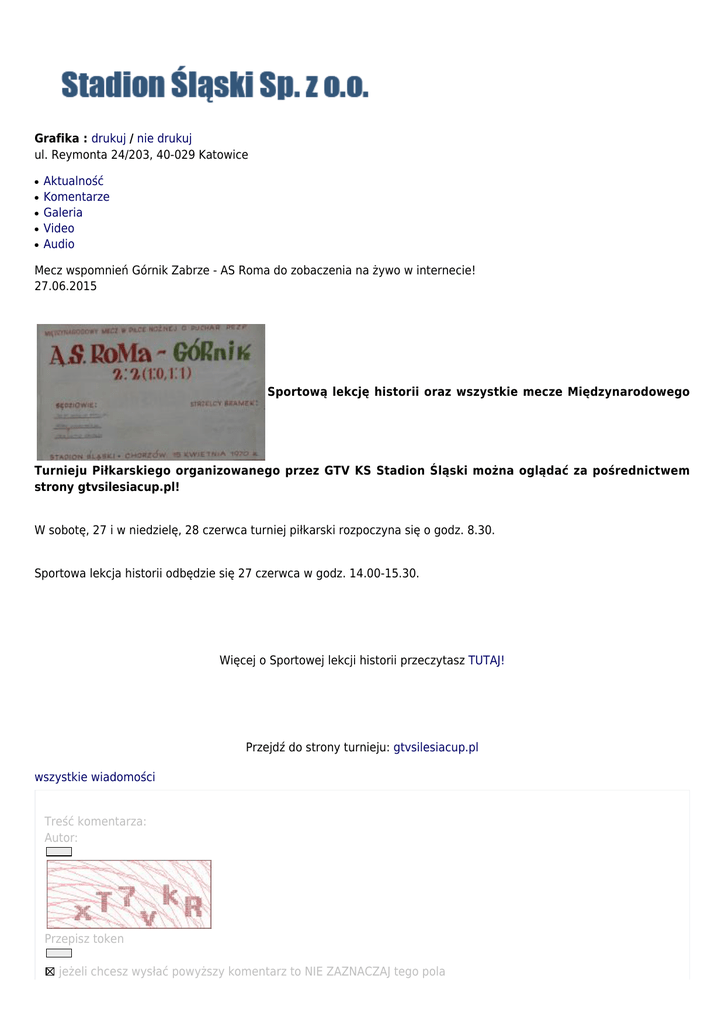 Grafika : drukuj / nie drukuj ul. Reymonta 24/203, 40-029 Katowice ● ● ● ● ● Aktualność Komentarze Galeria Video Audio Mecz wspomnień Górnik Zabrze - AS Roma do zobaczenia na żywo w internecie! 27.06.2015 Sportową lekcję historii oraz wszystkie mecze Międzynarodowego Turnieju Piłkarskiego organizowanego przez GTV KS Stadion Śląski można oglądać za pośrednictwem strony gtvsilesiacup.pl! W sobotę, 27 i w niedzielę, 28 czerwca turniej piłkarski rozpoczyna się o godz. 8.30. Sportowa lekcja historii odbędzie się 27 czerwca w godz. 14.00-15.30. Więcej o Sportowej lekcji historii przeczytasz TUTAJ! Przejdź do strony turnieju: gtvsilesiacup.pl wszystkie wiadomości Treść komentarza: Autor: Przepisz token jeżeli chcesz wysłać powyższy komentarz to NIE ZAZNACZAJ tego pola dodaj komentarz