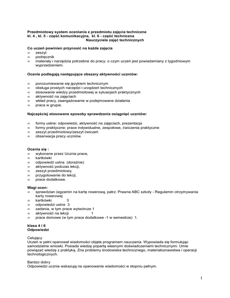 Przedmiotowy system oceniania z przedmiotu zajęcia techniczne kl. 4 , kl. 5 - część komunikacyjna, kl. 6 - część techniczna Nauczyciele zajęć technicznych Co uczeń powinien przynosić na każde zajęcia • zeszyt • podręcznik • materiały i narzędzia potrzebne do pracy: o czym uczeń jest powiadamiany z tygodniowym wyprzedzeniem. Ocenie podlegają następujące obszary aktywności uczniów: • • • • • • porozumiewanie się językiem technicznym obsługa prostych narzędzi i urządzeń technicznych stosowanie wiedzy przedmiotowej w sytuacjach praktycznych aktywność na zajęciach wkład pracy, zaangażowanie w podejmowane działania praca w grupie. Najczęściej stosowane sposoby sprawdzania osiągnięć uczniów: • • • • formy ustne: odpowiedzi, aktywność na zajęciach, prezentacja formy praktyczne: prace indywidualne, zespołowe, ćwiczenia praktyczne zeszyt przedmiotowy/zeszyt ćwiczeń obserwacja pracy uczniów. Ocenia się : • wykonane przez Ucznia prace, • kartkówki • odpowiedź ustna (doraźnie) • aktywność podczas lekcji, • zeszyt przedmiotowy, • przygotowanie do lekcji, • prace dodatkowe. Wagi ocen: • sprawdzian (egzamin na kartę rowerową, patrz: Prawne ABC szkoły - Regulamin otrzymywania karty rowerowej • kartkówki 3 • odpowiedzi ustne 3 • zadania, w tym prace wytwórcze 1 • aktywność na lekcji 1 • prace domowe (w tym prace dodatkowe -1 w semestrze) 1. klasa 4 i 6 Odpowiedzi Celujący Uczeń w pełni opanował wiadomości objęte programem nauczania. Wypowiada się formułując samodzielne wnioski. Posiada wiedzę popartą własnymi doświadczeniami technicznymi. Umie powiązać wiedzę z praktyką. Zna problemy środowiska technicznego, materiałoznawstwa i operacji technologicznych. Bardzo dobry Odpowiedzi ucznia wskazują na opanowanie wiadomości w stopniu pełnym. 1 Swobodnie operuje poznanymi pojęciami. Bardzo dobrze opanował treści z materiałoznawstwa, środowiska technicznego i operacji technologicznych. Dobry Odpowiedzi wskazują na przyswojenie większości wymaganych treści. Opanował wiedzę z zakresu materiałoznawstwa, operacji technologicznych i środowiska technicznego w stopniu dobrym. Poprawnie używa języka, popełnia nieliczne błędy merytoryczne. Dostateczny Uczeń zna tylko nieliczne treści, często wspomaga swoja wypowiedź tekstem. Jego wypowiedzi są chaotyczne, niespójne. Mimo ukierunkowania w wypowiedzi jest szereg błędów rzeczowych i językowych. Jego wiedza z zakresu materiałoznawstwa, środowiska technicznego, operacji technologicznych jest niepełna. Dopuszczający Uczeń ma duże braki z zakresu treści przyswajanych. Podczas wypowiedz popełnia liczne błędy merytoryczne, Często udziela odpowiedzi z pomocą nauczyciela. Treści z zakresu środowiska technicznego, materiałoznawstwa i operacji technologicznych jest niepełna, wymaga wsparcia ze strony nauczyciela. Niedostateczny Nie opanował podstaw wiedzy dotyczących środowiska technicznego, materiałoznawstwa i operacji technologicznych. Kryteria oceny semestralnej i końcowej Celujący Uczeń opanował treści programowe w pełnym zakresie. Samodzielnie i w twórczy sposób rozwiązuje zadane problemy. Biegle posługuje się zdobytymi wiadomościami .Wykorzystuje wiedzę z techniki na innych przedmiotach oraz wykorzystuje ją w praktyce. Proponuje rozwiązania nietypowe. Wiedzę z zakresu środowiska technicznego, materiałoznawstwa i operacji technologicznych opanował w pełnym stopniu. Bardzo dobry Uczeń opanował pełny zakres wiedzy i umiejętności określony programem nauczania. Samodzielnie posługuje się zdobytymi wiadomościami, rozwiązuje problemy teoretyczne i praktyczne ujęte programem nauczania, potrafi zastosować posiadaną wiedzę do rozwiązywania zadań i problemów w nowych sytuacjach. Prawidłowo rozwiązuje praktyczne zadania techniczne. Wiedzę z zakresu środowiska technicznego, operacji technologicznych i materiałoznawstwa opanował w pełnym stopniu. Dobry Uczeń przyswoił większość treści objętych programem. Poprawnie stosuje wiadomości, rozwiązuje samodzielnie typowe zadania teoretyczne i praktyczne. Estetycznie wykonuje rysunki i prace. Wiedzę z zakresu środowiska technicznego ,materiałoznawstwa i operacji technologicznych opanował w stopniu dobrym i umiejętnie ją wykorzystuje w praktycznych działaniach. Dostateczny Uczeń nie opanował w pełni określonych treści wynikających z programu nauczania. Rozwiązuje typowe zadania teoretyczne i praktyczne o średnim stopniu trudności. Stosuje się do zasad obowiązujących na lekcjach techniki. W zakresie stosowania wiedzy w praktyce potrzebuje dodatkowej pomocy nauczyciela. Dopuszczający Uczeń ma problemy z opanowaniem podstaw programowych. Wykazuje brak samodzielności podczas rozwiązywania problemów. Nie wykonuje zadań zgodnie z ustalonymi zasadami. Z zakresu materiałoznawstwa, środowiska technicznego i operacji technologicznych nie opanował w pełni wiedzy teoretycznej jak i praktycznej. 2 Niedostateczny Uczeń nie opanował wiadomości określonych programem nauczania, a braki w wiadomościach i umiejętnościach uniemożliwiają mu dalsze zdobywanie wiedzy z tego przedmiotu. Nie jest w stanie rozwiązać(wykonać) zadań o niewielkim stopniu trudności. Po ukończeniu klasy 4 uczeń: • opisuje urządzenia techniczne ze swojego otoczenia ,wyróżnia ich funkcje, potrafi wskazać ich wady i zalety • zna zasady bhp obowiązujące na technice i w najbliższym otoczeniu ucznia • rozumie treść piktogramów w szkole i w otoczeniu( w tym regulujące podstawy bezpieczeństwa) • opracowuje koncepcje rozwiązań problemów technicznych • rozpoznaje materiały konstrukcyjne - papier, materiały drzewne, materiały włókiennicze • potrafi w prosty sposób zbadać i określić ich właściwości • określa możliwości wykorzystania różnych materiałów w technice w zależności od ich wł