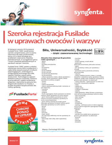 Szeroka rejestracja Fusilade w uprawach owoców i warzyw W bieżącym sezonie 2016 preparat Fusilade Forte 150EC został bardzo szeroko zarejestrowany. Jest to ważna informacja dla wielu producentów, którzy na co dzień borykają się z problemem zwalczania chwastów jednoliściennych, w szczególności perzu i innych chwastów jednoliściennych w uprawach warzyw i owoców. Fusilade Forte 150EC zawiera unikalną substancję czynną, która w połączeniu z najbardziej zaawansowanymi środkami wspomagającymi, zamkniętymi w zintegrowanej technologii ISO-LINK, zapewni Państwu zawsze pełną skuteczność. Technologia ta zapewni dokładne pokrycie chwastów, doskonałą przyczepność, szybkie wchłanianie preparatu, równomierne pokrycie liści, długotrwałe działanie na chwasty a przede wszystkim bezpieczeństwo dla rośliny uprawnej. Aktualna lista obejmuje 80 gatunków roślin uprawnych : - agrest - bobik - borówka amerykańska - bób - brzoskwinia - brukiew - burak ćwikłowy - burak cukrowy - burak liściowy (botwinka) - burak pastewny - cebula uprawiana z siewu, cebula uprawiana z rozsady, cebula uprawiana z dymki, cebula uprawiana na zielony szczypior - chmiel - chrzan - cykoria korzeniowa - cykoria sałatowa (odmiany białe i czerwone, w tym Radicchio) - czereśnia - czosnek - endywia - fasola szparagowa, fasola uprawiana na świeże nasiona, fasola uprawiana na suche nasiona - groch siewny jadalny uprawiany na suche nasiona oraz groch pastewny uprawiany na suche nasiona (peluszka) - groch zielony cukrowy (na strąki), groch zwyczajny uprawiany na świeże nasiona, groch zwyczajny uprawiany na suche nasiona - grusza - gryka - jarmuż - jeżyna - karczoch - koper włoski - len zwyczajny włóknisty oraz len uprawiany na nasiona - łubin biały, łubin żółty, łubin wąskolistny - mak - malina - marchew - morela - orzech laskowy, orzech włoski - pasternak pietruszka korzeniowa, pietruszka naciowa - pigwa - por uprawiany z siewu, por uprawiany z rozsady - porzeczka czarna, porzeczka czerwona, porzeczka biała - rabarbar - rośliny ozdobne (roczne z siewu i z rozsady, dwuletnie i wieloletnie, byliny ogrodowe, krzewy ozdobne), szkółki roślin ozdobnych uprawiane w gruncie, pod osłonami i w szklarniach - rośliny zielarskie – wykorzystanie na zioła oraz na korzeń i do parzenia naparów - rzepa - rzepak jary - rzepak ozimy - rzodkiew, rzodkiewka - salsefia - sałata głowiasta, sałata liściowa z przeznaczeniem do konsumpcji, plantacje nasienne sałaty - seler korzeniowy - seler naciowy - słonecznik - soja - szalotka - szczypiorek - szparag – odchwaszczanie w trakcie wegetacji oraz po zbiorze wypustek szparagowych (łodyg jadalnych) - szpinak - śliwa - truskawka - wierzba oraz szkółki leśne uprawiane w gruncie, pod osłonami i w szklarniach - winorośl - wiśnia - ziemniak - żurawina Więcej o Technologii ISO-LINK: http://www3.syngenta.com/country/pl/pl/produty/scp/herbicydy/Pages/fusilade_forte_150_ec.aspx Strona 1/1