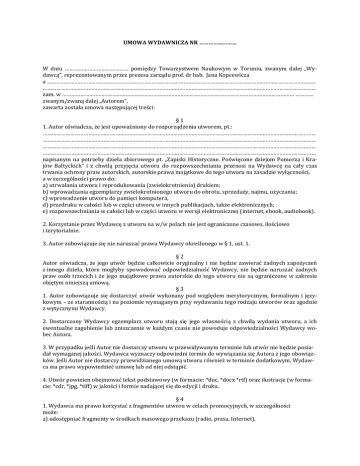 UMOWA WYDAWNICZA NR …………………… W dniu …………………………………… pomiędzy Towarzystwem Naukowym w Toruniu, zwanym dalej „Wydawcą”, reprezentowanym przez prezesa zarządu prof. dr hab. Jana Kopcewicza a …………………………………………………………………………………………………………………………………………………………… ……………………………………………………………………………………………………………………………………………………………… zam. w ……………………………………………………………………………………………………………………………………… ………… zwanym/zwaną dalej „Autorem”, zawarta została umowa następującej treści: §1 1. Autor oświadcza, że jest upoważniony do rozporządzenia utworem, pt.: ……………………………………………………………………………………………………………………………………………………………… ……………………………………………………………………………………………………………………………………………………………… ……………………………………………………………………………………………………………………………………………………………… ……………………………………………………………………………………………………………………………………………………………… napisanym na potrzeby dzieła zbiorowego pt. „Zapiski Historyczne. Poświęcone dziejom Pomorza i Krajów Bałtyckich” i z chwilą przyjęcia utworu do rozpowszechniania przenosi na Wydawcę na cały czas trwania ochrony praw autorskich, autorskie prawa majątkowe do tego utworu na zasadzie wyłączności, a w szczególności prawo do: a) utrwalania utworu i reprodukowania (zwielokrotnienia) drukiem; b) wprowadzania egzemplarzy zwielokrotnionego utworu do obrotu, sprzedaży, najmu, użyczania; c) wprowadzenie utworu do pamięci komputera, d) przedruku w całości lub w części utworu w innych publikacjach, także elektronicznych; e) rozpowszechniania w całości lub w części utworu w wersji elektronicznej (internet, ebook, audiobook). 2. Korzystanie przez Wydawcę z utworu na w/w polach nie jest ograniczone czasowo, ilościowo i terytorialnie. 3. Autor zobowiązuje się nie naruszać prawa Wydawcy określonego w § 1, ust. 1. §2 Autor oświadcza, że jego utwór będzie całkowicie oryginalny i nie będzie zawierać żadnych zapożyczeń z innego dzieła, które mogłyby spowodować odpowiedzialność Wydawcy, nie będzie naruszać żadnych praw osób trzecich i że jego majątkowe prawa autorskie do tego utworu nie są ograniczone w zakresie objętym niniejszą umową. §3 1. Autor zobowiązuje się dostarczyć utwór wykonany pod względem merytorycznym, formalnym i językowym – ze starannością i na poziomie wymaganym przy wydawaniu tego rodzaju utworów oraz zgodnie z wytycznymi Wydawcy. 2. Dostarczony Wydawcy egzemplarz utworu stają się jego własnością z chwilą wydania utworu, a ich ewentualne zagubienie lub zniszczenie w każdym czasie nie powoduje odpowiedzialności Wydawcy wobec Autora. 3. W przypadku jeśli Autor nie dostarczy utworu w przewidywanym terminie lub utwór nie będzie posiadał wymaganej jakości, Wydawca wyznaczy odpowiedni termin do wywiązania się Autora z jego obowiązków. Jeśli Autor nie dostarczy przewidzianego umową utworu również w terminie dodatkowym, Wydawca ma prawo wypowiedzieć umowę lub od niej odstąpić. 4. Utwór powinien obejmować tekst podstawowy (w formacie: *doc, *docx *rtf) oraz ilustracje (w formacie: *cdr, *jpg, *tiff) w jakości i formie nadającej się do edycji i druku. §4 1. Wydawca ma prawo korzystać z fragmentów utworu w celach promocyjnych, w szczególności może: a) udostępniać fragmenty w środkach masowego przekazu (radio, prasa, Internet), c) publikować we fragmentach w broszurach udostępnianych nieodpłatnie, d) cytować w reklamie. 2. Z zastrzeżeniem obowiązku wydania utworu Wydawca jest uprawniony do udzielenia osobom trzecim licencji w zakresie objętym niniejszą umową. §5 Wydawca zapewnia dystrybucję opublikowanego utworu. §6 Cenę jednostkową egzemplarza utworu i wielkość nakładu w poszczególnych wydaniach oraz sposób wydania ustala Wydawca. §7 1. Autor przenosi na Wydawcę autorskie prawo majątkowe i korzystanie z utworu w wymienionych w § 1 polach eksploatacji nieodpłatnie. 2. W razie wykorzystania utworu na innym polu eksploatacji niż wymienione w § 1, ust. 1 strony ustalą za nie odrębne honorarium. §8 Autor nieodpłatnie: a) napisze i dostarczy utwór w umówionej postaci, b) przeniesie autorskie praw majątkowych na Wydawcę w zakresie ustalonym tą umową, c) wykona korektę autorską. §9 Wydawca ma prawo dokonania koniecznych zmian utworu, wynikających z opracowania redakcyjnego. § 10 1. Wykonanie korekty autorskiej oraz zwrot całości utworu po korekcie powinny nastąpić w terminie obliczonym według zasady: dzień na jeden arkusz wydawniczy, licząc od dostarczenia tekstu do korekty Autorowi lub osobie przez niego upoważnionej. 2. Odmowa dokonania korekty autorskiej lub nie odesłanie korekty w terminie wyżej określonym uważa się za udzielenie przez Autora zgody na wydanie utworu w postaci przesłanej do korekty. 3. Autor ponosi koszty zawinionych przez siebie zmian dokonanych w utworze po rozpoczęciu składania, jeżeli spowodują one zwiększenie kosztów składania o ponad 3%. § 11 Autor otrzyma bezpłatnie 1 egzemplarz autorski dzieła zbiorowego, nadbitkę drukowaną i elektroniczną nadbitkę własnego utworu nieprzeznaczoną do sprzedaży i rozpowszechniania. § 12 1. Autor upoważnia Wydawcę do wznawiania (dokonywania