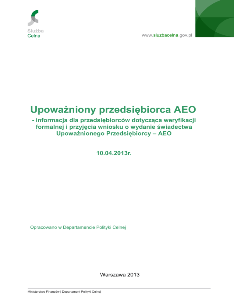www.sluzbacelna.gov.pl UpowaŜniony przedsiębiorca AEO - informacja dla przedsiębiorców dotycząca weryfikacji formalnej i przyjęcia wniosku o wydanie świadectwa UpowaŜnionego Przedsiębiorcy – AEO 10.04.2013r. Opracowano w Departamencie Polityki Celnej Warszawa 2013 Ministerstwo Finansów | Departament Polityki Celnej CZĘŚĆ I: WSTĘP 1. Podstawa prawna Rozporządzeniem (WE) Nr 648/2005 Parlamentu Europejskiego i Rady z dnia 13 kwietnia 2005r. zmieniającym rozporządzenie Rady (EWG) nr 2913/92 ustanawiające Wspólnotowy Kodeks Celny1, zwany dalej „WKC” wprowadzona została do porządku prawnego Unii Europejskiej instytucja UpowaŜnionego Przedsiębiorcy (ang. Authorised Economic Operator – AEO)2). Zgodnie z art. 5a ust. 1 WKC, jeŜeli zajdzie taka potrzeba, organy celne po zasięgnięciu opinii innych właściwych organów, przyznają, z uwzględnieniem kryteriów przewidzianych w ust. 2, przedsiębiorcy mającemu siedzibę na obszarze celnym Wspólnoty3) status upowaŜnionego przedsiębiorcy. Stosownie do art. 5a ust. 1 akapit 2 i 3 WKC upowaŜniony przedsiębiorca korzysta z ułatwień odnoszących się do kontroli celnej dotyczącej bezpieczeństwa i ochrony i/lub z uproszczeń przewidzianych w ramach przepisów celnych. Z zastrzeŜeniem zasad i warunków określonych w ust. 2, status upowaŜnionego przedsiębiorcy jest uznawany przez organy celne wszystkich Państw Członkowskich bez uszczerbku dla kontroli celnej. Biorąc za podstawę uznanie statusu upowaŜnionego przedsiębiorcy oraz, o ile spełniono wymogi związane z konkretnym rodzajem uproszczenia przewidzianego w prawodawstwie celnym Wspólnoty, organy celne upowaŜniają przedsiębiorcę do korzystania z tego uproszczenia. Katalog kryteriów i warunków przyznawania statusu upowaŜnionego przedsiębiorcy określony został w: – art. 5a ust. 2 akapit pierwszy WKC oraz – art. 14h – 14k rozporządzenia Komisji (EWG) nr 2454/93 z dnia 2 lipca 1993r. ustanawiającego przepisy w celu wykonania rozporządzenia Rady (EWG) nr 2913/92 ustanawiającego Wspólnotowy Kodeks Celny4, zwanego dalej „Rozporządzeniem Wykonawczym”. 1 Dz. Urz. UE L117 z 4.05.2005, s. 13 2) Wspólnotowy Kodeks Celny posługuje się tłumaczeniem „upowaŜniony podmiot gospodarczy”, natomiast w Rozporządzeniu Wykonawczym zwrot „authorised economic operator” został przetłumaczony jako „upowaŜniony przedsiębiorca”; w „Wytycznych” zastosowane zostało pojęcie „upowaŜniony przedsiębiorca”. 3) Przepisy Rozporządzenia Wykonawczego określają przypadki, w jakich warunek posiadania siedziby we Wspólnocie nie jest wymagany. 4 Dz. Urz. WE L 253 z 11.10.1993, str. 1, z późn. zm.; Dz. Urz. UE Polskie wydanie specjalne, rozdz. 2, t. 6, str. 3 2 www.sluzbacelna.gov.pl Zasady dotyczące prowadzenia postępowania w sprawie wydania świadectwa AEO wyznaczone zostały w: a) ustawie o SłuŜbie Celnej5 rozdział 4, b) rozporządzeniu Ministra Finansów z dnia 23 marca 2010 r. w sprawie zakresu, rodzaju i sposobu przeprowadzania czynności audytowych 6, c) rozporządzeniu Ministra Finansów z dnia 23 marca 2010 r. w sprawie sposobu dokumentowania czynności audytowych oraz wzorów dokumentów stosowanych w postępowaniu audytowym 7, d) ustawie – Ordynacja podatkowa8, e) ustawie Prawo celne9. Tryb wydawania świadectwa AEO (np. forma świadectwa, termin wydania świadectwa, odrzucenie wniosku, itp.) oraz reguły odnoszące się do zawieszania i cofania świadectw określone zostały w art. 14c do 14v Rozporządzenia Wykonawczego. Potwierdzeniem uzyskania przez przedsiębiorcę statusu upowaŜnionego przedsiębiorcy jest wydane przez organ SłuŜby Celnej „Świadectwo UpowaŜnionego Przedsiębiorcy (Świadectwo AEO)”. Przepisy Rozporządzenia Wykonawczego w art. 14a ust. 1 przewidują trzy rodzaje Świadectw AEO: - Świadectwo AEOC – Uproszczenia Celne, - Świadectwo AEOS – Bezpieczeństwo i Ochrona, - Świadectwo AEOF – Uproszczenia Celne/Bezpieczeństwo i Ochrona. Świadectwo AEO – Uproszczenia Celne wydawane jest przedsiębiorcom spełniającym kryteria, o których mowa w art. 14h – 14j Rozporządzenia Wykonawczego. Pozostałe dwa rodzaje świadectw wydawane są przedsiębiorcom, którzy spełniają warunki określone w art. 14h – 14k tego rozporządzenia, z jednym wyjątkiem dotyczącym przedsiębiorców ubiegających się o świadectwo AEOS, w stosunku do których wyłączony jest obowiązek spełnienia kryterium, 5 Ustawa z dnia 27 sierpnia 2009 r. – o SłuŜbie Celnej (Dz. U. Nr 168, poz. 1323, z późn. zm.). 6 Rozporządzenie Ministra Finansów z dnia 23 marca 2010 r. w sprawie zakresu, rodzaju i sposobu przeprowadzania czynności audytowych (Dz. U. Nr 52, poz. 309), 7 Rozporządzenie Ministra Finansów z dnia 23 marca 2010 r. w sprawie sposobu dokumentowania czynności audytowych oraz wzorów dokumentów stosowanych w postępowaniu audytowym (Dz. U. z 2013 r. poz. 150) 8 Ustawa z dnia 29 sierpnia 1997 r. – Ordynacja podatkowa (tekst jednolity: Dz. U. z 2005 r. Nr 8, poz. 60, z późn. zm.), 9 Ustawa z dnia 19 marca 2004 r. – Prawo celne (Dz. U. Nr 68, poz. 622 z późn. zm.) 3 www.sluzbacelna.gov.pl o którym mowa w art. 14i lit. c), tj. warunek posiadania systemu logistycznego rozróŜniającego towary wspólnotowe i niewspólnotowe. 2. Kto moŜe ubiegać się o status AEO? O status AEO moŜe ubiegać się przedsiębiorca, o którym mowa w art. 1 ust. 12 Rozporządzenia Wykonawczego, tj. osoba, która w ramach prowadzonej działalności gospodarczej jest włączona w czynności określone przepisami prawa celnego. Podkreślić naleŜy, iŜ definicja „przedsiębiorcy” nie ogranicza pojęcia „włączenie w czynności określone przepisami prawa celnego” jedynie do bezpośredniego włączenia, np. do sytuacji, gdy mamy do czynienia z Importerem, Eksporterem lub Agentem Celnym. O status AEO moŜe ubiegać się np. Producent wytwarzający towary przeznaczone do wywozu, nawet jeŜeli fo