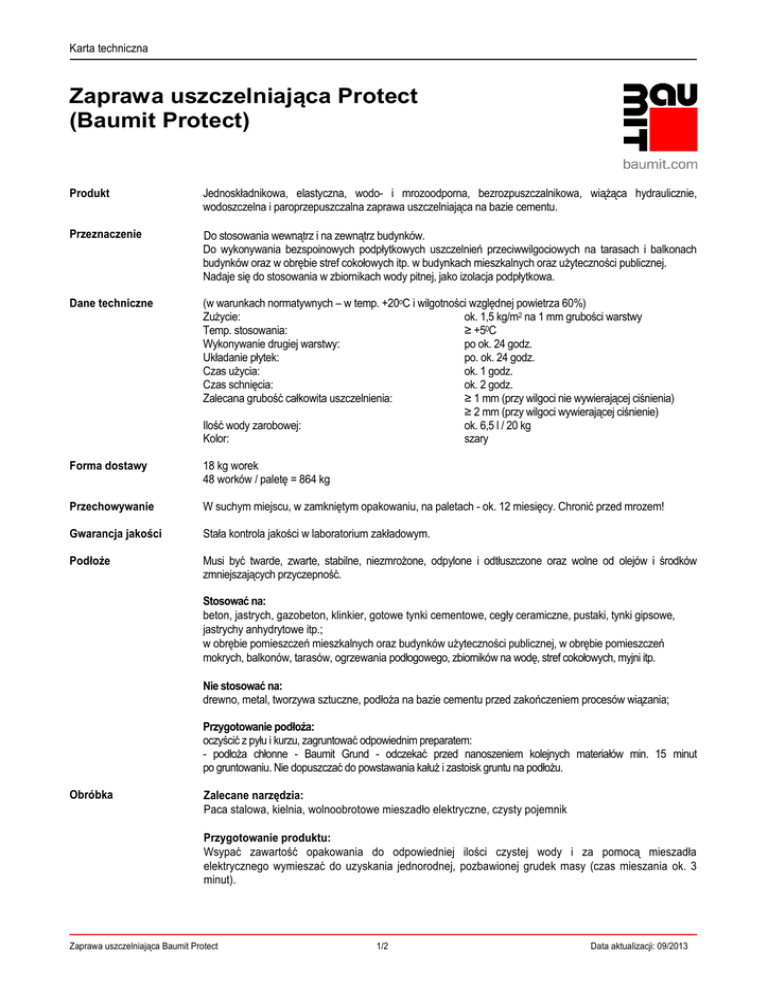 Karta techniczna Zaprawa uszczelniająca Protect (Baumit Protect) Produkt Jednoskładnikowa, elastyczna, wodo- i mrozoodporna, bezrozpuszczalnikowa, wiążąca hydraulicznie, wodoszczelna i paroprzepuszczalna zaprawa uszczelniająca na bazie cementu. Przeznaczenie Do stosowania wewnątrz i na zewnątrz budynków. Do wykonywania bezspoinowych podpłytkowych uszczelnień przeciwwilgociowych na tarasach i balkonach budynków oraz w obrębie stref cokołowych itp. w budynkach mieszkalnych oraz użyteczności publicznej. Nadaje się do stosowania w zbiornikach wody pitnej, jako izolacja podpłytkowa. Dane techniczne (w warunkach normatywnych – w temp. +20oC i wilgotności względnej powietrza 60%) Zużycie: ok. 1,5 kg/m2 na 1 mm grubości warstwy Temp. stosowania: ≥ +50C Wykonywanie drugiej warstwy: po ok. 24 godz. Układanie płytek: po. ok. 24 godz. Czas użycia: ok. 1 godz. Czas schnięcia: ok. 2 godz. Zalecana grubość całkowita uszczelnienia: ≥ 1 mm (przy wilgoci nie wywierającej ciśnienia) ≥ 2 mm (przy wilgoci wywierającej ciśnienie) Ilość wody zarobowej: ok. 6,5 l / 20 kg Kolor: szary Forma dostawy 18 kg worek 48 worków / paletę = 864 kg Przechowywanie W suchym miejscu, w zamkniętym opakowaniu, na paletach - ok. 12 miesięcy. Chronić przed mrozem! Gwarancja jakości Stała kontrola jakości w laboratorium zakładowym. Podłoże Musi być twarde, zwarte, stabilne, niezmrożone, odpylone i odtłuszczone oraz wolne od olejów i środków zmniejszających przyczepność. Stosować na: beton, jastrych, gazobeton, klinkier, gotowe tynki cementowe, cegły ceramiczne, pustaki, tynki gipsowe, jastrychy anhydrytowe itp.; w obrębie pomieszczeń mieszkalnych oraz budynków użyteczności publicznej, w obrębie pomieszczeń mokrych, balkonów, tarasów, ogrzewania podłogowego, zbiorników na wodę, stref cokołowych, myjni itp. Nie stosować na: drewno, metal, tworzywa sztuczne, podłoża na bazie cementu przed zakończeniem procesów wiązania; Przygotowanie podłoża: oczyścić z pyłu i kurzu, zagruntować odpowiednim preparatem: - podłoża chłonne - Baumit Grund - odczekać przed nanoszeniem kolejnych materiałów min. 15 minut po gruntowaniu. Nie dopuszczać do powstawania kałuż i zastoisk gruntu na podłożu. Obróbka Zalecane narzędzia: Paca stalowa, kielnia, wolnoobrotowe mieszadło elektryczne, czysty pojemnik Przygotowanie produktu: Wsypać zawartość opakowania do odpowiedniej ilości czystej wody i za pomocą mieszadła elektrycznego wymieszać do uzyskania jednorodnej, pozbawionej grudek masy (czas mieszania ok. 3 minut). Zaprawa uszczelniająca Baumit Protect 1/2 Data aktualizacji: 09/2013 Karta techniczna Stosowanie: Używając odpowiedniej pacy stalowej nanosić zaprawę na odpowiednio zagruntowane podłoże w ilości pozwalającej na uzyskanie pożądanej grubości warstwy (ok. 1 mm). W pierwszej kolejności należy zaprawę mocno wprasować w podłoże zębatą stroną pacy a następnie gładką stroną wyprowadzić właściwą grubość, do uzyskania gładkiej powierzchni izolacji. W narożnikach posadzka-ściana oraz ściana-ściana należy w pierwszą warstwę izolacji zatopić taśmę uszczelniającą, która zapobiega powstawaniu nieszczelności izolacji w przypadku przerwania ciągłości folii. Nie mieszać i nie dodawać żadnych innych materiałów. Drugą warstwę uszczelnienia nanosić po wyschnięciu pierwszej warstwy. Nie dodawać wody do wiążącego materiału celem przedłużenia czasu użycia. Nie stosować materiału po przekroczeniu czasu użycia. Wykończenie: Przez ok. 8 godzin chronić powierzchnię izolacji przed obciążeniami mechanicznymi i termicznymi. BHP Wszelkie informacje dotyczące specyficznych właściwości produktu, jego składu, sposobu posługiwania się oraz czyszczenia i usuwania odpadów znajdują się w karcie bezpieczeństwa. Uwagi Przestrzegać norm, wytycznych i innych informacji technicznych dotyczących podłoża i okładzin. Nie stosować w temperaturze poniżej + 5°C, w deszczu, przy bezpośrednim nasłonecznieniu, silnym wietrze lub przeciągach. Chronić do czasu pełnego związania. Wysoka wilgotność powietrza i niskie temperatury wydłużają przewidziany czas wiązania, wysokie temperatury skracają czas wiązania i utwardzania! Nie dodawać żadnych innych materiałów! Nie moczyć podłoża. Nasze zalecenia w zakresie stosowanych technik, przekazywane słowem i pismem w celu wsparcia nabywcy (użytkownika) opracowane w oparciu o nasze doświadczenia i aktualny stan wiedzy są niewiążące i nie uzasadniają prawnego stosunku umownego oraz żadnych zobowiązań ubocznych z tytułu umowy kupna (sprzedaży). Nie zwalniają one nabywcy od sprawdzenia na własną odpowiedzialność przydatności naszych produktów do przewidzianego zastosowania. Należy przestrzegać ogólnych zasad techniki budowlanej. Zastrzegamy sobie możliwość zmian, które służą technicznemu postępowi i ulepszeniu produktu lub jego zastosowaniu. Wraz z ukazaniem się niniejszej informacji technicznej wcześniejsze jej wersje tracą ważność. Najbardziej aktualne informacje znajdziecie Państwo na naszych stronach internetowych. Poza tym obowiązują nasze "Ogólne warunki umów" znajdujące się w katalogach produktów. Nasza gęsta sieć przedstawicielstw gwarantuje szybkie doradztwo i dostawy. Dodatkowych informacji prosimy zasięgnąć u najbliższego przedstawiciela regionalnego. Zaprawa uszczelniająca Baumit Protect 2/2 Data aktualizacji: 09/2013