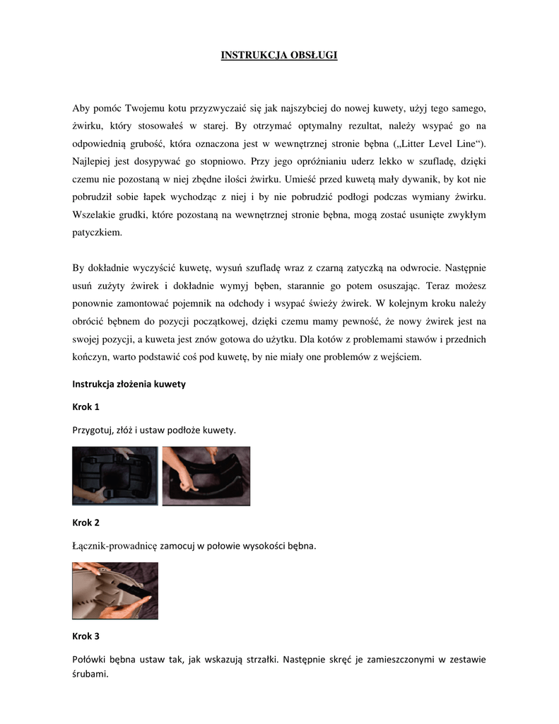 INSTRUKCJA OBSŁUGI Aby pomóc Twojemu kotu przyzwyczaić się jak najszybciej do nowej kuwety, użyj tego samego, żwirku, który stosowałeś w starej. By otrzymać optymalny rezultat, należy wsypać go na odpowiednią grubość, która oznaczona jest w wewnętrznej stronie bębna („Litter Level Line“). Najlepiej jest dosypywać go stopniowo. Przy jego opróżnianiu uderz lekko w szufladę, dzięki czemu nie pozostaną w niej zbędne ilości żwirku. Umieść przed kuwetą mały dywanik, by kot nie pobrudził sobie łapek wychodząc z niej i by nie pobrudzić podłogi podczas wymiany żwirku. Wszelakie grudki, które pozostaną na wewnętrznej stronie bębna, mogą zostać usunięte zwykłym patyczkiem. By dokładnie wyczyścić kuwetę, wysuń szufladę wraz z czarną zatyczką na odwrocie. Następnie usuń zużyty żwirek i dokładnie wymyj bęben, starannie go potem osuszając. Teraz możesz ponownie zamontować pojemnik na odchody i wsypać świeży żwirek. W kolejnym kroku należy obrócić bębnem do pozycji początkowej, dzięki czemu mamy pewność, że nowy żwirek jest na swojej pozycji, a kuweta jest znów gotowa do użytku. Dla kotów z problemami stawów i przednich kończyn, warto podstawić coś pod kuwetę, by nie miały one problemów z wejściem. Instrukcja złożenia kuwety Krok 1 Przygotuj, złóż i ustaw podłoże kuwety. Krok 2 Łącznik-prowadnicę zamocuj w połowie wysokości bębna. Krok 3 Połówki bębna ustaw tak, jak wskazują strzałki. Następnie skręć je zamieszczonymi w zestawie śrubami. Krok 4 Szufladę zamocuj pewnym ruchem, by zatyczka umieszczona na odwrocie tkwiła mocno w obudowie. Krok 5 Wypełnij kuwetę na wysokość ok 7cm ulubionym żwirkiem kota i umieścić bęben na podstawie. Sposób użycia By wyczyścić kuwetę, nałóż ręce na bęben, a następnie obracaj go w jednym kierunku. Następnie obróć go na pozycję startową tak, by żwirek był gotowy do kolejnego użytku. Wskazówka: Po obróceniu bębna, powinien znajdować się on na swojej pozycji startowej. Staraj się utrzymywać ten sam poziom żwirku i dosypywać zawsze taką samą ilość, jaka została wcześniej usunięta. Dla lepszego rezultatu, obracaj raz dziennie bęben, by żwirek był wygodny dla kota. Podczas jego opróżniania wystarczy jedynie wyciągnąć szufladę, usunąć z niej odchody, a potem ponownie zamocować. Wskazówka: By uniknąć zbyt dużej ilości zbędnie wyrzucanego żwirku, uderz delikatnie w bęben przed jego wyrzuceniem. Wskazówka: Wszelkie grudki, które pozostaną na wewnętrznej stronie bębna, mogą zostać usunięte zwykłym patyczkiem.