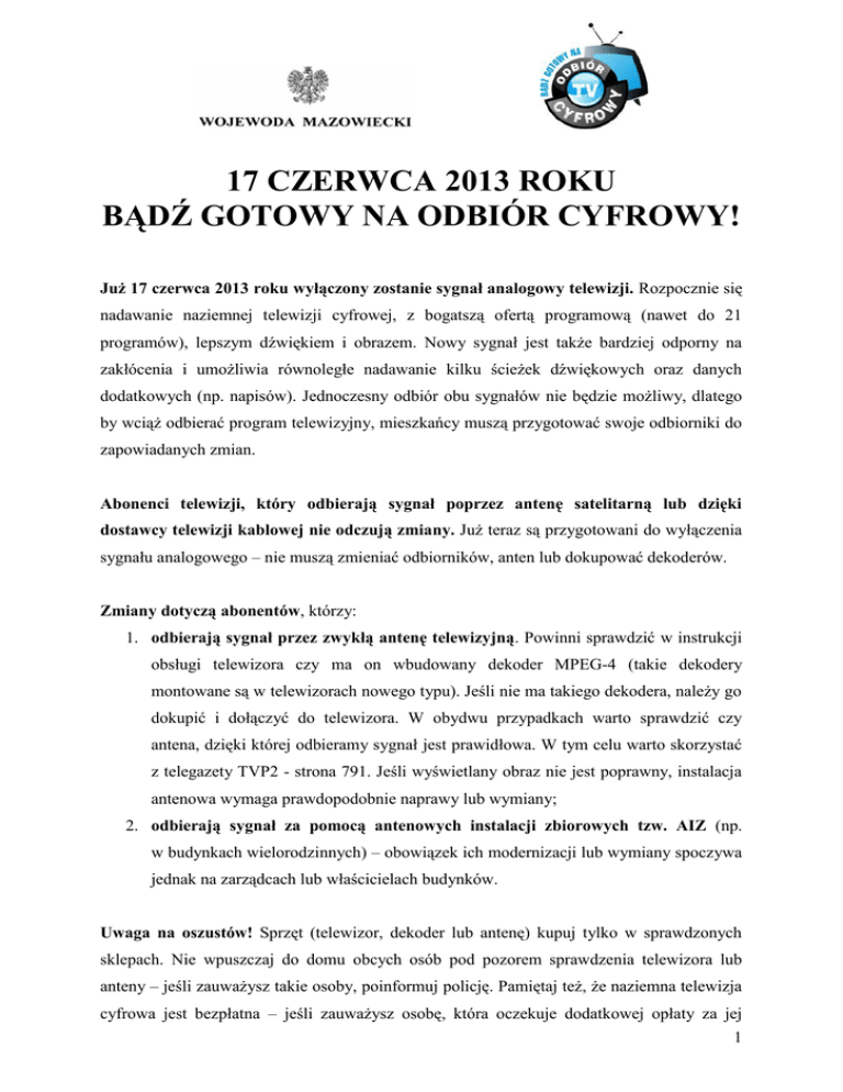 17 CZERWCA 2013 ROKU BĄDŹ GOTOWY NA ODBIÓR CYFROWY! Już 17 czerwca 2013 roku wyłączony zostanie sygnał analogowy telewizji. Rozpocznie się nadawanie naziemnej telewizji cyfrowej, z bogatszą ofertą programową (nawet do 21 programów), lepszym dźwiękiem i obrazem. Nowy sygnał jest także bardziej odporny na zakłócenia i umożliwia równoległe nadawanie kilku ścieżek dźwiękowych oraz danych dodatkowych (np. napisów). Jednoczesny odbiór obu sygnałów nie będzie możliwy, dlatego by wciąż odbierać program telewizyjny, mieszkańcy muszą przygotować swoje odbiorniki do zapowiadanych zmian. Abonenci telewizji, który odbierają sygnał poprzez antenę satelitarną lub dzięki dostawcy telewizji kablowej nie odczują zmiany. Już teraz są przygotowani do wyłączenia sygnału analogowego – nie muszą zmieniać odbiorników, anten lub dokupować dekoderów. Zmiany dotyczą abonentów, którzy: 1. odbierają sygnał przez zwykłą antenę telewizyjną. Powinni sprawdzić w instrukcji obsługi telewizora czy ma on wbudowany dekoder MPEG-4 (takie dekodery montowane są w telewizorach nowego typu). Jeśli nie ma takiego dekodera, należy go dokupić i dołączyć do telewizora. W obydwu przypadkach warto sprawdzić czy antena, dzięki której odbieramy sygnał jest prawidłowa. W tym celu warto skorzystać z telegazety TVP2 - strona 791. Jeśli wyświetlany obraz nie jest poprawny, instalacja antenowa wymaga prawdopodobnie naprawy lub wymiany; 2. odbierają sygnał za pomocą antenowych instalacji zbiorowych tzw. AIZ (np. w budynkach wielorodzinnych) – obowiązek ich modernizacji lub wymiany spoczywa jednak na zarządcach lub właścicielach budynków. Uwaga na oszustów! Sprzęt (telewizor, dekoder lub antenę) kupuj tylko w sprawdzonych sklepach. Nie wpuszczaj do domu obcych osób pod pozorem sprawdzenia telewizora lub anteny – jeśli zauważysz takie osoby, poinformuj policję. Pamiętaj też, że naziemna telewizja cyfrowa jest bezpłatna – jeśli zauważysz osobę, która oczekuje dodatkowej opłaty za jej 1 odbiór także poinformuj policję. Nie kupuj telewizora, dekodera lub anteny na targowiskach, nie korzystaj ze sprzedaży obwoźnej sprzętu – taki sprzęt trudno jest skontrolować i może się okazać, że jest nieodpowiedni do odbioru naziemnej telewizji cyfrowej. Kupuj sprzęt w zaufanych miejscach, bo sprzedawca urządzeń do odbioru telewizji cyfrowej jest zobowiązany: poinformować konsumenta o tym, czy wybrany telewizor jest przystosowany do odbioru naziemnej telewizji cyfrowej; uzyskać oświadczenie nabywcy o tym, że świadomie dokonuje zakupu sprzętu nieprzystosowanego do odbioru NTC; umieścić w widocznym miejscu informację o tym, że tylko odbiorniki spełniające określone wymagania techniczne umożliwiają odbiór naziemnej telewizji cyfrowej na terytorium Rzeczypospolitej Polskiej. Która antena jest odpowiednia? Do odbioru zarówno sygnału cyfrowego jak i analogowego stosuje się taką samą antenę. Oznacza to, że nie istnieją anteny specjalnie przeznaczone do odbioru cyfrowego. Oferowanie takiego sprzętu nie ma nic wspólnego z zagadnieniami technicznymi. nie zaleca się stosowania anten ze wzmacniaczami, które wymagają zasilania elektrycznego (mogą zniekształcać lub zakłócać sygnał cyfrowy); stosowanie anteny pokojowej jest możliwe pod warunkiem, że znajdzie się ona w niewielkiej odległości od stacji nadawczej(odbiór warunkować będzie jednak miejsce ustawienia w pomieszczeniu, obiekty znajdujące się w otoczeniu itp.); im dalej od nadajnika tym antena powinna być wyżej zainstalowana i być bardziej złożona (montaż anteny na dużej wysokości należy zlecić specjaliście bo może się to wiązać z pracą na wysokości). Jeśli sygnał cyfrowy po wyłączeniu sygnału analogowego w Państwa domu jest zakłócany lub zanika, proszę ponownie wyszukać programy. Jeśli pomimo wyszukania programy się nie pojawią problem można zgłosić do delegatury UKE w Warszawie – (22) 622 73 99. bezpłatna infolinia: 800 007 788 www.cyfryzacja.gov.pl www.mazowieckie.pl, baner „Naziemna 2 telewizja cyfrowa”