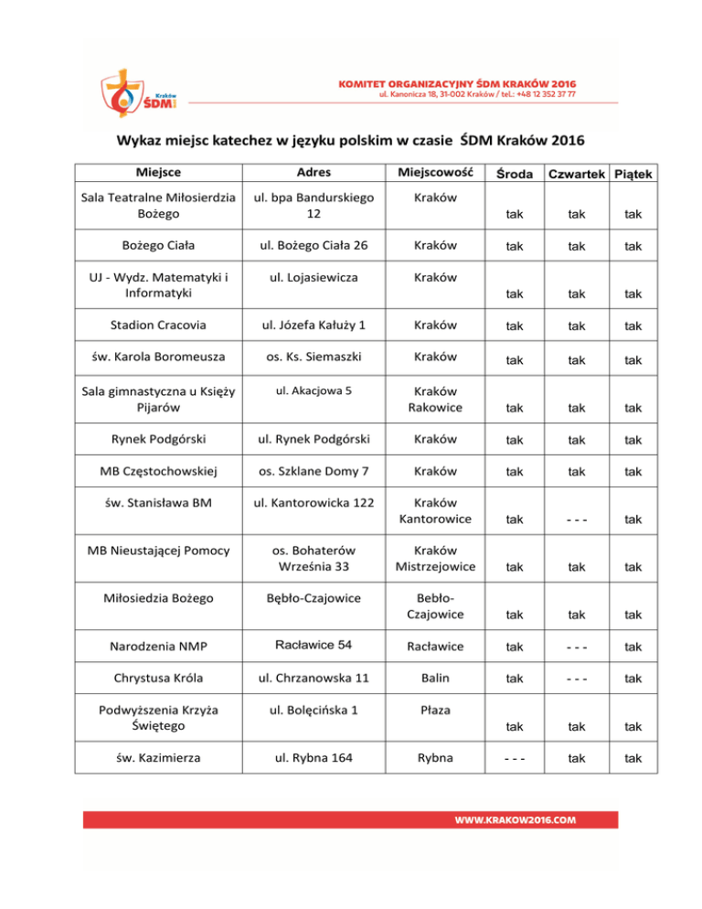 Wykaz miejsc katechez w języku polskim w czasie ŚDM Kraków 2016