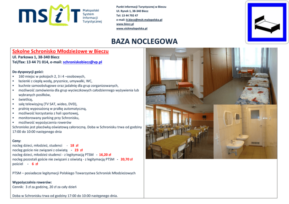 Punkt Informacji Turystycznej w Bieczu Ul. Rynek 1, 38-340 Biecz Tel: 13 44 792 47 e-mail: [email protected] www.biecz.pl www.visitmalopolska.pl BAZA NOCLEGOWA Szkolne Schronisko Młodzieżowe w Bieczu Ul. Parkowa 1, 38-340 Biecz Tel/fax: 13 44 71 014, e-mail: [email protected] Do dyspozycji gości: 160 miejsc w pokojach 2, 3 i 4 –osobowych, łazienki z ciepłą wodą, prysznice, umywalki, WC, kuchnie samoobsługowe oraz jadalnię dla grup zorganizowanych, możliwość zamówienia dla grup wycieczkowych całodziennego wyżywienia lub wybranych posiłków, świetlicę, salę telewizyjną (TV SAT, wideo, DVD), pralnię wyposażoną w pralkę automatyczną, możliwość korzystania z hali sportowej, monitorowany parking przy Schronisku, możliwość wypożyczenia rowerów Schronisko jest placówką oświatową całoroczną. Doba w Schronisku trwa od godziny 17:00 do 10:00 następnego dnia Ceny: nocleg dzieci, młodzież, studenci - 18 zł nocleg goście nie związani z oświatą - 23 zł nocleg dzieci, młodzież studenci - z legitymacją PTSM - 16,20 zł nocleg pozostali goście nie związani z oświatą - z legitymacją PTSM - 20,70 zł pościel - 6 zł PTSM – posiadacze legitymacji Polskiego Towarzystwa Schronisk Młodzieżowych Wypożyczalnia rowerów: Cennik: 3 zł za godzinę, 20 zł za cały dzień Doba w Schronisku trwa od godziny 17:00 do 10:00 następnego dnia. Hotel Mimoza** Libusza 1 38-306 Libusza tel: 13 44 75 194 e-mail:[email protected] www.hotelmimoza.republika.pl Zakwaterowanie: 29 pokoi w pełni wyposażonych (łazienka, wc, tv, internet bezprzewodowy). Do dyspozycji gości są pokoje trzy-, dwui jednoosobowe oraz komfortowe apartamenty. Do dyspozycji gości: Restauracja, recepcja czynna całą dobę, monitorowany parking, sauna sucha oraz parowa (solna) Ceny: od 60 zł. Hotel i Restauracja Grodzka* ul. Kazimierza Wielkiego 35, 38-340 Biecz tel/fax: + 48 13 44 71 121 Tel.kom. 502 521 437 e-mail:[email protected] www.restauracjagrodzka.pl Zakwaterowanie: Hotel posiada 24 miejsca noclegowe (8 pokoi 1 osobowych, 7 pokoi 2 osobowych i apartament) wyposażone w łazienkę z WC oraz telewizję kablową. Do dyspozycji gości: Telefon, fax oraz internet, room service, parking, restauracja i bar. Ceny: pokój 1-os. - 65zł pokój 2-os. - 80zł apartament - 100zł Ośrodek wypoczynkowy „Wczasy pod gruszą” ul. Belna Górna ,38-340 Biecz tel: +48 512 622 483, +48 502 857 398, e-mail: [email protected] www. domkiwbeskidach.pl Ośrodek składa się z trzech drewnianych domków całorocznych o powierzchni użytkowej 55,4 m2, w których znajdują się miejsca do spania dla 6 osób. Do dyspozycji gości: W każdym domku na parterze znajduje się łazienka i salon z kominkiem, tarasem oraz aneksem kuchennym, natomiast na piętrze znajdują się dwa pokoje, w tym jeden z balkonem. Goście mają dostęp do bezprzewodowego internetu. Obok domków przygotowana została altana z grillem oraz miejsce do rozpalenia ogniska, a także piaskownica dla dzieci, huśtawki i boisko do gry w siatkówkę, sauna sucha, balia z jacuzzi, leżaki, hamaki, kosz do gry, boisko do gry w piłkę siatkową, badminton, rowery, małe bramki do piłki nożnej, sanki. W pobliżu altany znajduje się piękny ogród z urozmaiconą roślinnością i oczkiem wodnym oraz kładką. Uwagi: Goście wypoczywający w domkach mają możliwość zakupu drewna (do kominka, grilla czy na ognisko). Cena 1 skrzynki z drewnem wynosi 10 zł. W domkach akceptowane są zwierzaki (np. psy). Opłata dodatkowa do ceny wynajmu wynosi 10 zł za dobę. Każdy właściciel zwierzaka odpowiada za jego zachowanie oraz posprzątanie po nim nieczystości w ogrodzie lub domku Pokoje Gościnne MAGNOLIA Cezary Gołębiowski ul. Tumidajskiego 6 38-340 Biecz tel: 13 44 711 52, kom. 509 421 941, kom. 502 916 241 e-mail: [email protected] www.magnoliabiecz.pl Położenie: Pokoje Gościnne MAGNOLIA położone są ok. 500 m od Rynku w Bieczu w kierunku wyjazdu na obwodnicę Biecza, przed mostem na rzece Ropa. Do dyspozycji gości: Ogród, altana z grillem i oczkiem wodnym, parking, plac zabaw dla dzieci, telefon, internet Zakwaterowanie: pokój 1-osobowy, pokój 2-osobowy posiada łazienkę z prysznicem , umywalkę, WC oraz aneks kuchenny z lodówką, kuchenką indukcyjną oraz naczyniami. apartament posiada łazienkę z wanną, umywalkę, WC. hol do rekreacji Ceny: od 50zł Villa Historia ul. Węgierska 13, 38-340 Biecz tel. 531 690 830 tel. 601 928 867 email: [email protected] www.villahistoria.com Zakwaterowanie: pokoje 1 i 2 osobowe, apartamenty, wyposażone w telewizor i łazienki z prysznicem, których standard dorównuje tym apartamentom z najlepszych hoteli w powiecie gorlickim. Do dyspozycji gości: Internet bezprzewodowy usytuowanana najwyższym piętrze budynku. Cena: od 95 - 190 zł WI-FI, sala bankietowa,