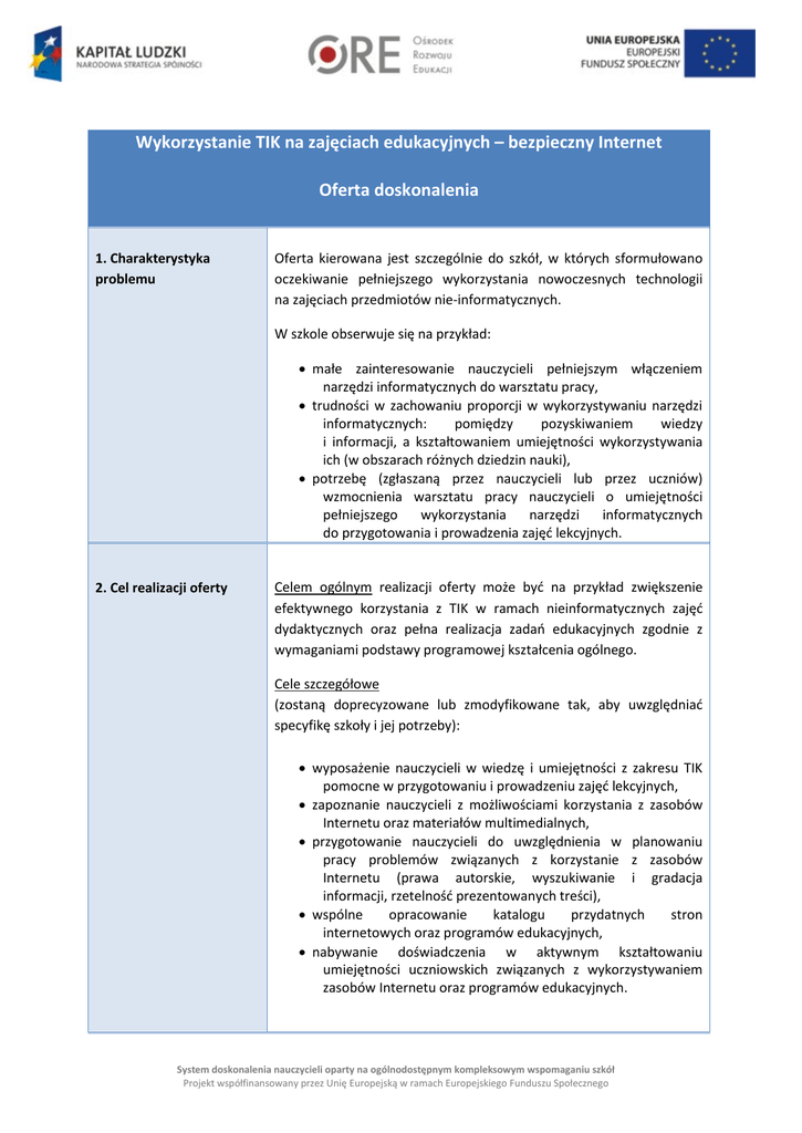 Wykorzystanie TIK na zajęciach edukacyjnych – bezpieczny Internet Oferta doskonalenia 1. Charakterystyka problemu Oferta kierowana jest szczególnie do szkół, w których sformułowano oczekiwanie pełniejszego wykorzystania nowoczesnych technologii na zajęciach przedmiotów nie-informatycznych. W szkole obserwuje się na przykład: małe zainteresowanie nauczycieli pełniejszym włączeniem narzędzi informatycznych do warsztatu pracy, trudności w zachowaniu proporcji w wykorzystywaniu narzędzi informatycznych: pomiędzy pozyskiwaniem wiedzy i informacji, a kształtowaniem umiejętności wykorzystywania ich (w obszarach różnych dziedzin nauki), potrzebę (zgłaszaną przez nauczycieli lub przez uczniów) wzmocnienia warsztatu pracy nauczycieli o umiejętności pełniejszego wykorzystania narzędzi informatycznych do przygotowania i prowadzenia zajęd lekcyjnych. 2. Cel realizacji oferty Celem ogólnym realizacji oferty może byd na przykład zwiększenie efektywnego korzystania z TIK w ramach nieinformatycznych zajęd dydaktycznych oraz pełna realizacja zadao edukacyjnych zgodnie z wymaganiami podstawy programowej kształcenia ogólnego. Cele szczegółowe (zostaną doprecyzowane lub zmodyfikowane tak, aby uwzględniad specyfikę szkoły i jej potrzeby): wyposażenie nauczycieli w wiedzę i umiejętności z zakresu TIK pomocne w przygotowaniu i prowadzeniu zajęd lekcyjnych, zapoznanie nauczycieli z możliwościami korzystania z zasobów Internetu oraz materiałów multimedialnych, przygotowanie nauczycieli do uwzględnienia w planowaniu pracy problemów związanych z korzystanie z zasobów Internetu (prawa autorskie, wyszukiwanie i gradacja informacji, rzetelnośd prezentowanych treści), wspólne opracowanie katalogu przydatnych stron internetowych oraz programów edukacyjnych, nabywanie doświadczenia w aktywnym kształtowaniu umiejętności uczniowskich związanych z wykorzystywaniem zasobów Internetu oraz programów edukacyjnych. System doskonalenia nauczycieli oparty na ogólnodostępnym kompleksowym wspomaganiu szkół Projekt współfinansowany przez Unię Europejską w ramach Europejskiego Funduszu Społecznego 3. Grupy docelowe Nauczyciele przedmiotów niezwiązanych z wiedzą i umiejętnościami TIK. Oferta nie jest przeznaczona dla nauczycieli informatyki, ale warto, aby włączyli się do pracy grup i wspierali je swymi umiejętnościami i doświadczeniem. 4. Efekty realizacji oferty Przykładowe efekty realizacji oferty: 1. Nauczyciele częściej i w większym stopniu wykorzystują TI oraz zasoby dostępne w Internecie. 2. Uczniowie częściej i efektywniej korzystają z zasobów internetowych na zajęciach dydaktycznych i przy wykonywaniu prac domowych. 3. Zwiększa się zaangażowanie uczniów w przygotowanie i prowadzenie elementów zajęd dydaktycznych. 4. Uczniowie w szerszym zakresie wykorzystują TI w przygotowaniu i realizacji projektów oraz przy prezentowaniu ich wyników. 5. Zwiększa się wykorzystanie dostępnego wyposażenia (pracowni komputerowych, tablic interaktywnych, rzutników multimedialnych). 6. Podniesienie efektów kształcenia. 5. Sposób realizacji oferty Realizacja oferty rozpoczyna się od diagnozy potrzeb angażującej wszystkich członków rady pedagogicznej i prowadzącej do sformułowania szczegółowego zakresu działao, wskazania osób odpowiedzialnych za ich wykonanie oraz opracowania rocznego planu wspomagania szkoły (RPW), którego minimalny zakres stanowi załącznik do każdej z ofert. Dopasowane do indywidualnych potrzeb szkoły działania mogą obejmowad w szczególności: 1. Szkolenie na temat praktycznego wykorzystania zasobów portalu wiedzy i zasobów dla nauczycieli Scholaris. 2. Warsztaty dla nauczycieli kształtujące/dwiczące umiejętności praktyczne związane z włączaniem narzędzi informatycznych do przygotowania i prowadzenia zajęd dydaktycznych. 3. Działania zespołów przedmiotowych wypracowujących wspólnie scenariusze konkretnych lekcji. 4. Organizowanie lekcji otwartych pokazujących różne narzędzia i metody pracy oparte na wykorzystaniu nowoczesnych technologii oraz wspólne omawianie dobrych praktyk, zaistniałych trudności i problemów związanych z wdrożeniem do szkolnej praktyki nowych umiejętności. 5. Wspólne opracowanie katalogu przydatnych stron internetowych, multimedialnych programów edukacyjnych. System doskonalenia nauczycieli oparty na ogólnodostępnym kompleksowym wspomaganiu szkół Projekt współfinansowany przez Unię Europejską w ramach Europejskiego Funduszu Społecznego 6. Konsultacje grupowe i indywidualne. Dyrektor: 6. Zasady korzystania z oferty Nadzoruje wszystkie działania. Udostępnia pomieszczenia i niezbędne wyposażenie ( pracownia komputerowa, sala dydaktyczna wyposażona w rzutnik multimedialny, tablica interaktywna, łącza internetowe). Motywuje pracowników do systematycznego i aktywnego udziału w szkoleniach, kursach, warsztatach, konsultacjach metodycznych. Promuje pracę z technologiami w działaniach rady pedagogicznej. Pracownicy pedagogiczni szkoły: 7. Czas i miejsce realizacji oferty Stosują w praktyce nabyte umiejętności dydaktyczne i wychowawcze. Aktywnie uczestniczą w szkoleniach, warsztatach, kursach i spotkaniach informacyjnych oraz w innych formach uczenia się dorosłych. Czas: w zależności od potrzeb, optymalnie 10 miesięcy. Miejsce realizacji: siedziba szkoły. Oferta będzie realizowana harmonogramem. etapowo, zgodnie z przyjętym 8. Osoby realizujące szkolenie / warsztaty Imię, nazwisko, biografia zawodowa (w zależności od działao zaplanowanych w RPW może to byd na przykład specjalista w dziedzinie wykorzystania nowoczesnych technologii w nauczaniu) 9. Osoba udzielająca dalszych informacji Szkolny organizator rozwoju edukacji/animator: ……………………………………………………………………………………………………. Imię, nazwisko, e-mail, numer telefonu. System doskonalenia nauczyc
