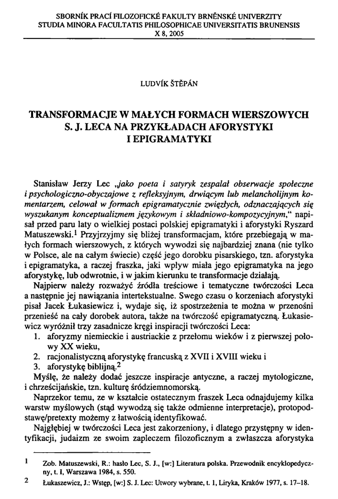 TRANSFORMACJE W MAŁYCH FORMACH WIERSZOWYCH S. J.