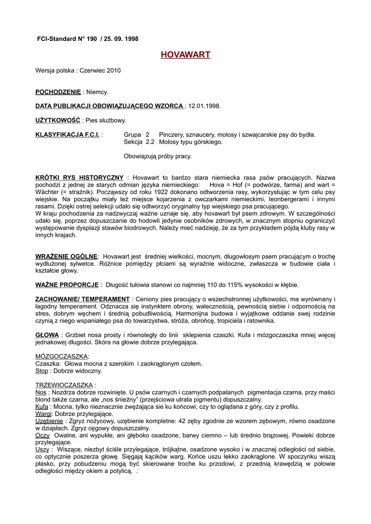 FCI-Standard N° 190 / 25. 09. 1998 HOVAWART Wersja polska : Czerwiec 2010 POCHODZENIE : Niemcy. DATA PUBLIKACJI OBOWIĄZUJĄCEGO WZORCA : 12.01.1998. UŻYTKOWOŚĆ : Pies służbowy. KLASYFIKACJA F.C.I. : Grupa 2 Pinczery, sznaucery, molosy i szwajcarskie psy do bydła. Sekcja 2.2 Molosy typu górskiego. Obowiązują próby pracy. KRÓTKI RYS HISTORYCZNY : Hovawart to bardzo stara niemiecka rasa psów pracujących. Nazwa pochodzi z jednej ze starych odmian języka niemieckiego: Hova = Hof (= podwórze, farma) and wart = Wächter (= strażnik). Począwszy od roku 1922 dokonano odtworzenia rasy, wykorzystując w tym celu psy wiejskie. Na początku miały też miejsce kojarzenia z owczarkami niemieckimi, leonbergerami i innymi rasami. Dzięki ostrej selekcji udało się odtworzyć oryginalny typ wiejskiego psa pracującego. W kraju pochodzenia za nadzwyczaj ważne uznaje się, aby hovawart był psem zdrowym. W szczególności udało się, poprzez dopuszczanie do hodowli jedynie osobników zdrowych, w znacznym stopniu ograniczyć występowanie dysplazji stawów biodrowych. Należy mieć nadzieję, że za tym przykładem pójdą kluby rasy w innych krajach. WRAŻENIE OGÓLNE: Hovawart jest średniej wielkości, mocnym, długowłosym psem pracującym o trochę wydłużonej sylwetce. Różnice pomiędzy płciami są wyraźnie widoczne, zwłaszcza w budowie ciała i kształcie głowy. WAŻNE PROPORCJE : Długość tułowia stanowi co najmniej 110 do 115% wysokości w kłębie. ZACHOWANIE/ TEMPERAMENT : Ceniony pies pracujący o wszechstronnej użytkowości, ma wyrównany i łagodny temperament. Odznacza się instynktem obrony, walecznością, pewnością siebie i odpornością na stres, dobrym węchem i średnią pobudliwością. Harmonijna budowa i wyjątkowe oddanie swej rodzinie czynią z niego wspaniałego psa do towarzystwa, stróża, obrońcę, tropiciela i ratownika. GŁOWA : Grzbiet nosa prosty i równoległy do linii sklepienia czaszki. Kufa i mózgoczaszka mniej więcej jednakowej długości. Skóra na głowie dobrze przylegająca. MÓZGOCZASZKA: Czaszka: Głowa mocna z szerokim i zaokrąglonym czołem. Stop : Dobrze widoczny. TRZEWIOCZASZKA : Nos : Nozdrza dobrze rozwinięte. U psów czarnych i czarnych podpalanych pigmentacja czarna, przy maści blond także czarna, ale „nos śnieżny” (przejściowa utrata pigmentu) dopuszczalny. Kufa : Mocna, tylko nieznacznie zwężająca sie ku końcowi, czy to oglądana z góry, czy z profilu. Wargi: Dobrze przylegające. Uzębienie : Zgryz nożycowy, uzębienie kompletne: 42 zęby zgodnie ze wzorem zębowym, równo osadzone w dziąsłach. Zgryz cęgowy dopuszczalny. Oczy Owalne, ani wypukłe, ani głęboko osadzone, barwy ciemno – lub średnio brązowej. Powieki dobrze przylegające. Uszy : Wiszące, niezbyt ściśle przylegające, trójkątne, osadzone wysoko i w znacznej odległości od siebie, co optycznie poszerza głowę. Sięgają kącików warg. Końce uszu lekko zaokrąglone. W spoczynku wiszą płasko, przy pobudzeniu mogą być skierowane troche ku przodowi, z przednią krawędzią w połowie odległości między okiem a potylicą. . SZYJA : Mocna, średniej długości, skóra na szyi przylegająca. TUŁÓW : Grzbiet : Mocny i prosty. Lędźwie : Mocne, nieco dłuższe od zadu. Zad : Średnio długi i lekko opadający. Klatka piersiowa : Mocna, szeroka i głęboka. OGON : Dobrze owłosiony, sięga stawu skokowego, ale nie do ziemi. W zależności od nastroju psa może być noszony wysoko i zakręcony nad grzbietem, albo zwisać nisko. LIMBS KOŃCZYNY PRZEDNIE : Mocne, proste i pionowe, zarówno oglądane z przodu, jak z boku. Łopatki : Bardzo dobrze umięśnione, długie i skośnie ustawione. Ramię : Długie, dobrze przylegające do tułowia. Łokcie: Dobrze przylegające do boków. Nadgarstek : Mocny. Śródręcze : Umiarkowanie nachylone. KOŃCZYNY TYLNE : Mocne, oglądane z tyłu pionowe, dobrze kątowane. Udo i podudzie: Bardzo dobrze umięśnione. Staw skokowy : Mocny, niski. ŁAPY : Okrągławe, mocne i zwarte. Palce zwarte i wysklepione. Wilcze pazury powinny być usunięte, chyba, że jest to w danym kraju zabronione. U psów czarnych i czarnych podpalanych pazury czarne, u blond mogą być jaśniejsze. CHODY : We wszystkich tempach ruch hovawarta jest przestrzenny; kończyny poruszają się równolegle. Kłus powinien być wyciągnięty, z mocnym napędem kończyn tylnych. SKÓRA : Dobrze przylegająca na całym ciele. U psów czarnych i czarnych podpalanych w odcieniu błękitnym, u blond – w różowym. SZATA: SIERŚĆ : Długi, mocny włos okrywowy jest przylegający i lekko pofalowany, podszerstek skąpy. Sierść jest najdłuższa na piesi, brzuchu, tylnych stronie nóg przednich i ud, oraz na ogonie. Najkrótsza na głowie i przednich stronach nóg. Sierść jest gęsta. MAŚĆ : Trzy odmiany barwne: czarna podpalana, czarna i blond. Czarna podpalana : Sierśc czarna i lśniąca, znaczenia blond, nie za jasne, ale nie ciemne. Na głowie znaczenia zaczynają się poniżej grzbietu nosa, obejmują kufę do kącików warg, i przechodzą na spód szyi. Na oczami dwie okrągłe, wyraźne plamki. Znaczenia na piersi składają się z dwóch symetrycznych plam, które mogą być połączone. Na nogach znaczenia, oglądane z boku, obejmują palce i sięgają mniej więcej do nadgarstka; powyżej niego znajdują się tylko na tylnej stronie nóg i sięgają mniej więcej łokcia. Na kończynach tylnych, gdy patrzeć z boku, znaczenia tworzą szeroką linię poniżej stawu skokowego, a wąską - powyżej niego; dalej ciągną się po przedniej stronie nóg aż do poziomu brzucha. Znaczenie występuje także na spodniej stronie ogona. Wszystkie znaczenia musza być wyraźnie odgraniczone. Pojedyncza, mała biała plamka na piersi, pojedyncze białe włosy na palcach i końcu ogona są dopuszczalne. Pigmentacja powiek, warg i opuszek łap czarna. Czarna : Czerń nasycona i lśniąca. Pojedyncza, mała biała plamka na pier