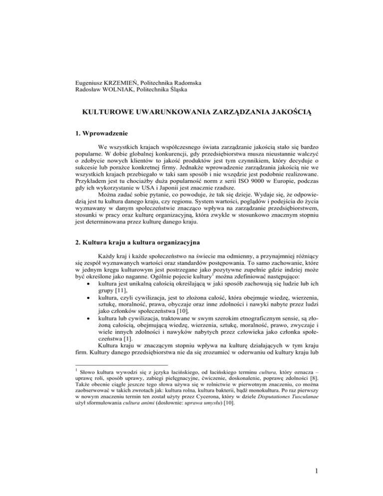 Eugeniusz KRZEMIEŃ, Politechnika Radomska Radosław WOLNIAK, Politechnika Śląska KULTUROWE UWARUNKOWANIA ZARZĄDZANIA JAKOŚCIĄ 1. Wprowadzenie We wszystkich krajach współczesnego świata zarządzanie jakością stało się bardzo popularne. W dobie globalnej konkurencji, gdy przedsiębiorstwa musza nieustannie walczyć o zdobycie nowych klientów to jakość produktów jest tym czynnikiem, który decyduje o sukcesie lub porażce konkretnej firmy. Jednakże wprowadzenie zarządzania jakością nie we wszystkich krajach przebiegało w taki sam sposób i nie wszędzie jest podobnie realizowane. Przykładem jest tu chociażby duża popularność norm z serii ISO 9000 w Europie, podczas gdy ich wykorzystanie w USA i Japonii jest znacznie rzadsze. Można zadać sobie pytanie, co powoduje, że tak się dzieje. Wydaje się, że odpowiedzią jest tu kultura danego kraju, czy regionu. System wartości, poglądów i podejścia do życia wyznawany w danym społeczeństwie znacząco wpływa na zarządzanie przedsiębiorstwem, stosunki w pracy oraz kulturę organizacyjną, która zwykle w stosunkowo znacznym stopniu jest determinowana przez kulturę danego kraju. 2. Kultura kraju a kultura organizacyjna Każdy kraj i każde społeczeństwo na świecie ma odmienny, a przynajmniej różniący się zespół wyznawanych wartości oraz standardów postępowania. To samo zachowanie, które w jednym kręgu kulturowym jest postrzegane jako pozytywne zupełnie gdzie indziej może być określone jako naganne. Ogólnie pojecie kultury1 można zdefiniować następująco: • kultura jest unikalną całością określającą w jaki sposób zachowują się ludzie lub ich grupy [11], • kultura, czyli cywilizacja, jest to złożona całość, która obejmuje wiedzę, wierzenia, sztukę, moralność, prawa, obyczaje oraz inne zdolności i nawyki nabyte przez ludzi jako członków społeczeństwa [10], • kultura lub cywilizacja, traktowane w swym szerokim etnograficznym sensie, są złożoną całością, obejmującą wiedzę, wierzenia, sztukę, moralność, prawo, zwyczaje i wiele innych zdolności i nawyków nabytych przez człowieka jako członka społeczeństwa [1]. Kultura kraju w znaczącym stopniu wpływa na kulturę działających w tym kraju firm. Kultury danego przedsiębiorstwa nie da się zrozumieć w oderwaniu od kultury kraju lub 1 Słowo kultura wywodzi się z języka łacińskiego, od łacińskiego terminu cultura, który oznacza – uprawę roli, sposób uprawy, zabiegi pielęgnacyjne, ćwiczenie, doskonalenie, poprawę zdolności [8]. Także obecnie ciągle jeszcze tego słowa używa się w rolnictwie w pierwotnym znaczeniu, co można zaobserwować w takich zwrotach jak: kultura rolna, kultura bakterii, bądź monokultura. Po raz pierwszy w nowym znaczeniu termin ten został użyty przez Cycerona, który w dziele Disputationes Tusculanae użył sformułowania cultura animi (dosłownie: uprawa umysłu) [10]. 1 krajów, w którym prowadzi ono działalność. Jednakże, jeśli nawet można zidentyfikować trwałe cechy kultury narodowej, to każde przedsiębiorstwo ma własną osobowość i kulturę [12]. Kultura organizacyjna jest czynnikiem, który w istotnym stopniu wpływa na jego efektywność. Wielu specjalistów zajmujących się zarządzaniem sądzi, że kultura organizacyjna jest kluczowym czynnikiem wpływającym na doskonałość działania przedsiębiorstwa. Jej interpretacja i właściwe zrozumienie ma duży wpływ na strategię zarządzania organizacją, oraz jej produktywność [11]. Termin kultura organizacyjna jest szeroko stosowany w światowym zarządzaniu od początku lat 80-tych XX wieku. Istnieje wiele definicji pojęcia kultury organizacyjnej, na przykład: • kultura organizacyjna to zestaw wartości, które pomagają członkom danej organizacji rozumieć, za czym organizacja się opowiada, jak pracuje i co uważa za ważne [2], • kultura organizacyjna to zbiór wartości, schematów zachowań, specyficznych form komunikacji oraz szeregu innych elementów, które utrwalają poczucie wspólnoty wśród członków organizacji. Kultura w organizacji może się przejawiać w różny sposób, na przykład poprzez zwyczaje panujące w organizacji, czy utarte kanony zachowań [9], • kultura organizacyjna odzwierciedla założenia dotyczące klientów, pracowników, misji, wyrobów i działań oraz założenia, które sprawdziły się w przeszłości i które zostały przełożone na normy zachowań, oczekiwania na to co jest uzasadnione, oraz pożądane sposoby myślenia i działania [1]. Fakt, że kultura danego kraju w znaczący sposób wpływa na kulturę organizacyjną firmy nie znaczy jednakże, że można te pojęcia mieszać i dowolnie ich używać. W czasach, gdy nie istniały organizacje międzynarodowe2 problem był mniejszy, ponieważ wtedy w zasadzie kultura danego społeczeństwa determinowała kulturę poszczególnych przedsiębiorstw. W tamtych czasach kulturę przedsiębiorstwa można było określić jako podzbiór kultury kraju (rysunek 1). Jednakże coraz powszechniejsza globalizacja i powstanie korporacji międzynarodowych zmieniło ten prosty obraz sytuacji. Obecnie stosunki między kulturami narodowymi a kulturami poszczególnych organizacji stały się dużo bardziej skomplikowane. W jednej firmie mogą na przykład pracować ludzie z różnych regionów świata, wychowani w odmiennych uwarunkowaniach kultury narodowej. Na postępowanie, motywacje, wartości pracowników wpływają obydwie kultury z różną siłą oddziaływania w zależności od konkretnej sytuacji (rysunek 1). Różnicę pomiędzy kulturą kraju a kulturą organizacji można przedstawić w sposób następujący [5]: • kultura kraju – wyróżnia poszczególnych ludzi, ich grupy oraz instytucje w różnych krajach, • kultura organizacyjna – termin używany do rozróżniania poszczególnych organizacji działających na terenie danego kraju. 2 A przynajmniej nie miały tak