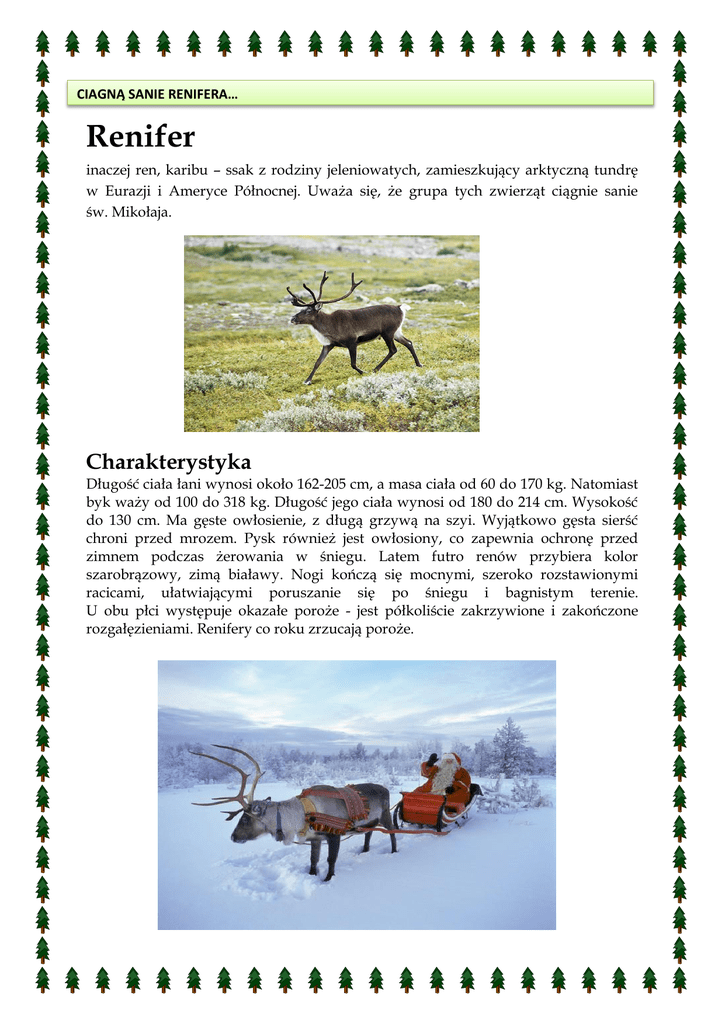 CIAGNĄ SANIE RENIFERA… Renifer inaczej ren, karibu – ssak z rodziny jeleniowatych, zamieszkujący arktyczną tundrę w Eurazji i Ameryce Północnej. Uważa się, że grupa tych zwierząt ciągnie sanie św. Mikołaja. Charakterystyka Długość ciała łani wynosi około 162-205 cm, a masa ciała od 60 do 170 kg. Natomiast byk waży od 100 do 318 kg. Długość jego ciała wynosi od 180 do 214 cm. Wysokość do 130 cm. Ma gęste owłosienie, z długą grzywą na szyi. Wyjątkowo gęsta sierść chroni przed mrozem. Pysk również jest owłosiony, co zapewnia ochronę przed zimnem podczas żerowania w śniegu. Latem futro renów przybiera kolor szarobrązowy, zimą białawy. Nogi kończą się mocnymi, szeroko rozstawionymi racicami, ułatwiającymi poruszanie się po śniegu i bagnistym terenie. U obu płci występuje okazałe poroże - jest półkoliście zakrzywione i zakończone rozgałęzieniami. Renifery co roku zrzucają poroże. CIAGNĄ SANIE RENIFERA… Tryb życia Renifery potrafią długo i wytrwale biegać. Większość roku spędzają na wędrówkach, zimą schodzą na południe do zalesionych okolic, na wiosnę wracają do tundry. Samice i ich potomstwo żyją stadnie, ale dorosłe samce poza okresem rui prowadzą samotny tryb życia. Długość życia: do 20 lat. Pożywienie Renifer jest roślinożerny - zjada trawy, byliny i porosty, zwłaszcza chrobotki. Zimą wygrzebuje spod śniegu również pączki krzewów i jagody. Potrafi strawić zamarznięty pokarm. Rozmnażanie Ruja trwa od sierpnia do listopada. Po ciąży trwającej 225 - 235 dni, najczęściej na przełomie maja i czerwca, na świat przychodzi jedno młode. Przez pół roku jest karmione mlekiem matki. ERNEST