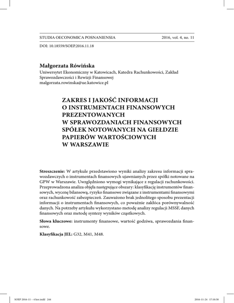 STUDIA OECONOMICA POSNANIENSIA 2016, vol. 4, no. 11 DOI: 10.18559/SOEP.2016.11.18 Małgorzata Rówińska Uniwersytet Ekonomiczny w Katowicach, Katedra Rachunkowości, Zakład Sprawozdawczości i Rewizji Finansowej [email protected] ZAKRES I JAKOŚĆ INFORMACJI O INSTRUMENTACH FINANSOWYCH PREZENTOWANYCH W SPRAWOZDANIACH FINANSOWYCH SPÓŁEK NOTOWANYCH NA GIEŁDZIE PAPIERÓW WARTOŚCIOWYCH W WARSZAWIE Streszczenie: W artykule przedstawiono wyniki analizy zakresu informacji sprawozdawczych o instrumentach finansowych ujawnianych przez spółki notowane na GPW w Warszawie. Uwzględniono wymogi wynikające z regulacji rachunkowości. Przeprowadzona analiza objęła następujące obszary: klasyfikację instrumentów finansowych, wycenę bilansową, ryzyko finansowe związane z instrumentami finansowymi oraz rachunkowość zabezpieczeń. Zauważono brak jednolitego sposobu prezentacji informacji o instrumentach finansowych, co poważnie zakłóca porównywalność danych. Na potrzeby artykułu wykorzystano metodę analizy regulacji MSSF, danych finansowych oraz metodę syntezy wyników cząstkowych. Słowa kluczowe: instrumenty finansowe, wartość godziwa, sprawozdania finansowe. Klasyfikacja JEL: G32, M41, M48. SOEP 2016-11 – 4 kor.indd 244 2016-11-24 17:10:38 Zakres i jakość informacji o instrumentach finansowych 245 RANGE AND QUALITY OF INFORMATION ABOUT FINANCIAL INSTRUMENTS IN FINANCIAL STATEMENTS OF COMPANIES LISTED ON THE WARSAW STOCK EXCHANGE Abstract: The objective of the paper is to analyse the range of reporting information about financial instrument presents for companies listed on the Warsaw Stock Exchange. The analysis concerned the following problems: classifications of financial instruments, balance sheet valuation, financial risk connected with financial instruments, and hedge accounting. Keywords: financial instruments, fair value, financial statements. Wstęp Zakres informacji na temat instrumentów finansowych prezentowanych w sprawozdaniu finansowym regulowany jest prawem bilansowym. Międzynarodowy Standard Sprawozdawczości Finansowej nr 7 zobowiązuje jednostki gospodarcze do ujawniania informacji na temat wpływu instrumentów finansowych na sytuację finansową i wynik działalności jednostki. Regulacje rachunkowości zobowiązują także do prezentacji informacji o charakterze i zakresie ryzyka wynikającego z instrumentów finansowych i sposobu zarządzania nim [MSSF 7, par. 1]. Jednostka powinna zatem przygotować i zaprezentować w sprawozdaniu finansowym informacje na temat: polityki rachunkowości w kontekście instrumentów finansowych, wpływu instrumentów na sprawozdanie z sytuacji finansowej oraz sprawozdanie z całkowitych dochodów, ryzyka związanego z instrumentami finansowymi, rachunkowości zabezpieczeń [Frendzel 2010, s. 235]. W celu zweryfikowania zakresu i formy ujawnianych informacji o instrumentach finansowych analizie poddano roczne sprawozdania finansowe (za rok obrotowy 20141) losowo wybranych 20 spółek notowanych na GPW w Warszawie. Wszystkie spółki wykazują instrumenty finansowe i sporządzają sprawozdanie zgodnie z regulacjami MSSF (z wyjątkiem spółki Aramus). Celem artykułu było zweryfikowanie i porównanie informacji o instrumentach finansowych prezentowanych w sprawozdaniach finansowych. Na tle wymogów formalnych co do zakresu 1 W przypadku spółki Sfinks Polska S.A. uwzględniono sprawozdanie za rok obrotowy 2013. Było to ostanie roczne sprawozdanie udostępnione przez spółkę. Fakt ten nie wpływa na wyniki przeprowadzonych analiz. SOEP 2016-11 – 4 kor.indd 245 2016-11-24 17:10:38 246 Małgorzata Rówińska ujawnianych informacji sprawozdawczych dokonano oceny sposobu prezentacji tych informacji. W artykule wykorzystano metodę analizy regulacji MSSF, analizy danych empirycznych pochodzących z rocznych sprawozdań finansowych oraz metodę syntezy wyników cząstkowych. 1. Kategorie instrumentów finansowych W sprawozdaniu finansowym jednostki powinny wykazywać bilansową wartość aktywów i zobowiązań finansowych z uwzględnieniem ich podziału na kategorie [MSSF 7, par. 8]. Obecnie większość jednostek klasyfikuje instrumenty finansowe według zasad wynikających z MSR 39, chociaż istnieje możliwość wyboru innego sposobu klasyfikacji, zgodnego z regulacjami MSSF 9. Analizowane spółki (z wyjątkiem jednej) korzystają z MSR 39 i w opisie zasad rachunkowości wskazują cztery kategorie aktywów finansowych: wyceniane w wartości godziwej przez wynik finansowy, udzielone pożyczki i należności, utrzymywane do terminu wymagalności oraz dostępne do sprzedaży. Nazwy kategorii wskazywane przez spółki w polityce rachunkowości są zbliżone do wynikających z regulacji MSR 39. W przypadku jednej ze spółek (Famur) pierwsza z wymienionych kategorii jest zastąpiona kategorią: aktywa finansowe przeznaczone do obrotu, co należy potraktować jako (zapewne celowe) zawężenie kategorii aktywów wycenianych w wartości godziwej przez wynik finansowy. Spółka kwalifikuje tutaj wyłącznie aktywa, które zostały nabyte w celu generowania zysku wynikającego z krótkoterminowego wahania ceny lub marży maklerskiej. Przyjęcie więc takiej wąskiej nazwy w tym wypadku jest jak najbardziej uzasadnione. Podając kategorie aktywów finansowych, spółki przedstawiają ich charakterystyki, które pozostają w zgodzie z cechami wskazywanymi w MSR. Jak wspomniano, spośród analizowanych spółek jedna (Gino Rossi) wykorzystuje klasyfikację aktywów finansowych według MSSF 9 i wyodrębnia dwie kategorie: udziały i akcje oraz pożyczki i należności. W wypadku zobowiązań finansowych spółki generalnie wskazują i charakteryzują dwie ich kategorie, a mianowicie wyceniane w wartości godziwej oraz wyceniane w zamortyzowanym koszcie. Wartości aktywów i zobowiązań finansowych spółek posiadanych na dzień 31 grudnia 2014 roku przedstawia tabela 1. Dla zobrazowania poziomu zaangażowania spółek w inst