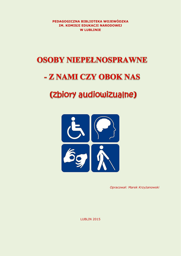 PEDAGOGICZNA BIBLIOTEKA WOJEWÓDZKA IM. KOMISJI EDUKACJI NARODOWEJ W LUBLINIE Opracował: Marek Krzyżanowski LUBLIN 2015 Multimedia 1. ADHD DAREM CZY POTĘPIENIEM ? [Film] / reż. Alek Madej. - Warszawa : Wydawnictwo WAM - Studio Inigo, 2006. - 1 dysk DVD (26 min) : dźw. mono, wersja językowa: polski, obraz 4:9, kolor. Film porusza zagadnienia: 1. Czym jest ADHD ?. 2. Jak pomagać nauczycielom ? 3. Jak pomagać rodzicom i ich dzieciom ?. DVD. 1980 2. ADHD : już z tobą nie wytrzymam [Film] / reż. Dariusz Regucki ; scen. Dariusz Regucki ; muz. Bartłomiej Regucki ; obsada : Maciej Słota, Alina Kamińska, Iwona Wiśniewska [et al.]. - Kraków : Dom Wydawniczy "Rafael", 2007. - 1 dysk DVD (30 min) : dźw. , obraz 16:9 , kolor + broszura z materiałami pomocniczymi. Film dla rodziców o problemach ADHD wśród dzieci. DVD. 943 ; DVD. 2924 3. BAJKI : nie tylko dla dzieci głuchych [Film] / scen. Maria Boruń ; koment. Małgorzata Kupisiewicz. - Warszawa : Telewizja Polska, 1997. - 2 dyski DVD (2x90 min) : dźw., obraz 16:9 , kolor + poradnik. Eksperymentalne propozycje programowe zawierające - oprócz formy edukacyjnej elementy integrujące środowisko dzieci słyszących z niesłyszącymi. Klasyczne baśnie i bajki odtwarzane są przez dzieci z Ośrodka dla Dzieci Głuchych w Szczecinie, które posługują się językiem migowym. Poradnik zawiera materiał dotyczący wpływu wad słuchu na rozwój dziecka. Dysk 1 zawiera tytuły bajek: 1. Kopciuszek. 2. Król jest nagi. 3. Słowik. 4. Kot w butach. Dysk 2 zawiera tytuły: 5. Czerwony Kapturek. 6. Królewna Śnieżka. 7. Księżniczka na ziarnku grochu. 8. Kuma śmierć. DVD. 3346/1-2 4. ĆWICZENIA WAD POSTAWY [Dokument elektroniczny] / aut. Piotr Pasiński. Świlcza : LK AVALON, 1998. - 1 dysk optyczny (CD-ROM) : dźw., kolor ; 12 cm. Multimedialny program prezentujący ćwiczenia na skoliozy i płaskostopie. Ćwiczenia przedstawione w formie animacji 3D są dokładnie pokazane i omówione. Zestawy wzbogacone są wiedzą anatomiczną. Program zawiera ponadto gry, testy, porady na temat zachowania właściwej postawy. Dysk w dwóch wersjach : telewizyjnej - przeznaczonej dla stacjonarnych odtwarzaczy DVD i komputerowej - przeznaczonej dla komputerów klasy PC. CD-ROM. 397 ; CD-ROM. 3017 5. DYSLEKSJA 2004/2005 [Dokument elektroniczny]. - Warszawa : Play, 2005. 1 dysk optyczny (CD-ROM) : dźw. , kolor ;12 cm. Program stanowi pomoc w nauce ortografii. Zawiera zagadnienia dotyczące poprawnej pisowni, testy sprawdzające opanowanie wiedzy oraz ćwiczenia w pisaniu. Program dla uczniów starszych klas szkoły podstawowej, gimnazjum i średniej. Minimalne wymagania systemowe: Procesor 700 MHz : System WIN 98/ME/XP ; RAM 64 MB ; Grafika 32 MB. CD-ROM. 276 6. DYSLEKSJI STOP ! [Dokument elektroniczny]. - Warszawa : EXE, 2005. - 1 dysk optyczny (CD-ROM) : dźw., kolor ; 12 cm. Program pozwala na skuteczne zdiagnozowanie rodzaju schorzenia oraz jego leczenie. Ćwiczenia mogą być stosowane dla osób z zaburzeniami narządów mowy i ruchu. Program do wykorzystania w terapiach grup przedszkolnych i szkoły podstawowej. Minimalne wymagania sprzętowe: Windows 98/2000/XP ; Napęd CD-Rom x 8 ; Karta graficzna x 16 MB ; 32 MB RAM. CD-ROM. 261 7. DYSLEKTYK 2 [Dokument elektroniczny]. - Warszawa : MarkSoft, 2005. - 1 dysk optyczny (CD-ROM) : dźw. , kolor ; 12 cm. Program wspomagający terapię pedagogiczną. Zawiera ćwiczenia poprawiające sprawność analizatora wzrokowo-słuchowego, pamięć słuchową i wzrokową, koncentrację uwagi itp. Atrakcyjne gry ćwiczące oraz ćwiczenia sprawdzające dopasowane są stopniem trudności do umiejętności i potrzeb dziecka. Wymagania sprzętowe: Procesor Pentium 90 MHz ; 16 MB RAM ; karta graficzna zgodna z DirectX ; karta dźwiękowa zgodna z Windows ; napęd CD-ROM x 6 ; Windows 95/98/2000/XP. CD-ROM. 131 8. GIMNASTYKA KOREKCYJNA : ćwiczenia korekcyjne dla dzieci z wadami postawy [Film] / scen. Maria Kutzner-Kozińska. Warszawa : Studio Filmów Edukacyjnych "Nauka", 2003. - 1 dysk DVD (90 min) : dźw. stereo, obraz 4:3, kolor ; 12 cm. Ćwiczenia korekcyjne dla dzieci z wadami postawy Film omawia najczęstsze przyczyny wadliwej postawy ciała oraz przedstawia odpowiednie ćwiczenia korekcyjne dla dzieci , które mogą być wykonywane samodzielnie lub w zespołach korekcyjnych. DVD. 3389 9. KLIK UCZY CZYTAĆ [Dokument elektroniczny] / scen. Lidia Hryciuk. - Warszawa : Wydawnictwa Szkolne i Pedagogiczne, 1999. - 1 dysk optyczny (CD-ROM) : dźw., kolor ; 12 cm. Multimedialny elementarz zawiera animowane prezentacje liter, ponad 100 zabaw, rebusów, puzzle, układanki przedmiotowe. Posiada pełną interaktywność: komentarz po każdej zabawie oraz system nagród. Program przeznaczony dla wszystkich dzieci w wieku przedszkolnym, uczniów pierwszych klas szkół podstawowych, dzieci dyslektycznych. Wymagania systemowe: Procesor Pentium 100 ; Cd-Romx8 ; Pamięć: 32 MB wolnego miejsca ; Karta graficzna: 640x480 high color ; Karta dźwiękowa: zgodna z MS Windows ; Windows 9x/ME/NT4.0/2000/XP. CD-ROM 705 10. METODA DOBREGO STARTU. CZ. 1, założenia i struktura zajęć [Film] / reż. Mieczysław Szemalikowski ; scen. Marta Bogdanowicz. - Bytom : Agencja Filmowa "PRO-FILM", 2002. - 1 dysk DVD (45 min) : dźw. Stereo, obraz 4:3, kolor. Film przedstawia założenia metody, cele jakim służy, strukturę zajęć, modyfikacje i programy do realizacji. Prezentuje zajęcia w grupie 6-latków w szkole masowej oraz w przedszkolu integracyjnym. DVD 2450 /1 11. METODA DOBREGO STARTU. Cz. 2, zajęcia w grupach wiekowych [Film] / reż. Mieczysław Szemalikowski ; scen. Marta Bogdanowicz. - Bytom : Agencja Filmowa "PRO-FILM", 2002. - 1 dysk DVD (45 min) : dźw. Stereo, obraz 4:3, kolor. Film zawiera przykłady zajęć w grupach 3-4-5 i 6-latków mające sprzyjać osiągnięciu gotowości szkolnej. Umożliwia dostrzeganie u dzieci ryzyka dysleksji i udzielenie im skutecznej pomocy, zapobiega niepowodzeniom szkolnym lub istotnie