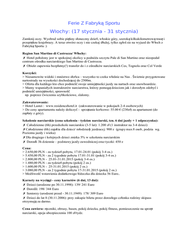 Ferie Z Fabryką Sportu Włochy: (17 stycznia - 31 stycznia) Zamknij oczy. Wyobraź sobie piękny słoneczny dzień, włoskie góry, szeroką kilkukilometrową trasę i przepiękne krajobrazy. A teraz otwórz oczy i nie czekaj d łużej, tylko zg ło ś sie na wyjazd do W łoch z Fabryką Sportu :) Region San Martino di Castrozza/ Włochy: ✗ Hotel położony jest w spokojnej okolicy u podnóża szczytu Pale di San Martino oraz nieopodal centrum ośrodka narciarskiego San Martino di Castrozza. ✗ Obiekt zapewnia bezpłatny(!) transfer do i z ośrodków narciarskich Ces, Tognola oraz Col Verde Korzyści: > Niesamowite widoki i mnóstwo słońca – wszystko to czeka właśnie na Nas . Świetnie przygotowane nartostrady na wysokości dochodzącej do 2500m. > Oferta dla każdego kto chce podnieść swoje umiejętności jazdy na nartach oraz snowboardzie. > Mamy wspaniałych instruktorów narciarstwa, którzy pomogą dzieciom jak i doros łym zdoby ć i podnieść umiejętności, sprawność np. poprzez ćwiczenia szybkościowe, slalomy. Zakwaterowanie: > Hotel Lastei : www.residencehotel.it (zakwaterowanie w pokojach 2-4 osobowych) > Do ceny apartamentu należy doliczyć - sprzątanie końcowe: 55.00 € (230zł) za apartament (do zapłaty z góry). Szkolenie narciarskie (cena szkolenia - tydzien narciarski, tzn. 6 dni jazdy + 1 odpoczynku): ✗ Całodzienne (6h) przedszkole narciarskie (3-5 lat): 1.200 z ł (1 instruktor na 3-4 dzieci) ✗Całodzienne (6h) zajecia ł dla dzieci/ młodziezył jezdzacej: 900 z (grupy max 8 osob, podzia wg. Poziomu jazdy i wieku) ✗Dla drugiego i kolejnych dzieci znizka 5% w szkoleniu narciarskim ✗ Dorosli ł 3h dziennie – podstawy jazdy zawodniczej oraz tyczki: 450 z Cena: > 2.650,00 PLN - za tydzień pobytu, 17.01-24.01 (pokój 3-4 os.) > 5.450,00 PLN - za 2 tygodnie pobytu 17.01-31.01 (pokój 3-4 os.) > 2.800,00 PLN - 25.01-31.01.2015 (pokój 3-4 os.) > 1.480,00 PLN - za tydzień pobytu (pokój 2 os.) > 1.600,00 PLN - 25-31.01.2015 (pokój 2 os.) > 3.080,00 PLN - za 2 tygodnie pobytu 17-31.01.2015 (pokój 2 os.) > Możliwość wstawienia dodatkowego łóżeczka dla dziecka 56 Euro.. Karnety na wyciągi - ceny karnetów (6 dni, 13 dni): ✗ Dzieci (urodzone po 30.11.1998): 139/ 241 Euro ✗ Dorośli: 198/ 344 Euro ✗ Seniorzy (urodzeni przed - 30.11.1949): 178/ 309 Euro ✗ Dzieci do lat 8 (30.11.2006): przy zakupie biletu przez doros łego cz łonka rodziny skipass otrzymują za darmo. Cena zawiera: ręczniki, obrusy, basen, pokój dziecka, pokój fitness, pomieszczenie na sprzęt narciarski, opcja ubezpieczenia 100 zł/tydz. Rezerwacje: [email protected] / tel. +48.515.273.292