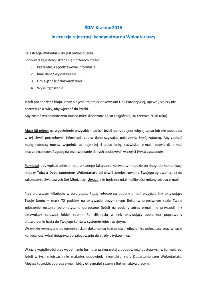 ŚDM Kraków 2016 Instrukcja rejestracji kandydatów na Wolontariuszy Rejestracja Wolontariuszy jest indywidualna. Formularz rejestracji składa się z czterech części: 1. Prezentacja i podstawowe informacje 2. Inne dane/ wykształcenie 3. Umiejętności/ doświadczenie 4. Wyślij zgłoszenie Jeżeli pochodzisz z kraju, który nie jest krajem członkowskim Unii Europejskiej, upewnij się czy nie potrzebujesz wizy, aby wjechać do Polski. Aby zostać wolontariuszem musisz mieć skończone 18 lat (najpóźniej 30 czerwca 2016 roku). Masz 30 minut na wypełnienie wszystkich części. Jeżeli potrzebujesz więcej czasu lub nie posiadasz w tej chwili potrzebnych informacji, zapisz dane używając pola zapisz kopię roboczą. Aby zapisać kopię roboczą musisz wypełnić co najmniej 4 pola: imię, nazwisko, e-mail, potwierdź e-mail oraz zaakceptować zgodę na przetwarzanie danych osobowych w części Wyślij zgłoszenie. Pamiętaj, aby wpisać adres e-mail, z którego faktycznie korzystasz – będzie on służył do komunikacji między Tobą a Departamentem Wolontariatu od chwili zarejestrowania Twojego zgłoszenia, aż do zakończenia Światowych Dni Młodzieży. Uwaga: nie będziesz miał możliwości zmiany adresu e-mail. Przy pierwszym kliknięciu w pole zapisz kopię roboczą na podany e-mail przyjdzie link aktywujący Twoje konto – masz 72 godziny na aktywację otrzymanego linku, w przeciwnym razie Twoje zgłoszenie zostanie automatycznie odrzucone (jeżeli na podany adres e-mail nie przyszedł link aktywujący sprawdź folder spam). Po kliknięciu w link aktywujący zostaniesz poproszony o utworzenie hasła do Twojego konta w systemie rejestracyjnym. Wszystkie wymagane dokumenty (skan dokumentu tożsamości, zdjęcie, list polecający oraz w razie konieczności wiza) dołączysz po zalogowaniu do strefy użytkownika. W razie wątpliwości przy wypełnianiu formularza skorzystaj z podpowiedzi dostępnych w formularzu. Jeżeli w tych miejscach nie znalazłeś odpowiedzi skontaktuj się z Departamentem Wolontariatu. Możesz to zrobić poprzez e-mail, który otrzymałeś razem z linkiem aktywującym. Jeżeli wprowadziłeś wszystkie dane, załączyłeś wszystkie wymagane pliki i upewniłeś się, że wszystkie wprowadzone dane są poprawne – możesz wysłać swoje zgłoszenie używając pola Zapisz i zamknij na końcu formularza rejestracyjnego. Po zapisaniu zgłoszenia nie będziesz miał możliwości edycji swoich danych. Departament Wolontariatu ma około 30 dni na rozpatrzenie kandydatury danej osoby. Jeżeli Twoje zgłoszenie zostanie zaakceptowane, dostaniesz wiadomość na podany przez Ciebie adres e-mail potwierdzający przyjęcie do grona wolontariuszy Światowych Dni Młodzieży. Pamiętaj: każdy Wolontariusz partycypuje w kosztach organizacyjnych ŚDM wpłacając składkę za odpowiednio dla siebie wybrany pakiet wolontariusza (zobacz: http://www.krakow2016.com/pakietpielgrzyma). W każdej chwili będziesz mógł zalogować się do konta w systemie rejestracyjnym – tam będziesz mógł śledzić na jakim etapie jest Twoje zgłoszenie. Prosimy o rzetelne i dokładne odpowiedzi – pozwoli to nam dokładnie ocenić Twoją kandydaturę i przyporządkować do właściwego rodzaju służby podczas Światowych Dni Młodzieży. Jeżeli nie zostaniesz zakwalifikowany do wolontariatu krótkoterminowego możesz zarejestrować się jako pielgrzym. Powodzenia!