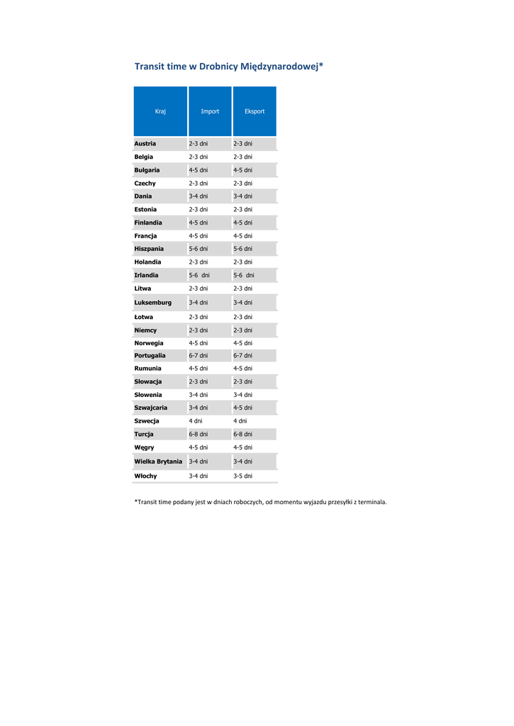 Transit time w Drobnicy Międzynarodowej* Kraj Import Eksport Austria 2-3 dni 2-3 dni Belgia 2-3 dni 2-3 dni Bułgaria 4-5 dni 4-5 dni Czechy 2-3 dni 2-3 dni Dania 3-4 dni 3-4 dni Estonia 2-3 dni 2-3 dni Finlandia 4-5 dni 4-5 dni Francja 4-5 dni 4-5 dni Hiszpania 5-6 dni 5-6 dni Holandia 2-3 dni 2-3 dni Irlandia 5-6 dni 5-6 dni Litwa 2-3 dni 2-3 dni Luksemburg 3-4 dni 3-4 dni Łotwa 2-3 dni 2-3 dni Niemcy 2-3 dni 2-3 dni Norwegia 4-5 dni 4-5 dni Portugalia 6-7 dni 6-7 dni Rumunia 4-5 dni 4-5 dni Słowacja 2-3 dni 2-3 dni Słowenia 3-4 dni 3-4 dni Szwajcaria 3-4 dni 4-5 dni Szwecja 4 dni 4 dni Turcja 6-8 dni 6-8 dni Węgry 4-5 dni 4-5 dni Wielka Brytania 3-4 dni 3-4 dni Włochy 3-4 dni 3-5 dni *Transit time podany jest w dniach roboczych, od momentu wyjazdu przesyłki z terminala.