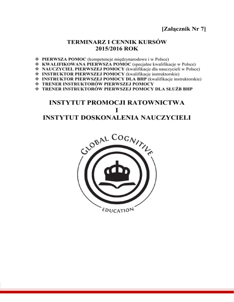 [Załącznik Nr 7] TERMINARZ I CENNIK KURSÓW 2015/2016 ROK PIERWSZA POMOC (kompetencje międzynarodowe i w Polsce) KWALIFIKOWANA PIERWSZA POMOC (specjalne kwalifikacje w Polsce) NAUCZYCIEL PIERWSZEJ POMOCY (kwalifikacje dla nauczycieli w Polsce) INSTRUKTOR PIERWSZEJ POMOCY (kwalifikacje instruktorskie) INSTRUKTOR PIERWSZEJ POMOCY DLA BHP (kwalifikacje instruktorskie) TRENER INSTRUKTORÓW PIERWSZEJ POMOCY TRENER INSTRUKTORÓW PIERWSZEJ POMOCY DLA SŁUŻB BHP INSTYTUT PROMOCJI RATOWNICTWA I INSTYTUT DOSKONALENIA NAUCZYCIELI MIĘDZYNARODOWY KURS PIERWSZEJ POMOCY W systemie edukacyjnym: International First Aid Certification Centre (IFACC) lub Emergency First Response (EFR) MIASTA, TERMINY I CENY WARSZAWA RACIBÓRZ WŁOSZCZOWA RZESZÓW woj. mazowieckie woj. śląskie woj. świętokrzyskie woj. podkarpackie - 29.08.2015 12.09.2015 26.09.2015 17.10.2015 24.10.2015 28.11.2015 21.11.2015 19.12.2015 05.12.2015 - 16.01.2016 20.02.2016 27.02.2016 12.03.2016 19.03.2016 09.04.2016 16.04.2016 07.05.2016 14.05.2016 11.06.2016 18.06.2016 16.07.2016 23.07.2016 SIERPIEŃ 2015 WRZESIEŃ 2015 19.09.2015 PAŹDZIERNIK 2015 10.10.2015 LISTOPAD 2015 GRUDZIEŃ 2015 12.12.2015 STYCZEŃ 2016 23.01.2016 LUTY 2016 MARZEC 2016 05.03.2016 KWIECIEŃ 2016 23.04.2016 MAJ 2016 21.05.2016 CZERWIEC 2016 25.06.2016 LIPIEC 2016 02.07.2016 09.07.2016 CENA KURSU IFACC CENA KURSU EFR 560 zł1 700 zł2 560 zł1 700 zł2 560 zł1 700 zł2 560 zł1 700 zł2 560 zł1 700 zł2 560 zł1 700 zł2 560 zł1 700 zł2 560 zł1 700 zł2 560 zł1 700 zł2 560 zł1 700 zł2 560 zł1 700 zł2 560 zł1 700 zł2 (1) – cena brutto (ostateczna). W cenie: podręcznik w języku polskim (pdf), pełny kurs ze wszystkimi świadczeniami, które opisano w ofercie, certyfikat międzynarodowy IFACC (dyplom IFACC), certyfikat międzynarodowy IFACC (karta plastikowa), zaświadczenie o ukończeniu kursu, wydane zgodnie z obowiązującymi przepisami Ministra Edukacji Narodowej i zgodnie z drukiem MEN-III. (2) – cena brutto (ostateczna). W cenie: podręcznik w języku polskim (drukowany), pełny kurs ze wszystkimi świadczeniami, które opisano w ofercie, certyfikat międzynarodowy (dyplom EFR), certyfikat międzynarodowy EFR (karta plastikowa). KURS KWALIFIKOWANEJ PIERWSZEJ POMOCY Z UZYSKANIEM TYTUŁU RATOWNIKA I/LUB INSTRUKTORA PIERWSZEJ POMOCY zgodnie z przepisami określonymi przez Ministra Zdrowia RP i kwalifikacjami międzynarodowymi IFACC Kurs jest dostępny dla osób, które współpracują z jednostkami systemu ratownictwa w Polsce, tj. ratownicy wodni, ratownicy nurkowi, policja, straż pożarna, OSP inne podmioty wpisane do systemu ratownictwa w RP. Wymagane jest skierowanie lub stosowne zaświadczenie. MIASTA, TERMINY I CENY WARSZAWA RACIBÓRZ woj. mazowieckie woj. śląskie WŁOSZCZOWA woj. świętokrzyskie RZESZÓW woj. podkarpackie CENA KURSU KPP CENA KURSU KPP + CERTYFIKAT MIĘDZYNARODOWY RATOWNIKA PIERWSZEJ POMOCY IFACC CENA KURSU KPP + KURS INSTRUKTORA PIERWSZEJ POMOCY IFACC - 25.08.2015 30.08.2015 - SIERPIEŃ 2015 - 700 zł1 790 zł2 1.950 zł3 08.09.2015 13.09.2015 22.09.2015 27.09.2015 - WRZESIEŃ 2015 - 700 zł1 790 zł2 1.950 zł3 13.10.2015 18.10.2015 20.10.2015 25.10.2015 - 700 zł1 790 zł2 1.950 zł3 24.11.2015 29.11.2015 17.11.2015 22.11.2015 - PAŹDZIERNIK 2015 06.10.2015 11.10.2015 LISTOPAD 2015 - 700 zł1 790 zł2 1.950 zł3 15.12.2015 20.12.2015 01.12.2015 06.12.2015 - GRUDZIEŃ 2015 - 700 zł1 790 zł2 1.950 zł3 - 12.01.2016 17.01.2016 - 700 zł1 790 zł2 1.950 zł3 16.02.2016 21.02.2016 23.02.2016 28.02.2016 - 700 zł1 790 zł2 1.950 zł3 08.03.2016 13.03.2016 15.03.2016 20.03.2016 01.03.2016 06.03.2016 700 zł1 790 zł2 1.950 zł3 05.04.2016 10.04.2016 12.04.2016 17.04.2016 700 zł1 790 zł2 1.950 zł3 03.05.2016 08.05.2016 10.05.2016 15.05.2016 700 zł1 790 zł2 1.950 zł3 07.06.2016 12.06.2016 14.06.2016 19.06.2016 700 zł1 790 zł2 1.950 zł3 12.07.2016 17.07.2016 19.07.2016 24.07.2016 700 zł1 790 zł2 1.950 zł3 STYCZEŃ 2016 19.01.2016 24.01.2016 LUTY 2016 MARZEC 2016 - KWIECIEŃ 2016 19.04.2016 24.04.2016 MAJ 2016 17.05.2016 22.05.2016 CZERWIEC 2016 21.06.2016 26.06.2016 LIPIEC 2016 28.06.2016 05.07.2016 03.07.2016 10.07.2016 - (1) – cena brutto (ostateczna). Pełny kurs ze wszystkimi świadczeniami, które opisano w ofercie, zaświadczenie zgodne z przepisami Ministra Zdrowia RP. (2) – cena brutto (ostateczna). W cenie: podręcznik w języku polskim (pdf), pełny kurs ze wszystkimi świadczeniami, które opisano w ofercie, zaświadczenie ukończenia kursu KPP z tytułem ratownika, zgodnie z przepisami Ministra Zdrowia RP, dodatkowy certyfikat międzynarodowy ratownika pierwszej pomocy – First Aider (dyplom IFACC), certyfikat międzynarodowy ratownika pierwszej pomocy - First Aider (karta plastikowa). (3) - cena brutto (ostateczna). W cenie: podręcznik w języku polskim (pdf), podręcznik profesjonalisty IFACC, pełny kurs ze wszystkimi świadczeniami, które opisano w ofercie, zaświadczenie ukończenia kursu KPP z tytułem ratownika, zgodnie z przepisami Ministra Zdrowia RP, dodatkowy certyfikat międzynarodowy Instruktora Pierwszej Pomocy – First Aid Instructor (dyplom IFACC), certyfikat międzynarodowy instruktora pierwszej pomocy - First Aid Instructor (karta plastikowa). Po kursie – dostęp do wszystkich materiałów edukacyjnych IFACC (prezentacje multimedialne, testy, klucze odpowiedzi, druki, system kształcenia, standardy kształcenia, wsparcie w j. polskim przez Przedstawicielstwo w Polsce). Możliwość prowadzenia licencjonowanych przez IFACC kursów pierwszej pomocy. PAŃSTWOWE SZKOLENIE DLA NAUCZYCIELI UPRAWNIAJĄCE DO NAUCZANIA PIERWSZEJ POMOCY NA III I IV ETAPIE EDUKACJI zgodnie z przepisami określonymi przez Ministra Zdrowia RP i kwalifikacjami międzynarodowymi IFACC Kurs jest dostępny dla osób ,które są nauczycielami lub posiadają ukończone studia wyższe i kwalifikacje pedagogiczne. MIASTA, TERMINY I CENY WŁOSZCZOWA woj. świętokrzyskie woj. podkarpackie 29.08.2015 30.08.201