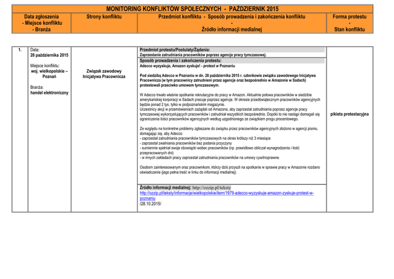 MONITORING KONFLIKTÓW SPOŁECZNYCH - PAŹDZIERNIK 2015 Data zgłoszenia - Miejsce konfliktu - Branża 1. Strony konfliktu Data: 28 października 2015 Miejsce konfliktu: woj. wielkopolskie – Poznań Branża: handel elektroniczny Przedmiot konfliktu - Sposób prowadzenia i zakończenia konfliktu Źródło informacji medialnej Forma protestu Stan konfliktu Przedmiot protestu/Postulaty/Żądania: Zaprzestanie zatrudniania pracowników poprzez agencje pracy tymczasowej. Sposób prowadzenia i zakończenia protestu: Adecco wyzyskuje, Amazon zyskuje! - protest w Poznaniu Związek zawodowy Inicjatywa Pracownicza Pod siedzibą Adecco w Poznaniu w dn. 28 października 2015 r. członkowie związku zawodowego Inicjatywa Pracownicza (w tym pracownicy zatrudnieni przez agencje oraz bezpośrednio w Amazonie w Sadach) protestowali przeciwko umowom tymczasowym. W Adecco trwało właśnie spotkanie rekrutacyjne do pracy w Amazon. Aktualnie połowa pracowników w siedzibie amerykańskiej korporacji w Sadach pracuje poprzez agencje. W okresie przedświątecznym pracowników agencyjnych będzie ponad 2 tys. tylko w podpoznańskim magazynie. Uczestnicy akcji w przemówieniach zażądali od Amazona, aby zaprzestał zatrudniania poprzez agencje pracy tymczasowej wykorzystujących pracowników i zatrudniał wszystkich bezpośrednio. Dopóki to nie nastąpi domagali się ograniczenia ilości pracowników agencyjnych według uzgodnionego ze związkiem progu procentowego. Ze względu na konkretne problemy zgłaszane do związku przez pracowników agencyjnych złożono w agencji pismo, domagając się, aby Adecco: - zaprzestał zatrudniania pracowników tymczasowych na okres krótszy niż 3 miesiące - zaprzestał zwalniania pracowników bez podania przyczyny - sumiennie spełniał swoje obowiązki wobec pracowników (np. prawidłowo obliczał wynagrodzenia i ilość przepracowanych dni) - w innych zakładach pracy zaprzestał zatrudniania pracowników na umowy cywilnoprawne. Osobom zainteresowanym oraz pracownikom, którzy dziś przyszli na spotkanie w sprawie pracy w Amazonie rozdano oświadczenie (jego pełna treść w linku do informacji medialnej). Źródło informacji medialnej: http://ozzip.pl/teksty http://ozzip.pl/teksty/informacje/wielkopolskie/item/1979-adecco-wyzyskuje-amazon-zyskuje-protest-wpoznaniu /28.10.2015/ pikieta protestacyjna MONITORING KONFLIKTÓW SPOŁECZNYCH - PAŹDZIERNIK 2015 Data zgłoszenia - Miejsce konfliktu - Branża 2. Strony konfliktu Data: 27 października 2015 Miejsce konfliktu: woj. śląskie – Dąbrowa Górnicza Branża: hutnictwo Przedmiot konfliktu - Sposób prowadzenia i zakończenia konfliktu Źródło informacji medialnej Forma protestu Stan konfliktu Przedmiot protestu/Postulaty/Żądania: Plany zwolnień grupowych w zakładzie i cięcia wynagrodzeń. Sposób prowadzenia i zakończenia protestu: Protest przeciwko zwolnieniom w Hucie Bankowa Związki zawodowe z Huty Bankowa w Dąbrowie Górniczej Związki zawodowe z Huty Bankowa w Dąbrowie Górniczej zapowiadają protesty przeciwko Związki zawodowe z Huty Bankowa w Dąbrowie Górniczej zapowiadają protesty przeciwko planowanym w zakładzie zwolnieniom grupowym i cięciom wynagrodzeń. Do końca stycznia 2016 roku zatrudnienie w hucie ma stracić 100 pracowników, a płace reszty załogi mają zostać obniżone średnio o 300 zł. Do końca stycznia 2016 roku zatrudnienie w hucie ma stracić 100 pracowników, a płace reszty załogi mają zostać obniżone średnio o 300 zł. 29 września zarząd Huty Bankowa oficjalnie poinformował zakładowe związki zawodowe o zamiarze przeprowadzenia w przedsiębiorstwie zwolnień grupowych. Pracodawca przekazał też informację o planowanej zmianie warunków zatrudnienia wszystkim pracownikom, którzy pozostaną w zakładzie oraz o zamiarze zawieszenia im dodatkowych świadczeń, m.in. nagrody jubileuszowej i Karty Hutnika. Pracodawca jako przyczynę zwolnień wskazał kryzys w branży metalurgicznej i brak rynków zbytu na wyroby produkowane przez hutę. Poinformował też, że redukcja zatrudnienia spowodowana jest koniecznością dostosowania liczby pracowników do tonażu produkcji. Związkowcy z kolei argumentowali, że ich zdaniem zwolnienia są nieuzasadnione, bo dla uzupełnienia braków osobowych do pracy w hucie wciąż przyjmowani są ludzie z firm zewnętrznych. - Dla nas najważniejsze jest ratowanie miejsc pracy. Dlatego zaproponowaliśmy, że zgodzimy się na zawieszenie jubilata i Kary Hutnika, ale pod warunkiem, że zarząd odstąpi od zwolnień grupowych. Pracodawca stanowczo odrzucił to rozwiązanie. Nie odpowiedział też na nasze pytanie: na co został przeznaczony kilkumilionowy zysk, który nasi ludzie wypracowali w latach 2011-2013. W tej sytuacji nie zgodziliśmy się na zawieszenie dodatkowych świadczeń - mówi Henryk Myrda, przewodniczący zakładowej Solidarności. Myrda podkreśla, że już 30 września zarząd huty skierował do Powiatowego Urzędu Pracy w Dąbrowie górniczej informację o zwolnieniach grupowych w zakładzie. W założeniach pracodawcy do końca stycznia z pracę ma zostać zwolnionych 100 osób. Wśród nich będzie 70 pracowników produkcyjnych, 15 pracowników pomocniczych oraz 15 pracowników administracji. - Aby dać osobom zwalnianym trzymiesięczne odprawy, pracodawca postanowił zabrać pieniądze tym pracownikom, którzy w hucie pozostaną. Cała załoga ma otrzymać tzw. wypowiedzenia zmieniające. Pracownicy mają zarabiać średnio o 300 zł brutto mniej - informuje przewodniczący. Źródło informacji medialnej: http://www.solidarnosc.org.pl/ http://www.solidarnosc.org.pl/aktualnosci/wiadomosci/regiony/item/11952-protest-przeciwko-zwolnieniom-whucie-bankowa /27.10.2015/ zapowiedź protestu MONITORING KONFLIKTÓW SPOŁECZNYCH - PAŹDZIERNIK 2015 Data zgłoszenia - Miejsce konfliktu - Branża 3. Strony konfliktu Data: 27 października 2015 Miejsce konfliktu: woj. śląskie – Rybnik Branża: ochrona zdrowia Przedmi