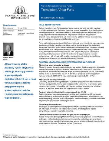 Franklin Templeton Investment Funds Wartość Templeton Africa Fund Charakterystyka funduszu CELE INWESTYCYJNE Dane funduszu Data założenia 4 maja 2012 r. Styl inwestycyjny Wartość Indeks porównawczy Dow Jones Titans Africa 50 Index Dr Mark Mobius Prezes „Wierzymy, że słabo zbadany rynek afrykański zanotuje znaczący wzrost w perspektywie najbliższych 5-10 lat, a nasz fundusz będzie dobrze przygotowany na wykorzystanie zysków i potencjału wzrostowego tego regionu”. Celem inwestycyjnym Funduszu jest generowanie wzrostu wartości kapitału w długiej perspektywie. Fundusz inwestuje przede wszystkim w akcje i/lub inne papiery powiązane z kapitałem spółek o dowolnej kapitalizacji rynkowej, które (i) są zarejestrowane lub notowane na giełdach w krajach afrykańskich oraz/lub (ii) są zarejestrowane lub notowane na giełdzie w innej części świata, ale prowadzą swą kluczową działalność w Afryce. Ponieważ większe prawdopodobieństwo realizacji celu inwestycyjnego zapewnia elastyczna polityka inwestycyjna, którą można dostosowywać do bieżących warunków, Fundusz może także inwestować w innego rodzaju zbywalne papiery wartościowe, m.in. akcje i instrumenty o stałym dochodzie z całego świata. Fundusz może również inwestować do 10% swych aktywów w papiery lub produkty strukturyzowane, w których instrumenty są powiązane z innymi instrumentami lub ich wartość wynika z wartości innych instrumentów lub są powiązane z aktywami lub walutami dowolnych krajów. POWODY UZASADNIAJĄCE INWESTOWANIE W FUNDUSZ Atrakcyjne stopy wzrostu w Afryce Afryka to bardzo dynamicznie rozwijający się region. Sześcioma wśród dziesięciu najszybciej rosnących gospodarek na świecie w latach 2001-2010 były kraje afrykańskie. Wzrost PKB w krajach Afryki Subsaharyjskiej za 2013 r. szacowany jest na 4,7%, w porównaniu z 3,5% w 2012 r., a prognozy przewidują stopy 1 wzrostu w latach 2014 i 2015 na poziomie odpowiednio 5,3% i 5,4% . Afrykańskie zasoby surowców Uważamy, że afrykańskie gospodarki są dobrze przygotowane do budowania wzrostu w przyszłości, biorąc pod uwagę zasoby surowców, w tym ropy, gazu, różnorodnych metali i minerałów, jak również rozległą powierzchnię użytków rolnych; te atuty są atrakcyjne dla inwestorów z całego świata. Rosnący strumień inwestycji napływających do Afryki Dzięki rosnącym inwestycjom dużych rynków wschodzących w Afryce, coraz więcej pieniędzy przeznaczanych jest na projekty związane z infrastrukturą, np. na budowę dróg, mostów, szkół czy szpitali, które także będą pracować dla dobra afrykańskich gospodarek w kolejnych latach. Przemiany demograficzne Inwestycje przyniosą korzyści dla populacji Afryki, a zmiany w takich obszarach, jak edukacja, mobilność czy dostęp do kapitału, przełożą się na lepsze perspektywy i wzrost wydajności produkcji. Doświadczenie w inwestowaniu na rynkach wschodzących Zespół Templeton Emerging Markets Group, kierowany przez dr. Marka Mobiusa (jednego z najbardziej doświadczonych inwestorów, działającego na rynkach wschodzących od ponad 40 lat), pozostaje wierny tej samej filozofii inwestycyjnej, którą stworzył Sir John Templeton ponad 70 lat temu. 1. Źródło: Bank Światowy. Wyłącznie do użytku dystrybutorów i pośredników instytucjonalnych. Nie rozpowszechniać wśród inwestorów indywidualnych Templeton Africa Fund FILOZOFIA I PROCES INWESTYCYJNY Krok 2: Szczegółowa analiza fundamentalna Fundusz zarządzany jest zgodnie z filozofią inwestycyjną Templetona i strategią, którą wdrażamy niezmiennie od uruchomienia naszych portfeli rynków wschodzących w 1987 r. Jest ona oparta na trzech filarach, które uważamy za kluczowe dla skutecznego długofalowego inwestowania. Są to: Proces inwestycyjny Templetona oparty jest na szczegółowej analizie fundamentalnej. Nasi analitycy doskonale znają zarówno globalny rynek, jak i lokalne rynki, za które są odpowiedzialni. Takie podejście do badań poszczególnych branż, sektorów i rynków daje nam kompleksową perspektywę. Wartość. Naszym celem jest określanie faktycznej wartości spółek i szacowanie zysków i przepływów pieniężnych, jakie mogą wygenerować ich aktywa. Poprzez nasze badania, identyfikujemy akcje dostępne po zaniżonych cenach wobec określonej przez nas ich rzeczywistej wartości. Jako inwestorzy skoncentrowani na wartości i przyjmujący długi horyzont inwestycyjny, skupiamy się na zrównoważonych zyskach i poszukujemy atrakcyjnych możliwości we wszystkich sektorach i na wszystkich rynkach na całym świecie. Analitycy Templetona prowadzą rygorystyczną analizę fundamentalną wszystkich potencjalnych pomysłów nowych inwestycji, w celu zweryfikowania, czy dane udziały dostępne są z odpowiednim rabatem do realnej wartości spółki w znormalizowanej pięcioletniej perspektywie. Analiza obejmuje szczegółową ocenę sprawozdań finansowych wybranej spółki, a w szczególności takich czynników, jak cena do zysków, cena do przepływów pieniężnych, zadłużenie do kapitału własnego, cena do wartości księgowej czy dochód z dywidendy, a także kapitalizacja rynkowa i płynność. Oceniamy także konkurencyjność spółki na tle przedsiębiorstw o podobnym charakterze oraz przeprowadzamy analizę jakości zarządu, struktury własności, ładu korporacyjnego oraz zaangażowania w budowanie wartości dla akcjonariuszy. W tym celu odwiedzamy 850-1000 spółek rocznie, spotykając się z zarządami przedsiębiorstw, a także ich konkurentami, dostawcami i klientami. Cierpliwość. Na rynkach akcji często dominuje krótkowzroczność i wpływ chwilowych emocji inwestorów, co prowadzi do krótkoterminowych silnych wahań cen papierów. Długoterminowe podejście Templetona umożliwia nam ignorowanie krótkotrwałych zawirowań rynkowych i skupienie się na fundamentalnej wartości poszczególnych udziałów. Poprzez skrupulatne