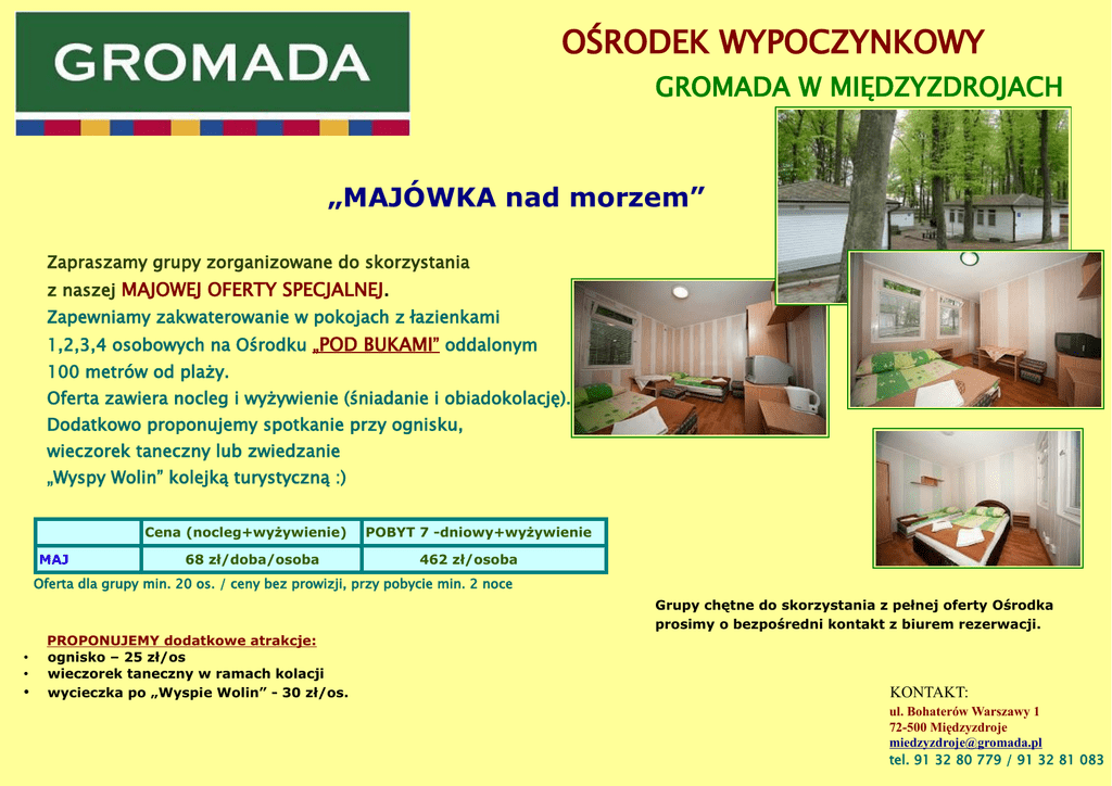 OŚRODEK WYPOCZYNKOWY GROMADA W MIĘDZYZDROJACH „MAJÓWKA nad morzem” Zapraszamy grupy zorganizowane do skorzystania z naszej MAJOWEJ OFERTY SPECJALNEJ. Zapewniamy zakwaterowanie w pokojach z łazienkami 1,2,3,4 osobowych na Ośrodku „POD BUKAMI” oddalonym 100 metrów od plaży. Oferta zawiera nocleg i wyżywienie (śniadanie i obiadokolację). Dodatkowo proponujemy spotkanie przy ognisku, wieczorek taneczny lub zwiedzanie „Wyspy Wolin” kolejką turystyczną :) Cena (nocleg+wyżywienie) MAJ 68 zł/doba/osoba POBYT 7 -dniowy+wyżywienie 462 zł/osoba Oferta dla grupy min. 20 os. / ceny bez prowizji, przy pobycie min. 2 noce Grupy chętne do skorzystania z pełnej oferty Ośrodka prosimy o bezpośredni kontakt z biurem rezerwacji. • • • PROPONUJEMY dodatkowe atrakcje: ognisko – 25 zł/os wieczorek taneczny w ramach kolacji wycieczka po „Wyspie Wolin” - 30 zł/os. KONTAKT: ul. Bohaterów Warszawy 1 72-500 Międzyzdroje [email protected] tel. 91 32 80 779 / 91 32 81 083 DOMKI SZEREGOWE OŚRODEK WYPOCZYNKOWY „POD TOPOLAMI” „MAJÓWKA nad morzem” Ośrodek oddalony od plaży 250 metrów. Stołówka znajduję się na ośrodku głównym „Pod Bukami” w odległości 150 metrów. Oferta zawiera nocleg i wyżywienie (śniadanie i obiadokolację). ZAKWATEROWANIE: – pokoje w domkach szeregowych 2 i 3 osobowych z łazienką (wyposażenie: telewizor, czajnik elektryczny, ręcznik kąpielowy, koc) – pokoje w domkach góralskich typu „Tatraniec” ze wspólną łazienką (wyposażenie: telewizor, ręcznik kąpielowy, koc) Bezpłatny dostęp do sieci WiFi. W wolnym czasie można skorzystać z boiska do siatkówki, zorganizować spotkanie przy ognisku lub dyskotekę na świetlicy. W niewielkiej odległości od ośrodka znajduje się stadion miejski, basen, korty tenisowe, trasy biegowe. MAJ Cena (nocleg+wyżywienie) POBYT 7 -dniowy+wyżywienie DOMKI SZEREGOWE 63 zł/doba/osoba 427 zł/osoba TATRANIEC 57 zł/doba/osoba 392 zł/osoba Oferta dla grupy min. 20 os. / ceny bez prowizji, przy pobycie min. 2 noce TATRANIEC