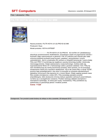 SFT Computers Utworzono: czwartek, 29 listopad 2012 Foto > akcesoria > filtry FILTR HOYA UV (0) PRO1D 62 MM Nazwa produktu: FILTR HOYA UV (0) PRO1D 62 MM Producent: Hoya Model produktu: HOYA-UVPD62P FILTR HOYA UV (0) PRO1D 62 mmFiltr UV (ultrafioletowy) absorbuje promieniowanie ultrafioletowe, prowadzące często do pogorszenia ostrości i kontrastu zdjęć wykonywanych w plenerze. Filtr UV polecany jest również jako stała ochrona przedniej soczewki przed kurzem, piaskiem, zarysowaniem i innymi uszkodzeniami. Jest to uniwersalny filtr zarówno w fotografii barwnej jak i czarno-białej. Filtry serii PRO1 D wyróżniają się wyjątkowo wysoką transmisją światła i doskonałą równowagą kolorów. Dzięki zastosowaniu nowej technologii, możliwe stało się, wyprodukowanie filtrów UV z hartowanego szkła o grubości zaledwie 1mm. Filtry tej serii charakteryzują się cienką aluminiową oprawką, która sprawia, że nie powodują winietowania nawet przy szerokich obiektywach. Są to tak zwane filtry w wersji "SLIM", pomimo tego posiadają gwint z obu stron co pozwala na używanie standardowych dekielków ochronnych oraz łączenie ich z innymi filtrami. Dzięki wąskiej oprawie masa filtra została zmniejszona o około 40%. Filtry posiadają specjalne powłoki antyrefleksyjne, które skutecznie chronią matryce aparatów cyfrowych przed blinkami, na które są w szczególności narażone. Powłoki redukują odblaski zewnętrzne i wewnętrzne sprawiając, że obraz jest czysty i kontrastowy. Filtry powlekane są wielokrotnie co gwarantuje jakość i trwałość powłok. Cena: 112zł Dostępność: Ten produkt został dodany do sklepu w dniu czwartek, 29 listopad 2012 http://sft.net.pl | [email protected] | | Strona 1/1
