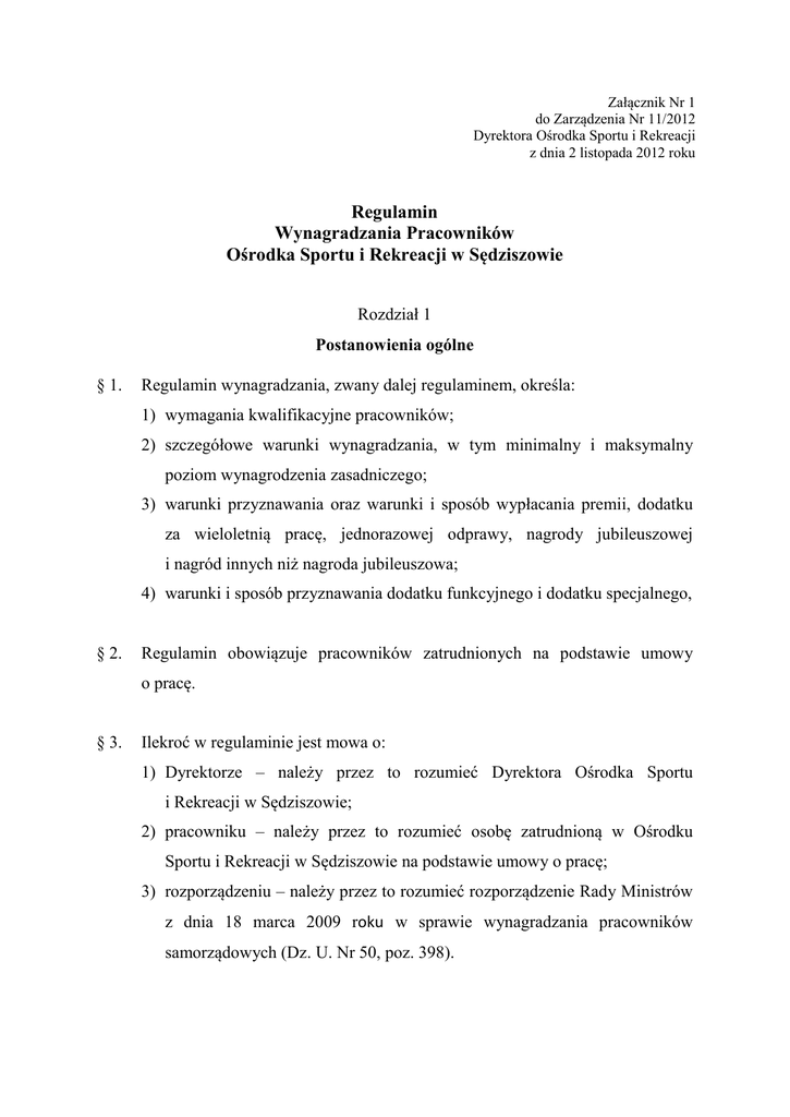 Załącznik Nr 1 do Zarządzenia Nr 11/2012 Dyrektora Ośrodka Sportu i Rekreacji z dnia 2 listopada 2012 roku Regulamin Wynagradzania Pracowników Ośrodka Sportu i Rekreacji w Sędziszowie Rozdział 1 Postanowienia ogólne § 1. Regulamin wynagradzania, zwany dalej regulaminem, określa: 1) wymagania kwalifikacyjne pracowników; 2) szczegółowe warunki wynagradzania, w tym minimalny i maksymalny poziom wynagrodzenia zasadniczego; 3) warunki przyznawania oraz warunki i sposób wypłacania premii, dodatku za wieloletnią pracę, jednorazowej odprawy, nagrody jubileuszowej i nagród innych niż nagroda jubileuszowa; 4) warunki i sposób przyznawania dodatku funkcyjnego i dodatku specjalnego, § 2. Regulamin obowiązuje pracowników zatrudnionych na podstawie umowy o pracę. § 3. Ilekroć w regulaminie jest mowa o: 1) Dyrektorze – należy przez to rozumieć Dyrektora Ośrodka Sportu i Rekreacji w Sędziszowie; 2) pracowniku – należy przez to rozumieć osobę zatrudnioną w Ośrodku Sportu i Rekreacji w Sędziszowie na podstawie umowy o pracę; 3) rozporządzeniu – należy przez to rozumieć rozporządzenie Rady Ministrów z dnia 18 marca 2009 roku w sprawie wynagradzania pracowników samorządowych (Dz. U. Nr 50, poz. 398). Rozdział 2 Wymagania kwalifikacyjne pracowników § 4. Określa się wymagania kwalifikacyjne pracowników – wykształcenie, umiejętności zawodowe oraz staż pracy w latach zgodnie z Załącznikiem Nr 1 do regulaminu, oraz szczegółowe wymogi kompetencyjne dla podstawowych rodzin stanowisk w Ośrodku Sportu i Rekreacji – Załącznik Nr 2 do regulaminu. Rozdział 3 Szczegółowe warunki wynagradzania § 5. 1. Szczegółowe warunki wynagradzania, w tym minimalny poziom wynagrodzenia zasadniczego określa Załącznik Nr 1 do regulaminu. 2. Decyzję o ustaleniu dla danego pracownika wysokości wynagrodzenia, podejmuje Dyrektor. § 6. Minimalne i maksymalne kwoty w złotych miesięcznego poziomu wynagrodzenia zasadniczego określa Załącznik Nr 3 do regulaminu. § 7. Stawkę godzinową: 1) wynagrodzenia zasadniczego wynikającego z osobistego zaszeregowania pracownika, określonego stawką miesięczną, 2) wynikającą z najniższego wynagrodzenia zasadniczego, ustala się dzieląc miesięczną stawkę wynagrodzenia przez liczbę godzin pracy przypadających do przepracowania w danym miesiącu. § 8. Pracownikom zatrudnionym w niepełnym wymiarze czasu pracy przysługuje wynagrodzenie zasadnicze i inne składniki wynagrodzenia – w wysokości proporcjonalnej do wymiaru czasu pracy określonego w umowie o pracę. § 9. 1. Pracownikowi z racji wykonywania zadań mogą przysługiwać inne wynagrodzenia wynikające z ustalonych dodatków lub wykonywania zawartych umów o dzieło lub zlecenia czy innych przewidzianych powszechnie obowiązującymi przepisami prawa (np. realizacji projektów unijnych). 2. Wymienione wyżej dodatkowe wynagrodzenie przyznawane jest i wypłacane według uregulowań prawnych i ustanawiających. Rozdział 4 Warunki przyznawania oraz warunki i sposób wypłacania premii § 10. 1. Pracownikom zatrudnionym na stanowiskach pomocniczych i obsługi może być przyznana premia za zaangażowanie w realizację powierzonych zadań OSiR. 2. Premię przyznaje Dyrektor. Pracownicy nie mają obowiązku indywidualnego składania wniosku o przyznanie premii. 3. Roczny fundusz premiowy tworzy się w wysokości do 20% planowanego Funduszu Płac Wynagrodzeń osobowych pracowników i jest uruchamiany w ramach posiadanych środków finansowych na wynagrodzenia. 4. Przyznanie i wysokość premii zależy od indywidualnej oceny każdego pracownika. 5. Maksymalna wysokość indywidualnej premii pracownika nie może przekroczyć 50% jego wynagrodzenia zasadniczego za miesiąc, za który przysługuje premia, tj. płaca zasadnicza oraz dodatek funkcyjny lub specjalny, jeżeli taki przysługuje na danym stanowisku. 6. Warunkiem otrzymania premii jest: 1) terminowe, sumienne i rzetelne wykonywanie zadań określonych w indywidualnym zakresie czynności i obowiązków oraz poleceń bezpośredniego przełożonego; 2) zaangażowanie, przejawianie inicjatywy w zakresie realizacji zadań zakładu przez pracowników; 3) dbałość o obiekty, urządzenia, narzędzia i środki powierzone pracownikom, jak również o ład i porządek w zakładzie pracy; 4) oszczędne gospodarowanie materiałami i dążenie do obniżenia kosztów na powierzonym stanowisku pracy; 5) nienaganne zachowanie się w pracy; 6) przestrzeganie przepisów bhp i przeciwpożarowych; 7) przestrzeganie Regulaminu pracy; 8) obsługa klientów z zachowaniem należytej staranności o ich zadowolenie z zakupionej usługi. 7. Pracownikowi można nie przyznać premii, jeżeli nie spełni choćby jednej z przesłanek określonych w ust. 6. 8. Premia ma charakter uznaniowy i brak jej uruchomienia przez pracodawcę nie rodzi roszczeń jej wypłaty. 9. Pracownicy są automatycznie pozbawiani prawa do premii w przypadku: a) stawienia się do pracy w stanie nietrzeźwym lub po spożyciu alkoholu w miejscu pracy, b) nieusprawiedliwionej nieobecności w pracy, trwającej dłużej niż 1 dzień. 10. Obniżenie lub pozbawienie premii nie stanowi kary i może mieć miejsce niezależnie od udzielenia pracownikowi kar regulaminowych lub rozwiązania umowy o pracę z winy pracownika. 11. Decyzję w sprawie obniżenia lub pozbawienia premii podejmuje pracodawca, z wyjątkiem sytuacji, gdy pozbawienie premii następuje automatycznie. 12. Wypłata premii może być wypłacona za okres miesiąca, za kwartał, za półrocze, lub za rok w terminie wypłaty wynagrodzenia. Rozdział 5 Warunki i sposób wypłacania dodatku za wieloletnią pracę oraz jednorazowej odprawy § 11. 1. Dodatek za wieloletnią pracę, zwany dalej „dodatkiem” przysługuje po pięciu latach pracy w wysokości 5% miesięcznego wynagrodzenia zasadniczego. Dodatek ten wzrasta za każdy kolejny rok pracy o 1% aż do osiągnięcia 20% miesięcznego wynagrodz