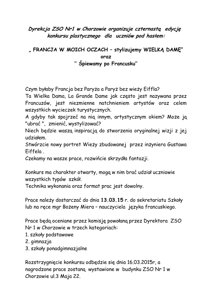 Dyrekcja ZSO Nr1 w Chorzowie organizuje czternastą edycję konkursu plastycznego dla uczniów pod hasłem: „ FRANCJA W MOICH OCZACH – stylizujemy WIELKĄ DAMĘ” oraz ‘’ Śpiewamy po Francusku‘’ Czym byłaby Francja bez Paryża a Paryż bez wieży Eiffla? Ta Wielka Dama, La Grande Dame jak często jest nazywana przez Francuzów, jest niezmienne natchnieniem artystów oraz celem wszystkich wycieczek turystycznych. A gdyby tak spojrzeć na nią innym, artystycznym okiem? Może ją "ubrać ", zmienić, wystylizować? Niech będzie waszą inspiracją do stworzenia oryginalnej wizji z jej udziałem. Stwórzcie nowy portret Wieży zbudowanej przez inżyniera Gustawa Eiffela . Czekamy na wasze prace, rozwińcie skrzydła fantazji. Konkurs ma charakter otwarty, mogą w nim brać udział uczniowie wszystkich typów szkół. Technika wykonania oraz format prac jest dowolny. Prace należy dostarczać do dnia 13.03.15 r. do sekretariatu Szkoły lub na ręce mgr Bożeny Miera – nauczyciela języka francuskiego. Prace będą oceniane przez komisję powołaną przez Dyrektora ZSO Nr 1 w Chorzowie w trzech kategoriach: 1. szkoły podstawowe 2. gimnazja 3. szkoły ponadgimnazjalne Rozstrzygnięcie konkursu odbędzie się dnia 16.03.2015r, a nagrodzone prace zostaną wystawione w budynku ZSO Nr 1 w Chorzowie ul.3 Maja 22. Na zwycięzców czekają atrakcyjne nagrody . Prace nadesłane na konkurs nie będą zwracane uczestnikom. Wręczenie nagród laureatom odbędzie się 19.03.2015 o godz.12. Laureaci zostaną powiadomieni telefonicznie lub za pośrednictwem poczty elektronicznej. Tradycyjnie rozstrzygnięciu konkursu plastycznego będzie towarzyszył konkurs piosenki pod nazwą „ Śpiewamy po francusku ” Regulamin: Konkurs ma na celu propagowanie piosenki wykonywanej w języku francuskim oraz ukazanie piękna oraz bogactwa tego języka I. Konkurs odbędzie się w trzech kategoriach wiekowych: 1. Szkoły podstawowe 2. Szkoły gimnazjalne 3. Szkoły ponadgimnazjalne II. Przedmiotem konkursu jest wykonanie piosenki w języka francuskim . III. Uczestnicy konkursu będą oceniani wg następujących kryteriów: 1. Wrażenie artystyczne i oryginalność prezentacji. 2. Poprawność językowa. IV .Konkurs odbędzie się w budynku ZSO Nr1 w Chorzowie w dniu 19 marca 2015 r. o godz.12.00 V. Uczestników konkursu oceni komisja powołana przez Dyrektora ZSO Nr 1 w Chorzowie. VI. Dla zwycięzców konkursu przewidziane są nagrody. VII. Zgłoszenia do konkursu przyjmowane będą do 13 marca 2015 roku. VIII. Uczniowie, którzy zostaną Laureatami konkursów otrzymują dodatkowe punkty w rekrutacji do Liceum oraz do Gimnazjum nr 3 im. K. Makuszyńskiego. Prosimy przysyłać zgłoszenia wg następującego wzoru. Zgłoszenie do konkursu piosenki francuskiej ” Śpiewamy po francusku” Pieczątka szkoły Data 1. 2. 3. 4. Wykonawca Tytuł i autor piosenki Czas trwania utworu Wymagania sprzętowe ( magnetofon, odtwarzacz CD, mikrofon etc) 5. Opiekun wykonawcy 6. Telefon kontaktowy z opiekunem Pieczątka Dyrektora Zgłoszenia można przesłać na adres: ZSO nr 1 w Chorzowie ul. 3 Maja 22 41-500 Chorzów lub przesyłać faksem: 032 2411-719 Kontakt oraz dodatkowe pytania prosimy kierować pod numer telefonu 032 2 411-711 Osoba odpowiedzialna mgr Bożena Miera nauczyciel języka francuskiego: [email protected] Serdecznie zapraszamy do udziału !