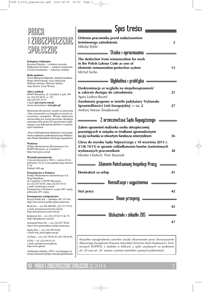 PiZS 8_2014_poprawiony.qxd 2014-08-20 09:50 Page 1 Spis treœci Ochrona pracownika przed nadużywaniem terminowego zatrudnienia Mikołaj Rylski 2 Studia i opracowania Kolegium redakcyjne Krzysztof Rączka — redaktor naczelny Małgorzata Gersdorf — redaktor tematyczny Urszula Joachimiak — sekretarz redakcji Rada naukowa Teresa Bińczycka-Majewska, Andriej Łusznikow, Helga Oberloskamp, Jerzy Oniszczuk, Walerian Sanetra, Marlene Schmit, Anja Steiner, Jerzy Wratny Adres redakcji 00-099 Warszawa, ul. Canaletta 4, pok. 305 tel. (22) 827 80 01, w. 372 faks (22) 827 55 67 e-mail: [email protected] strona internetowa: www.pizs.pl Informacje dla autorów, zasady recenzowania i lista recenzentów są dostępne na stronie internetowej czasopisma. Wersja drukowana miesięcznika jest wersją pierwotną. Redakcja zastrzega sobie prawo do opracowania redakcyjnego oraz dokonywnia skrótów w nadesłanych artykułach. „Praca i Zabezpieczenie Społeczne” jest czasopismem naukowym punktowanym przez Ministerstwo Nauki i Szkolnictwa Wyższego (6 punktów). Wydawca Polskie Wydawnictwo Ekonomiczne S.A. 00-099 Warszawa, ul. Canaletta 4 http://www.pwe.com.pl Warunki prenumeraty Cena prenumeraty w 2014 r.: roczna 624 zł, półroczna 312 zł. Cena pojedynczego numeru 52 zł. Nakład 1400 egz. Prenumerata u Wydawcy Polskie Wydawnictwo Ekonomiczne S.A. Dział Handlowy ul. Canaletta 4, 00-099 Warszawa tel. (22) 827 82 07, faks (22) 827 55 67, e-mail: [email protected] Prenumerata u Wydawcy: roczna 20% taniej, półroczna 10% taniej. The deduction from remuneration for work in the Polish Labour Code as one of elements remuneration-protection system Michał Soćko 13 Wyk³adnia i praktyka Dyskryminacja ze względu na niepełnosprawność w zakresie dostępu do zatrudnienia Agata Ludera-Ruszel Zwolnienia grupowe w świetle judykatury Trybunału Sprawiedliwości Unii Europejskiej — cz. 2 Andrzej Marian Świątkowski 21 27 Z orzecznictwa S¹du Najwy¿szego Zakres uprawnień małżonka osoby ubezpieczonej pozostających w związku ze środkami zgromadzonymi na jej rachunku w otwartym funduszu emerytalnym 36 Glosa do wyroku Sądu Najwyższego z 10 września 2013 r. (I UK 74/13) w sprawie oskładkowania bonów żywieniowych wydawanych pracownikom 38 Monika Gładoch, Piotr Baraniak Zdaniem Pañstwowej Inspekcji Pracy Ekwiwalent za urlop 41 Konsultacje i wyjaœnienia Staż pracy 42 Nowe przepisy Prenumerata u kolporterów: Poczta Polska SA — infolinia: 801 333 444, http://www.poczta-polska.pl/prenumerata; 43 Ruch SA — tel. 801 800 803, (22) 717 59 59, e-mail: [email protected], http://prenumerata.ruch.com.pl; WskaŸniki i sk³adki ZUS Kolporter SA — tel. (22) 355 04 72 do 75, http://dp.kolporter.com.pl; 47 Garmond Press SA — tel. (22) 837 30 08; http://www.garmondpress.pl/prenumerata; Sigma-Not — tel. (22) 840 30 86; e-mail: [email protected]; As Press — tel. (22) 750 84 29, (22) 750 84 30; GLM — tel. (22) 649 41 61, e-mail: [email protected], http://www.glm.pl Archiwalne artykuły z 2013 r. już dostępne na stronie internetowej http: www.pizs.pl/archiwum Wszystkie wynagrodzenia autorskie zostały sfinansowane przez Stowarzyszenie Zbiorowego Zarządzania Prawami Autorskimi Twórców Dzieł Naukowych i Technicznych KOPIPOL z siedzibą w Kielcach z opłat uzyskanych na podstawie art. 20 oraz art. 201 ustawy o prawie autorskim i prawach pokrewnych. PRACA I ZABEZPIECZENIE SPO£ECZNE 8/2014 1 PiZS 8_2014_poprawiony.qxd 2014-08-19 16:16 Page 2 Ochrona pracownika przed nadużywaniem terminowego zatrudnienia The protection of an employee against overusing fixed-term employment Mikołaj Rylski adiunkt w Katedrze Prawa Pracy i Polityki Społecznej, Wydział Prawa i Administracji Uniwersytetu Szczecińskiego Streszczenie Autor podejmuje próbę oceny efektywności przyjętych przez Polskę rozwiązań prawnych w zakresie ochrony pracowników przed nadużywaniem wobec nich terminowego zatrudnienia, a w konsekwencji próbę oceny zgodności polskiego porządku prawnego z prawem Unii Europejskiej. Zdaniem autora analiza art. 251 kodeksu pracy przeprowadzona w świetle dyrektywy 99/70/WE w sprawie pracy na czas określony prowadzi do wniosku, że Polska wadliwie implementowała w tym zakresie prawo unijne, w szczególności przez niezagwarantowanie efektywnego zrealizowania celów dyrektywy. Słowa kluczowe: terminowe zatrudnienie, dyrektywa 99/70/WE, implementacja prawa unijnego, limitowanie umów o pracę, umowa o pracę na czas określony. Summary The article aims at evaluating the effectiveness of the legal solutions adopted by Poland, concerning the protection of employees against overusing fixed-term employment by employers. In consequence, the author has also made an attempt to evaluate the compatibility of the Polish legal order with the EU law. The analysis of the Labour Code regulations, carried in the light of the directive no 99/70/WE, has resulted in the conclusion that Poland faultily implemented the union law in this scope, especially due to the lack of guarantees that the purposes of the directive would be realized effectively. Keywords: fixed-term employment, 90/70/WE directive, implementation of the union law, limiting the number of employment contracts, fixed-term employment contract. Uwagi wprowadzające Intensywne dyskusje nad stopniem i mechanizmami ochrony pracownika przed terminowym zatrudnieniem trwają nieprzerwanie od lat 90. ubiegłego wieku i to zarówno na szczeblu krajowym, jak i europejskim. Ich źródłem było i jest powszechne przekonanie, że to zatrudnienie bezterminowe najlepiej chroni interesy pracownika, którego praca stanowi jeden z najważniejszych czynników warunkujących dobrobyt jednostki i rozwój społeczeństwa1. Natomiast ich efektem są konkretne unormowania obowiązujące w polskim porządku prawnym, a także akty normatywne wydawane na szczeblu europejskim, zwłaszcza unijne dyrektywy. Podstawową regulacją polskiego prawa pracy mającą chronić pracowników 