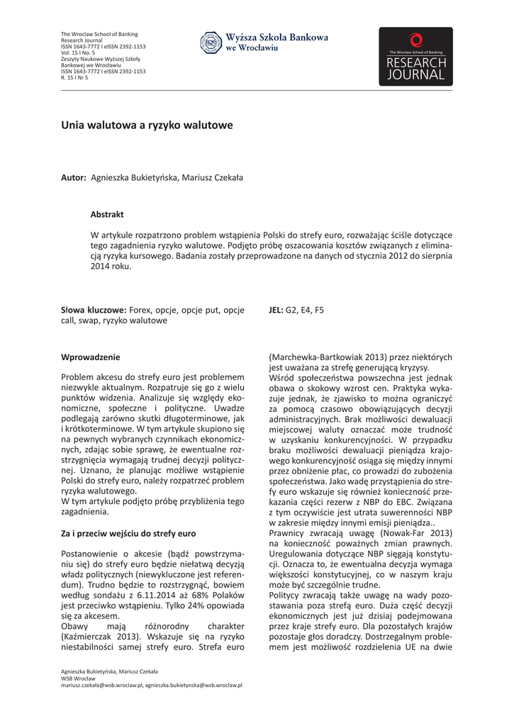 The Wroclaw School of Banking Research Journal ISSN 1643-7772 I eISSN 2392-1153 Vol. 15 I No. 5 Zeszyty Naukowe Wyższej Szkoły Bankowej we Wrocławiu ISSN 1643-7772 I eISSN 2392-1153 R. 15 I Nr 5 Unia walutowa a ryzyko walutowe Autor: Agnieszka Bukietyńska, Mariusz Czekała Abstrakt W artykule rozpatrzono problem wstąpienia Polski do strefy euro, rozważając ściśle dotyczące tego zagadnienia ryzyko walutowe. Podjęto próbę oszacowania kosztów związanych z eliminacją ryzyka kursowego. Badania zostały przeprowadzone na danych od stycznia 2012 do sierpnia 2014 roku. Słowa kluczowe: Forex, opcje, opcje put, opcje call, swap, ryzyko walutowe JEL: G2, E4, F5 Wprowadzenie (Marchewka‑Bartkowiak 2013) przez niektórych jest uważana za strefę generującą kryzysy. Wśród społeczeństwa powszechna jest jednak obawa o skokowy wzrost cen. Praktyka wykazuje jednak, że zjawisko to można ograniczyć za pomocą czasowo obowiązujących decyzji administracyjnych. Brak możliwości dewaluacji miejscowej waluty oznaczać może trudność w uzyskaniu konkurencyjności. W przypadku braku możliwości dewaluacji pieniądza krajowego konkurencyjność osiąga się między innymi przez obniżenie płac, co prowadzi do zubożenia społeczeństwa. Jako wadę przystąpienia do strefy euro wskazuje się również konieczność przekazania części rezerw z NBP do EBC. Związana z tym oczywiście jest utrata suwerenności NBP w zakresie między innymi emisji pieniądza.. Prawnicy zwracają uwagę (Nowak-Far 2013) na konieczność poważnych zmian prawnych. Uregulowania dotyczące NBP sięgają konstytucji. Oznacza to, że ewentualna decyzja wymaga większości konstytucyjnej, co w naszym kraju może być szczególnie trudne. Politycy zwracają także uwagę na wady pozostawania poza strefą euro. Duża część decyzji ekonomicznych jest już dzisiaj podejmowana przez kraje strefy euro. Dla pozostałych krajów pozostaje głos doradczy. Dostrzegalnym problemem jest możliwość rozdzielenia UE na dwie Problem akcesu do strefy euro jest problemem niezwykle aktualnym. Rozpatruje się go z wielu punktów widzenia. Analizuje się względy ekonomiczne, społeczne i polityczne. Uwadze podlegają zarówno skutki długoterminowe, jak i krótkoterminowe. W tym artykule skupiono się na pewnych wybranych czynnikach ekonomicznych, zdając sobie sprawę, że ewentualne rozstrzygnięcia wymagają trudnej decyzji politycznej. Uznano, że planując możliwe wstąpienie Polski do strefy euro, należy rozpatrzeć problem ryzyka walutowego. W tym artykule podjęto próbę przybliżenia tego zagadnienia. Za i przeciw wejściu do strefy euro Postanowienie o akcesie (bądź powstrzymaniu się) do strefy euro będzie niełatwą decyzją władz politycznych (niewykluczone jest referendum). Trudno będzie to rozstrzygnąć, bowiem według sondażu z 6.11.2014 aż 68% Polaków jest przeciwko wstąpieniu. Tylko 24% opowiada się za akcesem. Obawy mają różnorodny charakter (Kaźmierczak 2013). Wskazuje się na ryzyko niestabilności samej strefy euro. Strefa euro Agnieszka Bukietyńska, Mariusz Czekała WSB Wrocław mariusz.czekał[email protected], [email protected] The Wroclaw School of Banking Research Journal I ISSN 1643‑7772 I eISSN 2392‑1153 I Vol. 15 I No. 5 odseparowane od siebie części. Od roku 2015 aż 19 spośród 28 krajów Unii Europejskiej stanie się członkami strefy euro. Poza strefą pozosta‑ nie Wielka Brytania, Dania, Szwecja oraz kra‑ je Europy środkowo‑wschodniej (z wyjątkiem republik bałtyckich). Ewentualna możliwość podejmowania decyzji przez kraje spoza strefy euro, także w sprawach dotyczącej całej Unii Europejskiej, stanie pod znakiem zapytania. Wśród zalet akcesu do strefy euro najczęściej wymienia się niemal przesądzoną obniżkę opro‑ centowania kredytów (Tchorek, Czaja 2013). Ten pro‑wzrostowy czynnik może jednak w dłuższym okresie okazać się zgubny. Ewentualny boom kredytowy może spowodować niekontrolowany wzrost popytu, a w dalszej perspektywie trudności z regulowaniem zobowiązań. Przykład Hiszpanii jest tutaj pouczający. Ekonomiści jako główną zaletę integracji waluto‑ wej wskazują eliminację ryzyka kursowego oraz związanych z tym opłat administracyjnych. Niektóre z powyższych czynników można zba‑ dać, stosując metody ilościowe. W tym artykule przedmiotem zainteresowania będzie właśnie ryzyko kursowe. Z punktu widzenia przedsię‑ biorstw, ale również całej gospodarki, jego eliminacja jest kosztowna. Zagadnienie takie było rozpatrywane między innymi w artyku‑ le (Bukietyńska, Czekała, Hetmańczuk 2014) głównie w odniesieniu do skutków dla przed‑ siębiorstw. W tym artykule oszacujemy koszty związane z eliminacją ryzyka kursowego również w odniesieniu do całej gospodarki. Analiza bę‑ dzie dotyczyć lat 2012–2013 i pierwszych ośmiu miesięcy roku 2014. w euro. Ryzyko takie nie wystąpi w przypadku przystąpienia Polski do strefy euro. Do wyceny opcji call stosujemy wzory: a do wyceny opcji put formułę: gdzie: , oraz W powyższych formułach: C – wartość opcji kupna P – wartość opcji sprzedaży S – obecny kurs waluty obcej (kwotowanej) K – cena wykonania – stopa procentowa dotycząca waluty obcej – stopa procentowa dotycząca waluty krajowej τ = czas do wygaśnięcia opcji (do terminu wykonania) jest nieznany. Dlatego zostaje Parametr oszacowany na podstawie danych za rok (około 252 dni sesyjne) poprzedzający moment zawar‑ cia umowy. Jest to typowe podejście korzystają‑ ce z danych historycznych. W pracy przyjęto kilka schematów postępowa‑ nia dla importerów oraz eksporterów. Pierwszy schemat da importera wystąpi w sze‑ ściu wariantach. Metodologia i założenia W pracy wprowadzono koszt ryzyka walutowego, korzystając z metodologii wyceny in‑ strumentów zabezpieczających ryzyko. Istnieją różne sposoby zabezpieczające przed ryzykiem walutowym. Zalicz