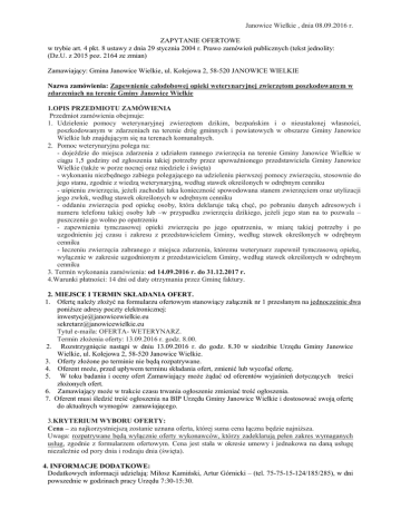 Janowice Wielkie , dnia 08.09.2016 r. ZAPYTANIE OFERTOWE w trybie art. 4 pkt. 8 ustawy z dnia 29 stycznia 2004 r. Prawo zamówień publicznych (tekst jednolity: (Dz.U. z 2015 poz. 2164 ze zmian) Zamawiający: Gmina Janowice Wielkie, ul. Kolejowa 2, 58-520 JANOWICE WIELKIE Nazwa zamówienia: Zapewnienie całodobowej opieki weterynaryjnej zwierzętom poszkodowanym w zdarzeniach na terenie Gminy Janowice Wielkie 1.OPIS PRZEDMIOTU ZAMÓWIENIA Przedmiot zamówienia obejmuje: 1. Udzielenie pomocy weterynaryjnej zwierzętom dzikim, bezpańskim i o nieustalonej własności, poszkodowanym w zdarzeniach na terenie dróg gminnych i powiatowych w obszarze Gminy Janowice Wielkie lub znajdującym się na terenach komunalnych. 2. Pomoc weterynaryjna polega na: - dojeździe do miejsca zdarzenia z udziałem rannego zwierzęcia na terenie Gminy Janowice Wielkie w ciągu 1,5 godziny od zgłoszenia takiej potrzeby przez upoważnionego przedstawiciela Gminy Janowice Wielkie (także w porze nocnej oraz niedziele i święta) - wykonaniu niezbędnego zabiegu polegającego na udzieleniu pierwszej pomocy zwierzęciu, stosownie do jego stanu, zgodnie z wiedzą weterynaryjną, według stawek określonych w odrębnym cenniku - uśpieniu zwierzęcia, jeżeli zachodzi taka konieczność spowodowana stanem zwierzęciem oraz utylizacji jego zwłok, według stawek określonych w odrębnym cenniku - oddaniu zwierzęcia pod opiekę osoby, która deklaruje taką chęć, po pobraniu danych adresowych i numeru telefonu takiej osoby lub –w przypadku zwierzęcia dzikiego, jeżeli jego stan na to pozwala – puszczeniu go wolno po opatrzeniu - zapewnieniu tymczasowej opieki zwierzęciu po jego opatrzeniu, w miarę takiej potrzeby i po uzgodnieniu jej czasu i zakresu z przedstawicielem Gminy, według stawek określonych w odrębnym cenniku - leczeniu zwierzęcia zabranego z miejsca zdarzenia, któremu weterynarz zapewnił tymczasową opiekę, wyłącznie w zakresie uzgodnionym z przedstawicielem Gminy, według stawek określonych w odrębnym cenniku 3. Termin wykonania zamówienia: od 14.09.2016 r. do 31.12.2017 r. 4.Warunki płatności: 14 dni od daty otrzymania przez Gminę faktury. 2. MIEJSCE I TERMIN SKŁADANIA OFERT. 1. Ofertę należy złożyć na formularzu ofertowym stanowiący załącznik nr 1 przesłanym na jednocześnie dwa poniższe adresy poczty elektronicznej: [email protected] [email protected] Tytuł e-maila: OFERTA- WETERYNARZ. Termin złożenia oferty: 13.09.2016 r. godz. 8.00. 2. Rozstrzygnięcie nastąpi w dniu 13.09.2016 r. do godz. 8.30 w siedzibie Urzędu Gminy Janowice Wielkie, ul. Kolejowa 2, 58-520 Janowice Wielkie. 3. Oferty złożone po terminie nie będą rozpatrywane. 4. Oferent może, przed upływem terminu składania ofert, zmienić lub wycofać ofertę. 5. W toku badania i oceny ofert Zamawiający może żądać od oferentów wyjaśnień dotyczących treści złożonych ofert. 6. Zamawiający może w trakcie czasu trwania ogłoszenie zmieniać treść ogłoszenia. 7. Oferent musi śledzić treść ogłoszenia na BIP Urzędu Gminy Janowice Wielkie i dostosować swoją ofertę do aktualnych wymogów zamawiającego. 3.KRYTERIUM WYBORU OFERTY: Cena – za najkorzystniejszą zostanie uznana oferta, której suma cena łączna będzie najniższa. Uwaga: rozpatrywane będą wyłącznie oferty wykonawców, którzy zadeklarują pełen zakres wymaganych usług, zgodnie z formularzem ofertowym. Cena jest stała w okresie umowy i jednakowa na daną usługę niezależnie od pory dnia i rodzaju dnia (święta). 4. INFORMACJE DODATKOWE: Dodatkowych informacji udzielają: Miłosz Kamiński, Artur Górnicki – (tel. 75-75-15-124/185/285), w dni powszednie w godzinach pracy Urzędu 7:30-15:30. Załącznik nr 1 FORMULARZ OFERTOWY 1. Zamawiający: Gmina Janowice Wielkie ul. Kolejowa 2, 58-520 JANOWICE WIELKIE W odpowiedzi na zapytanie cenowe Gminy Janowice Wielkie niniejszym składamy ofertę na „Zapewnienie całodobowej opieki weterynaryjnej zwierzętom poszkodowanym w zdarzeniach na terenie Gminy Janowice Wielkie . Pełna nazwa oferenta: Adres oferenta, numer telefonu oraz numer NIP, email. Po zapoznaniu się z opisem przedmiotu zamówienia oferujemy wykonanie usługi za: Lp. 1 Zakres usługi Dojazd do miejsca zdarzenia z udziałem rannego zwierzęcia na terenie Gminy Janowice Wielkie w ciągu 1,5 godziny od zgłoszenia takiej potrzeby przez upoważnionego przedstawiciela Gminy Janowice Wielkie (także w porze nocnej oraz niedziele i święta) 2 Wykonanie niezbędnego zabiegu polegającego na udzieleniu pierwszej pomocy zwierzęciu, stosownie do jego stanu, zgodnie z wiedzą weterynaryjną 3 Należy podać cenę za usługę dot. psa średniej wielkości. Uśpienie zwierzęcia oraz utylizacja zwłok zwierzęcia 4 Należy podać cenę za usługę dot. psa średniej wielkości. Zapewnienie tymczasowej opieki zwierzęciu po jego opatrzeniu 5 Należy podać cenę za 1 dobę opieki nad psem średniej wielkości. RAZEM (CENA ŁĄCZNA BRUTTO ZA PEŁEŃ ZAKRES USŁUG) Cena brutto zł Cena łączna stanowi sumę cen z wersów 1-4 Cena łączna służy do wyboru najkorzystniejszej oferty ………………………… …., dnia ……………… 2016 r. ……………………..……………………………………………… (imię i nazwisko osoby uprawnionej do reprezentowania oferenta)