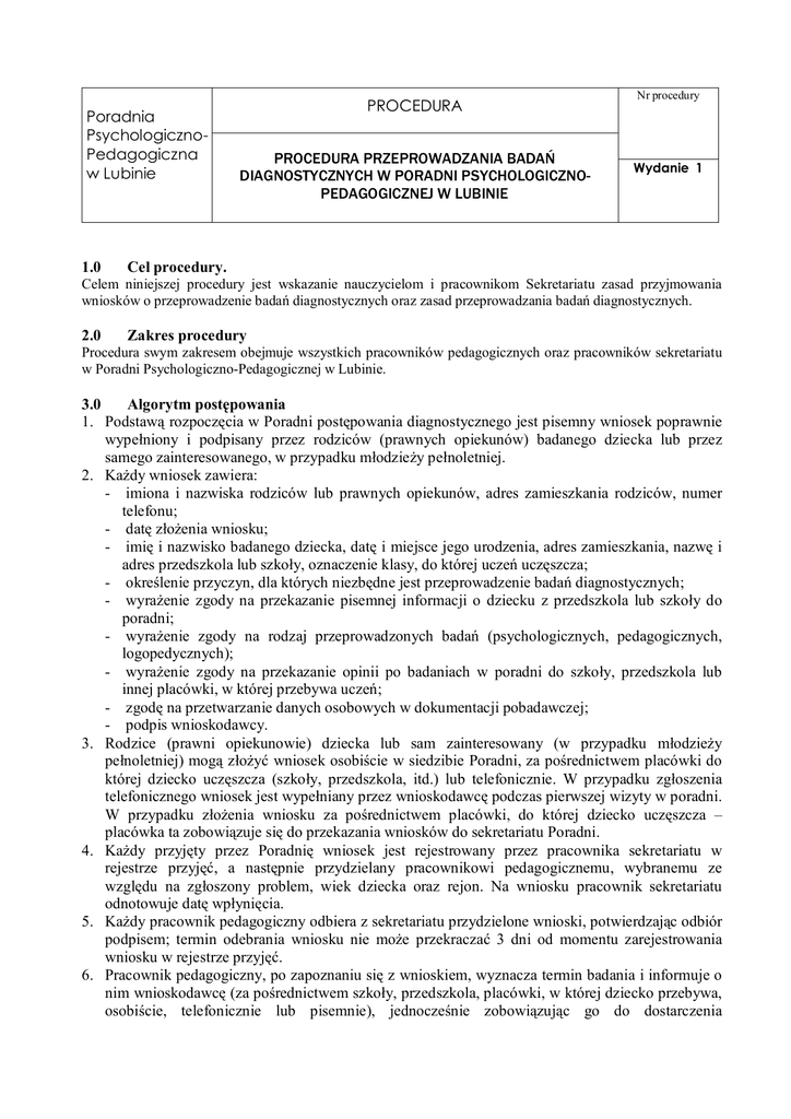 Poradnia PsychologicznoPedagogiczna w Lubinie 1.0 PROCEDURA PROCEDURA PRZEPROWADZANIA BADAŃ DIAGNOSTYCZNYCH W PORADNI PSYCHOLOGICZNOPEDAGOGICZNEJ W LUBINIE Nr procedury Wydanie 1 Cel procedury. Celem niniejszej procedury jest wskazanie nauczycielom i pracownikom Sekretariatu zasad przyjmowania wniosków o przeprowadzenie badań diagnostycznych oraz zasad przeprowadzania badań diagnostycznych. 2.0 Zakres procedury Procedura swym zakresem obejmuje wszystkich pracowników pedagogicznych oraz pracowników sekretariatu w Poradni Psychologiczno-Pedagogicznej w Lubinie. 3.0 Algorytm postępowania 1. Podstawą rozpoczęcia w Poradni postępowania diagnostycznego jest pisemny wniosek poprawnie wypełniony i podpisany przez rodziców (prawnych opiekunów) badanego dziecka lub przez samego zainteresowanego, w przypadku młodzieży pełnoletniej. 2. Każdy wniosek zawiera: - imiona i nazwiska rodziców lub prawnych opiekunów, adres zamieszkania rodziców, numer telefonu; - datę złożenia wniosku; - imię i nazwisko badanego dziecka, datę i miejsce jego urodzenia, adres zamieszkania, nazwę i adres przedszkola lub szkoły, oznaczenie klasy, do której uczeń uczęszcza; - określenie przyczyn, dla których niezbędne jest przeprowadzenie badań diagnostycznych; - wyrażenie zgody na przekazanie pisemnej informacji o dziecku z przedszkola lub szkoły do poradni; - wyrażenie zgody na rodzaj przeprowadzonych badań (psychologicznych, pedagogicznych, logopedycznych); - wyrażenie zgody na przekazanie opinii po badaniach w poradni do szkoły, przedszkola lub innej placówki, w której przebywa uczeń; - zgodę na przetwarzanie danych osobowych w dokumentacji pobadawczej; - podpis wnioskodawcy. 3. Rodzice (prawni opiekunowie) dziecka lub sam zainteresowany (w przypadku młodzieży pełnoletniej) mogą złożyć wniosek osobiście w siedzibie Poradni, za pośrednictwem placówki do której dziecko uczęszcza (szkoły, przedszkola, itd.) lub telefonicznie. W przypadku zgłoszenia telefonicznego wniosek jest wypełniany przez wnioskodawcę podczas pierwszej wizyty w poradni. W przypadku złożenia wniosku za pośrednictwem placówki, do której dziecko uczęszcza – placówka ta zobowiązuje się do przekazania wniosków do sekretariatu Poradni. 4. Każdy przyjęty przez Poradnię wniosek jest rejestrowany przez pracownika sekretariatu w rejestrze przyjęć, a następnie przydzielany pracownikowi pedagogicznemu, wybranemu ze względu na zgłoszony problem, wiek dziecka oraz rejon. Na wniosku pracownik sekretariatu odnotowuje datę wpłynięcia. 5. Każdy pracownik pedagogiczny odbiera z sekretariatu przydzielone wnioski, potwierdzając odbiór podpisem; termin odebrania wniosku nie może przekraczać 3 dni od momentu zarejestrowania wniosku w rejestrze przyjęć. 6. Pracownik pedagogiczny, po zapoznaniu się z wnioskiem, wyznacza termin badania i informuje o nim wnioskodawcę (za pośrednictwem szkoły, przedszkola, placówki, w której dziecko przebywa, osobiście, telefonicznie lub pisemnie), jednocześnie zobowiązując go do dostarczenia dokumentacji uzasadniającej wniosek, w szczególności wyniki obserwacji i badań psychologicznych, pedagogicznych, logopedycznych i lekarskich, opinię wychowawcy, nauczyciela przedmiotu, zeszyty i sprawdziany szkolne, wytwory prac dziecka). 7. Podczas pierwszego spotkania z dzieckiem i jego rodzicami (prawnymi opiekunami), na podstawie przeprowadzonego wywiadu i analizy dostarczonej dokumentacji, pracownik pedagogiczny formułuje wstępną hipotezę badawczą, która jest podstawą prowadzenia przez niego dalszych czynności diagnostycznych, w tym wyboru metod, technik i narzędzi badawczych. 8. W ciągu jednego dnia przeprowadza się z dzieckiem tylko jeden rodzaj badania diagnostycznego (psychologiczne, pedagogiczne, logopedyczne). 9. W szczególnych przypadkach, decyzję o przeprowadzeniu z dzieckiem więcej niż jednego rodzaju badania diagnostycznego w ciągu dnia, podejmuje dyrektor poradni. 10. W badaniach diagnostycznych wykorzystuje się standaryzowane testy psychologiczne, pedagogiczne, logopedyczne oraz inne narzędzia diagnostyczne ujęte w Rejestrze Testów i Narzędzi Diagnostycznych Stosowanych w Poradni Psychologiczno-Pedagogicznej w Lubinie. 11. Każde badanie przeprowadza się zgodnie z procedurami opisanymi w podręcznikach testowych, a wyjątkowo uzasadnione ustępstwa od tych procedur są dokładnie zaznaczone w protokole przebiegu badania. 12. Każdy pracownik pedagogiczny prowadzący badanie diagnostyczne dokładnie rejestruje, koduje i oblicza wyniki testowe. 13. Po zakończeniu badania pracownik pedagogiczny omawia z rodzicami (prawnymi opiekunami) dziecka lub samym zainteresowanym (w przypadku młodzieży pełnoletniej) wyniki badania oraz udziela porad, propozycji, zaleceń adekwatnych do stwierdzanych potrzeb. 14. Zebraną w toku badania dokumentację pracownik umieszcza w Karcie Indywidualnej. 15. Każde badanie zakończone jest opinią pobadawczą. Opinię wydaje się na pisemny wniosek rodziców (prawnych opiekunów) lub pełnoletniego ucznia. Na wniosek lub za zgodą rodziców dziecka (prawnych opiekunów) lub pełnoletniego ucznia poradnia przekazuje opinię do przedszkola, szkoły lub placówki, do której dziecko uczęszcza. 16. Poradnia wydaje opinie w sprawie: - Wczesnego wspomagania rozwoju dziecka. - Wcześniejszego przyjęcia dziecka do szkoły podstawowej. - Odroczenia rozpoczęcia spełniania przez dziecko obowiązku szkolnego. - Promowania ucznia klasy I lub II szkoły podstawowej do klasy programowo wyższej również w ciągu roku szkolnego. - Pozostawienia ucznia klasy I- III szkoły podstawowej na drugi rok w tej samej klasie. - Gotowości szkolnej dziecka spełniającego obowiązek rocznego przygotowania przedszkolnego poza przedszkolem albo oddziałem przedszkolnym. - Zwolnienia ucznia z nauki drugiego języka obcego. - Objęcia ucznia nauką w klasie terapeutycznej. - Dostosowania wymagań edukacyjnych wynikają