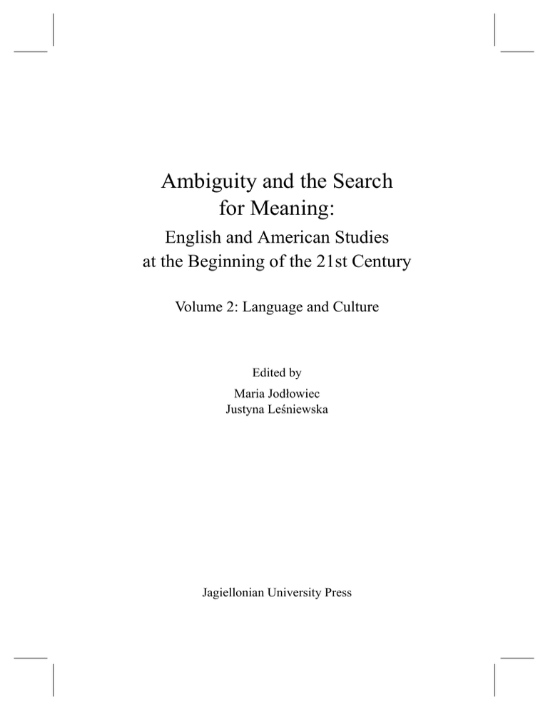 Ambiguity and the Search for Meaning: English and American Studies at the Beginning of the 21st Century Volume 2: Language and Culture Edited by Maria Jodªowiec Justyna Le±niewska Jagiellonian University Press The publication of this volume was supported by the Faculty of Philology of the Jagiellonian University, and the Institute of English Philology, Jagiellonian University. BOARD OF REVIEWERS Prof. dr hab. Anna Cie±licka Prof. dr hab. El»bieta Ma«czak-Wohlfeld Dr hab. Zygmunt Mazur Prof. dr hab. Mirosªaw Pawlak Prof. dr hab. El»bieta Tabakowska COVER DESIGN Marcin Klag TYPESETTING Sebastian Le±niewski TECHNICAL EDITOR Mirosªaw Ruszkiewicz © Copyright by Monika Coghen, Zygmunt Mazur, Beata Pi¡tek & Wydawnictwo Uniwerstytetu Jagiello«skiego First edition, Kraków 2010 All rights reserved No part of this book may be reproduced, translated, stored in a retrieval system, or transmitted, in any form or by any means, electronic, mechanical, photocopying, micro lming, recording, or otherwise, without written permission from the Publisher. ISBN 978-83-233-3126-1 www.wuj.pl Wydawnictwo Uniwersytetu Jagiello«skiego Redakcja: ul. Michaªowskiego 9/2, 31-126 Kraków tel. 012-631-18-81, tel./fax 012-631-18-83 Dystrybucja: ul. Wrocªawska 53, 30-011 Kraków tel. 012-631-01-97, tel./fax 012-631-01-98 tel. kom. 0506-006-674, e-mail: [email protected] Konto: BPH PBK SA IV/O Kraków, nr 62 1060 0076 0000 3200 0047 8769 Contents Preface . . . . . . . . . . . . . . . . . . . . . . . . . . . . . . . . . . . . . Part I Ambiguity and Beyond: Exploring Vital Linguistic and Communication Phenomena 9 11 EUGENE H. CASAD The Search for Meaning and Ambiguities in the Cora Lexicon . . . . . . . . . . 13 DAFYDD GIBBON The Ambiguity of `Ambiguity': Beauty, Power, and Understanding . . . . . . . 33 DAVID SINGLETON The Polyvalence of Taboo Language . . . . . . . . . . . . . . . . . . . . . . 53 ANNA BENDRAT How to De ne Rhetoric? The Ambiguities of Theory and Practice in Contemporary Persuasive Communication . . . . . . . . . . . . . . . . . . 63 MARIA JODŠOWIEC Disambiguation and Context . . . . . . . . . . . . . . . . . . . . . . . . . . 75 MARTA D•BROWSKA Functions of Code-Switching in Electronic Communication . . . . . . . . . . . 91 DAVID C. S. LI, SU-CHIAO CHEN, FENG-FU TSAO Self-Reported Code-Switching Motivations of Educated Chinese Speakers in Hong Kong and Taiwan: An Experimental Study . . . . . . . . . . . . . . . 107 AGNIESZKA NOWICKA Negotiating the Racial Other in Interactions in English as a Lingua Franca . . . 123 MAŠGORZATA PASICKA Lost Meanings? Some Re ections on Clichés in the Language of American Born-Again Christians . . . . . . . . . . . . . . . . . . . . . . . . . . . . 137 6 CONTENTS JOANNA PODHORODECKA Evaluative Metaphor and the Passive Construction . . . . . . . . . . . . . . . 145 EWA WILLIM Grammatical Number and the Count/Mass Distinction . . . . . . . . . . . . . 151 MILANA MICHALEVIC Onomasiological Description of Bahuvrihi Compounds and Semantics of the First Constituent . . . . . . . . . . . . . . . . . . . . . . . . . . . . . 167 MILAN SMUTNÝ English Compound Substantives and Their Czech Equivalents Part II Translation and the Search for Meaning . . . . . . . . . 183 195 AGATA SADZA Sobiepa«stwo wielmo»ów vs. the Magnates' Lordly Whims. Translation of Political Language in the English Version of Madame by Antoni Libera . . . 197 JOANNA DYBIEC Sworn Translator Training: A Polish Perspective Part III . . . . . . . . . . . . . . . . 211 EFL Teaching: Eliminating Ambiguities 229 ANNA NI›EGORODCEW Supervising Academic Writing: MA Theses and Licentiate Projects in statu nascendi . . . . . . . . . . . . . . . . . . . . . . . . . . . . . . . . 231 LUDMILA NEUWIRTHOVA Implementing European Language Education Criteria in Language for Academic Purposes at a Technically-Oriented University . . . . . . . . . . 241 MAŠGORZATA MARZEC-STAWIARSKA The Role of Summarizing in Discovering Text Meaning . . . . . . . . . . . . . 255 JOANNA ROKITA-JA‘KOW Fostering Arti cial Bilingualism: An Ambiguous Decision, Ambiguous Results . 269 7 CONTENTS Part IV In Search of Disambiguation in the Cultural Context 281 ULLA KRIEBERNEGG Higher Education Internationalization Policies and the Transatlantic Dialogue: An Analysis of Cultural Narratives . . . . . . . . . . . . . . . . . . . . . . . 283 PETER LEESE The City in Film: An Archaeology of Post-Industrial Britain . . . . . . . . . . 295 JACEK ROMANIUK Waving the Sixties Banner: Evocations of the Ambiguous Decade in the 21st Century Presidential Campaigns in the USA . . . . . . . . . . . . . 305