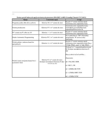 ------------------------------------------------------------------------------------------------------------------------------------------Zestaw przyk³adowych opcji serwisowych procesora SDA2023 A-003( Grundig Chassis CUC4411) Opcja Ustawienie opcji Uwagi Ka¿de w³¹czenie zmienia opcjê. Programy jedno albo dwu cyfrowe Klawisz M i w³¹czenie do sieci Automatycznie zapamiêtywana. Automatycznie zapamiêtywana; Norma producenta Klawisz FT i w³¹czenie do sieci wartoœæ mo¿na modyfikowaæ i zapamiêtaæ klawiszem M. Ka¿de w³¹czenie zmienia opcjê. W³¹czanie na P1 albo na AV Klawisz -> i w³¹czenie do sieci Automatycznie zapamiêtywana. Na wyœwietlaczu "HP".Potrzebny Dealer Automatic Programming Klawisz P/C i w³¹czenie do sieci programator. W serwis ie bez znaczenia. Ka¿de w³¹czenie zmienia opcjê. Wybór pilota i zakresu kana³ów Klawisz ->. i w³¹czenie do sieci Automatycznie zapamiêtywana.Du¿e specjalnych "O"dla TP661, ma³e "o" dla TP621. Wybraæ "cc" i zapamiêtaæ klawiszem M. Kolejne naciœniêcia klawisza N daj¹ Pxx-cc-n0-n1-n2-n3-n4-Pxx-... Wybór rastru strojenia (kana³ów) i systemów fonii Znaczenie: Klawisz N i w³¹czenie do sieci. Kolejne nacisniêcia klawisza N daj¹: n0 - PAL/SEC DDR --A-CA-cc-A1 n1- SEC L. FR n2 - 6.0MHz GB-TON n3 - 6.5MHz OIRT-TON n4 - 4.5MHz NTSC