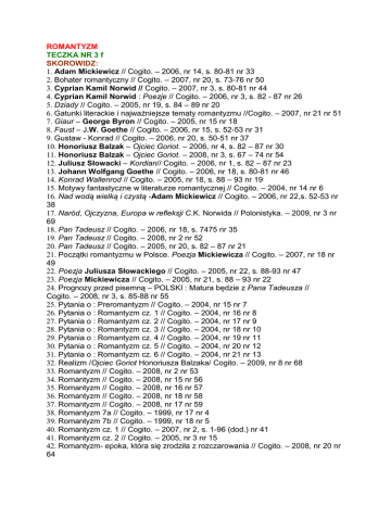 ROMANTYZM TECZKA NR 3 f SKOROWIDZ: 1. Adam Mickiewicz // Cogito. – 2006, nr 14, s. 80-81 nr 33 2. Bohater romantyczny // Cogito. – 2007, nr 20, s. 73-76 nr 50 3. Cyprian Kamil Norwid // Cogito. – 2007, nr 3, s. 80-81 nr 44 4. Cyprian Kamil Norwid : Poezje // Cogito. – 2006, nr 3, s. 82 - 87 nr 26 5. Dziady // Cogito. – 2005, nr 19, s. 84 – 89 nr 20 6. Gatunki literackie i najważniejsze tematy romantyzmu //Cogito. – 2007, nr 21 nr 51 7. Giaur – George Byron // Cogito. – 2005, nr 15 nr 18 8. Faust – J.W. Goethe // Cogito. – 2006, nr 15, s. 52-53 nr 31 9. Gustaw - Konrad // Cogito. – 2006, nr 20, s. 50-51 nr 37 10. Honoriusz Balzak – Ojciec Goriot. – 2006, nr 4, s. 82 – 87 nr 30 11. Honoriusz Balzak – Ojciec Goriot. – 2008, nr 3, s. 67 – 74 nr 54 12. Juliusz Słowacki – Kordian// Cogito. – 2006, nr 1, s. 82 – 87 nr 23 13. Johann Wolfgang Goethe // Cogito. – 2006, nr 18, s. 80-81 nr 46 14. Konrad Wallenrod // Cogito. – 2005, nr 18, s. 88 – 93 nr 19 15. Motywy fantastyczne w literaturze romantycznej // Cogito. – 2004, nr 14 nr 6 16. Nad wodą wielką i czystą -Adam Mickiewicz // Cogito. – 2006, nr 22,s. 52-53 nr 38 17. Naród, Ojczyzna, Europa w refleksji C.K. Norwida // Polonistyka. – 2009, nr 3 nr 69 18. Pan Tadeusz // Cogito. – 2006, nr 18, s. 7475 nr 35 19. Pan Tadeusz // Cogito. – 2008, nr 2 nr 52 20. Pan Tadeusz // Cogito. – 2005, nr 20, s. 82 – 87 nr 21 21. Początki romantyzmu w Polsce. Poezja Mickiewicza // Cogito. – 2007, nr 18 nr 49 22. Poezja Juliusza Słowackiego // Cogito. – 2005, nr 22, s. 88-93 nr 47 23. Poezja Mickiewicza // Cogito. – 2005, nr 21, s. 88 – 93 nr 22 24. Prognozy przed pisemną – POLSKI : Matura będzie z Pana Tadeusza // Cogito. – 2008, nr 3, s. 85-88 nr 55 25. Pytania o : Preromantyzm // Cogito. – 2004, nr 15 nr 7 26. Pytania o : Romantyzm cz. 1 // Cogito. – 2004, nr 16 nr 8 27. Pytania o : Romantyzm cz. 2 // Cogito. – 2004, nr 17 nr 9 28. Pytania o : Romantyzm cz. 3 // Cogito. – 2004, nr 18 nr 10 29. Pytania o : Romantyzm cz. 4 // Cogito. – 2004, nr 19 nr 11 30. Pytania o : Romantyzm cz. 5 // Cogito. – 2004, nr 20 nr 12 31. Pytania o : Romantyzm cz. 6 // Cogito. – 2004, nr 21 nr 13 32. Realizm /Ojciec Goriot Honoriusza Balzaka/ Cogito. – 2009, nr 8 nr 68 33. Romantyzm // Cogito. – 2008, nr 2 nr 53 34. Romantyzm // Cogito. – 2008, nr 15 nr 56 35. Romantyzm // Cogito. – 2008, nr 16 nr 57 36. Romantyzm // Cogito. – 2008, nr 18 nr 58 37. Romantyzm // Cogito. – 2008, nr 17 nr 59 38. Romantyzm 7a // Cogito. – 1999, nr 17 nr 4 39. Romantyzm 7b // Cogito. – 1999, nr 18 nr 5 40. Romantyzm cz. 1 // Cogito. – 2007, nr 2, s. 1-96 (dod.) nr 41 41. Romantyzm cz. 2 // Cogito. – 2005, nr 3 nr 15 42. Romantyzm- epoka, która się zrodziła z rozczarowania // Cogito. – 2008, nr 20 nr 64 43. Romantyzm /Kordian J. Słowackiego/ // Cogito. – 2008, nr 21 nr 65 44. Romantyzm- odrębność polskiej kultury // Cogito. – 2008, nr 21 nr 66 45. Romantyzm /Wiersze C.K. Norwida/ // Cogito. – 2008, nr 22 nr 67 46. Romantyzm /Wiersze Słowackiego/ // Cogito. – 2008, nr 20 nr 63 47. Romantyzm do NOWEJ MATYRY cz. 1 // Cogito. – 2005, nr 2 nr 16 48. Romantyzm: Historia w Panu Tadeuszu; Pan Tadeusz A. Mickiewicza jako portret szlachty polskiej // Cogito. – 2008, nr 19 nr 62 49. Romantyzm i historia // Cogito. – 2004, nr 21 nr 17 50. Romantyzm: Krasiński, Pankracy, Hrabia Henryk – ich zdania w sprawie rewolucji // Cogito. – 2009, nr 1 nr 61 51. Romantyzm Śluby panieńskie A. Fredry // Cogito. – 2009, nr 2 nr 60 52. Romantyzm i tradycja // Cogito. – 2004, nr 19 nr 14 53. Romantyzm w Europie // Cogito. – 2006, nr 3, s. 60 – 65 nr 28 54. Romantyzm w Polsce // Cogito. – 2007, nr 3, s. 1-96 (dod.) nr 42 55. Romantyzm w Polsce cz. 1 // Cogito. – 2006, nr 3, s. 70 – 73 nr 26 56. Romantyzm w Polsce cz. 2 // Cogito. – 2006, nr 4, s. 60 – 73 nr 29 57. Romantyzm w pytaniach i odpowiedziach cz. 1 // Cogito . – 2001, nr 2 nr 1 58. Romantyzm w pytaniach i odpowiedziach cz. 2 // Cogito . – 2001, nr 3 nr 2 59. Romantyzm w pytaniach i odpowiedziach cz. 3 // Cogito. – 2001, nr 4 nr 3 60. Rozłączenie – Juliusz Słowacki // Cogito. – 2007, nr 2, s. 56-57 nr 41 61. Stepy akermańskie – Adam Mickiewicz // Cogito. – 2006, nr 18, s. 52-53 nr 36 62. Uporządkowanie wiedzy o romantyzmie w Europie // Cogito. – 2007, nr 16 nr 48 63. W Weronie – C.K. Norwid // Cogito. – 2007, nr 4, s. 56-57 nr 43 64. Ważne lektury : Cierpienia młodego Wertera, Król Olch, Faust, Rękawiczka, Giaur // Cogito. – 2006, nr 3 nr 27 65. Wstęp do Romantyzmu // Cogito. – 2007, nr 15, s. 66-70 nr 45 66. Wypracowanie na temat porównania wiersza C.K. Norwida Fatum a fragmentu książki M. Bułhakowa Mistrz i Małgorzata // Cogito. – 2006, nr 16, s. 71-73 nr 34 67. Wypracowanie (na temat Pana Tadeusza) //Cogito. – 2006, nr 14, s. 71-73 nr 32 68. Wypracowanie z Kordiana – Juliusz Słowacki // Cogito. – 2007, nr 1, s. 68-69 nr 39 69. Zygmunt Krasiński Nie – Boska komedia // Cogito. – 2006, nr 2 nr 24 70. Romantyzm /Wiersze Słowackiego/ // Cogito. – 2008, nr 20 nr 63 71. „Cierpienia młodego Wertera” Johanna Wolfganga Goethego // Cogito.- 2010, nr 2 nr 70 72. „Oda do młodości” oraz „Ballady i romanse” Adama Mickiewicza // Cogito.- 2010, nr 3 nr 71 73. Adam Mickiewicz // Cogito.- 2010, nr 4 nr 72 74. „Pan Tadeusz” Adama Mickiewicza // Cogito.- 2010, nr 5 nr 73 75. Wiersze Juliusza Słowackiego // Cogito.- 2010, nr 6 nr 74 76. Wiersze Cypriana Kamila Norwida // Cogito.- 2010, nr 9 nr 75 77. „Nie-Boska komedia” Zygmunta Krasińskiego // Cogito.- 2010, nr 8 nr 76 78. „Kordian” Juliusza Słowackiego // Cogito.- 2010, nr 7 nr 77 79. W Roku Słowackiego. „Kordian” jako lektura szkolna // Język Polski w Liceum.2009/10 nr 2 nr 78 80. Analizując utwory Cypriana Kamila Norwida „Pielgrzym” i Adama Zagajewskiego „Szybki wiersz” …// Co