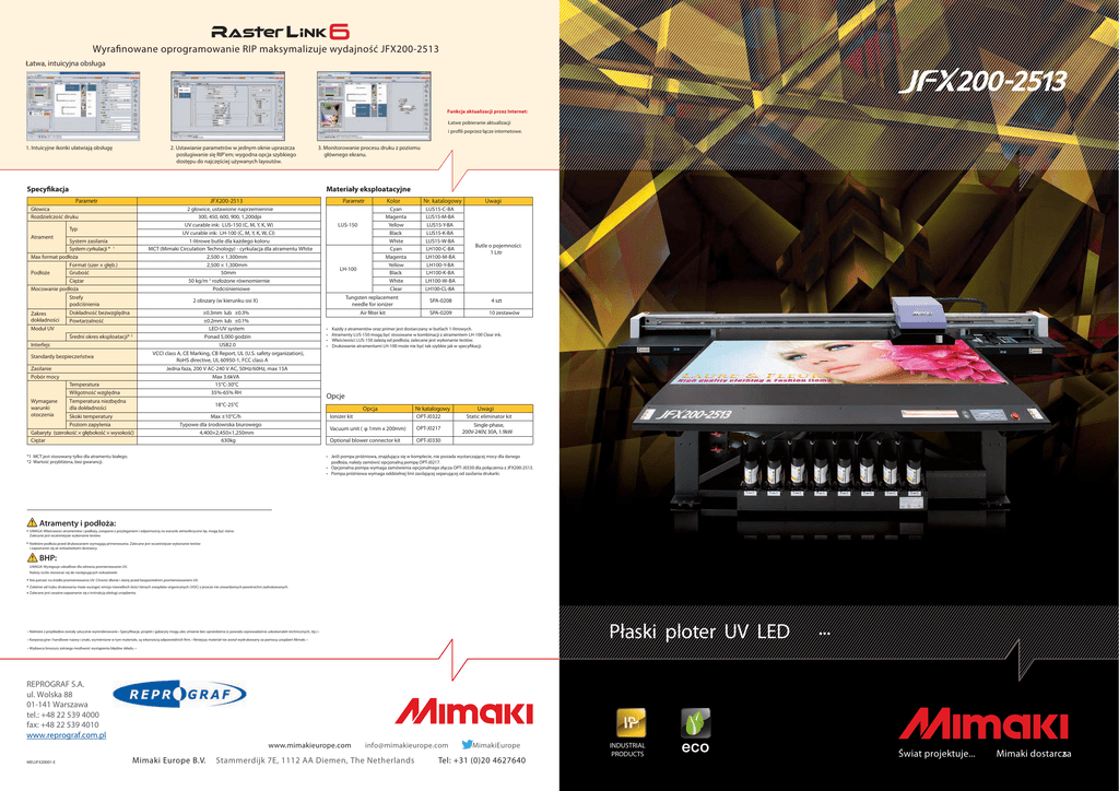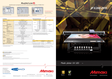 Wyrafinowane oprogramowanie RIP maksymalizuje wydajność JFX200-2513 Łatwa, intuicyjna obsługa Funkcja aktualizacji przez Internet: Łatwe pobieranie aktualizacji i profili poprzez łącze internetowe. 1. Intuicyjne ikonki ułatwiają obsługę 2. Ustawianie parametrów w jednym oknie upraszcza posługiwanie się RIP’em; wygodna opcja szybkiego dostępu do najczęściej używanych layoutów. 3. Monitorowanie procesu druku z poziomu głównego ekranu. Specyfikacja Materiały eksploatacyjne Parametr Głowica Rozdzielczość druku 2 głowice, ustawione naprzemiennie 300, 450, 600, 900, 1,200dpi UV curable ink: LUS-150 (C, M, Y, K, W) UV curable ink: LH-100 (C, M, Y, K, W, CI) 1-litrowe butle dla każdego koloru MCT (Mimaki Circulation Technology) - cyrkulacja dla atramentu White 2,500 × 1,300mm 2,500 × 1,300mm 50mm 50 kg/m 2 rozłożone równomiernie Podciśnieniowe Typ Atrament System zasilania System cyrkulacji * 1 Max format podłoża Format (szer × głęb.) Podłoże Grubość Ciężar Mocowanie podłoża Strefy podciśnienia Zakres dokładności Dokładność bezwzględna Powtarzalność ±0.3mm lub ±0.3% ±0.2mm lub ±0.1% LED-UV system Ponad 5,000 godzin USB2.0 Średni okres eksploatacji* 2 Interfejs Kolor Cyan Magenta Yellow Black White Cyan Magenta Yellow Black White Clear LUS-150 LH-100 2 obszary (w kierunku osi X) Moduł UV t t t t Nr. katalogowy LUS15-C-BA LUS15-M-BA LUS15-Y-BA LUS15-K-BA LUS15-W-BA LH100-C-BA LH100-M-BA LH100-Y-BA LH100-K-BA LH100-W-BA LH100-CL-BA Tungsten replacement needle for ionizer SPA-0208 Air filter kit SPA-0209 Uwagi Butle o pojemności: 1 Litr 4 szt 10 zestawów IKażdy z atramentów oraz primer jest dostarczany w butlach 1-litrowych. Atramenty LUS-150 mogą być stosowane w kombinacji z atramentem LH-100 Clear ink. Właściwości LUS-150 zależą od podłoża; zalecane jest wykonanie testów. Drukowanie atramentami LH-100 może nie być tak szybkie jak w specyfikacji. VCCI class A, CE Marking, CB Report, UL (U.S. safety organization), RoHS directive, UL 60950-1, FCC class A Standardy bezpieczeństwa Zasilanie Pobór mocy Jedna faza, 200 V AC-240 V AC, 50Hz/60Hz, max 15A Max 3.6kVA 15°C-30°C 35%-65% RH Temperatura Wilgotność względna Wymagane warunki otoczenia Parametr JFX200-2513 Temperatura niezbędna dla dokładności Opcje 18°C-25°C Skoki temperatury Poziom zapylenia Gabaryty (szerokość × głębokość × wysokość) Ciężar Opcja Max ±10°C/h Typowe dla środowiska biurowego 4,400×2,450×1,250mm 630kg Nr katalogowy Uwagi Ionizer kit OPT-J0322 Static eliminator kit Vacuum unit ( φ 1mm x 200mm) OPT-J0217 Single-phase, 200V-240V, 30A, 1.9kW Optional blower connector kit OPT-J0330 t Jeśli pompa próżniowa, znajdująca się w komplecie, nie posiada wystarczającej mocy dla danego podłoża, należy zamówić opcjonalną pompę OPT-J0217. t Opcjonalna pompa wymaga zamówienia opcjonalnego złącza OPT-J0330 dla połączenia z JFX200-2513. t Pompa próżniowa wymaga oddzielnej linii zasilającej separującej od zasilania drukarki. *1 MCT jest stosowany tylko dla atramentu białego. *2 Wartość przybliżona, bez gwarancji. Atramenty i podłoża: UWAGA: Właściwości atramentów i podłoży, związane z przyleganiem i odpornością na warunki atmosferyczne itp. mogą być różne. Zalecane jest wcześniejsze wykonanie testów. Niektóre podłoża przed drukowaniem wymagają primerowania. Zalecane jest wcześniejsze wykonanie testów i zapoznanie się ze wskazówkami dostawcy. BHP: UWAGA: Występuje szkodliwe dla zdrowia promieniowanie UV. Należy ściśle stosować się do następujących wskazówek: Nie patrzeć na źródło promieniowania UV. Chronić dłonie i skórę przed bezpośrednim promieniowaniem UV. Zależnie od trybu drukowania może wystąpić emisja niewielkich ilości lotnych związków organicznych (VOC) z jeszcze nie utwardzonych powierzchni zadrukowanych. Zalecane jest uważne zapoznanie się z instrukcją obsługi urządzenia. Płaski ploter UV LED t/JFLUØSF[QS[ZLBEØX[PTUBZT[UVD[OJFXZSFOEFSPXBOFt4QFDZöLBDKFQSPKFLUJHBCBSZUZNPHnjVMFD[NJBOJFCF[VQS[FE[FOJB[QPXPEVXQSPXBE[FOJBVEPTLPOBMFǩUFDIOJD[OZDIJUQ t t,PSQPSBDZKOFJIBOEMPXFOB[XZJ[OBLJXZNJFOJPOFXUZNNBUFSJBMFTnjXBTOPǴDJnjPEQPXJFEOJDIöSNt /JOJFKT[ZNBUFSJBOJF[PTUBXZESVLPXBOZ[BQPNPDnjVS[njE[Fǩ.JNBLJt ... t8ZEBXDBCSPT[VSZ[BUS[FHBNPȈMJXPǴǎXZTUnjQJFOJBCǗEØXTLBEVt REPROGRAF S.A. ul. Wolska 88 01-141 Warszawa tel.: +48 22 539 4000 fax: +48 22 539 4010 www.reprograf.com.pl IP www.mimakieurope.com MEUJFX20001-E Mimaki Europe B.V. [email protected] Stammerdijk 7E, 1112 AA Diemen, The Netherlands @MimakiEurope Tel: +31 (0)20 4627640 INDUSTRIAL PRODUCTS Świat projektuje... Mimaki dostarcza s the power to Przystępny cenowo, wydajny płaski ploter UV LED JFX200-2513, najnowszy płaski ploter UV Mimaki, zapewnia niezrównane możliwości rozszerzenia profesjonalnej działalności na rynku oznakowań i ozdobnej grafiki. Dostępne atramenty, w tym biały i przeźroczysty, oferują szereg innowacyjnych możliwości drukowania na szerokiej gamie podłoży. Urządzenie jest łatwe w obsłudze, zajmuje niewiele miejsca, maksymalizuje produkcyjne możliwości drukowania na standardowych płaskich podłożach przemysłowych na stole wielkości 2.5 x 1.3 m. TECHNICZNA PERFEKCJA, INNOWACYJNOŚĆ, KREATYWNOŚĆ JFX200-2513 - najważniejsze cechy: Mimaki Engineering, założona w Japonii w 1975 roku, stale się rozwija i ugruntowuje znakomitą reputację globalnej firmy z dużymi bazami operacyjnymi w Azji i na Pacyfku, w Stanach Zjednoczonych i w Europie. Mimaki Engineering jest znana z wielokrotnie nagradzanej wydajności, niezrównanej jakości projektów i innowacyjnych technologi. Mimaki dała się poznać jako wiodący producent wielkoformatowych systemów atramentowych i maszyn tnących do oznakowań i grafki, tkanin i odzieży, wyrobów przemysłowych. Co więcej, Mimaki także oferuje szeroką gamę produktów uzupełniających takich jak sprzęt, oprogramowanie oraz zwi