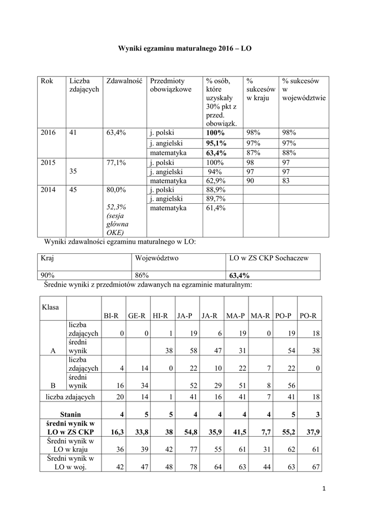 Wyniki egzaminu maturalnego 2016 – LO Rok Liczba Zdawalność zdających Przedmioty obowiązkowe 2016 41 j. polski j. angielski matematyka j. polski j. angielski matematyka j. polski j. angielski matematyka 2015 63,4% 77,1% 35 2014 45 80,0% 52,3% (sesja główna OKE) Wyniki zdawalności egzaminu maturalnego w LO: % osób, które uzyskały 30% pkt z przed. obowiązk. 100% 95,1% 63,4% 100% 94% 62,9% 88,9% 89,7% 61,4% Województwo Kraj % % sukcesów sukcesów w w kraju województwie 98% 97% 87% 98 97 90 98% 97% 88% 97 97 83 LO w ZS CKP Sochaczew 90% 86% 63,4% Średnie wyniki z przedmiotów zdawanych na egzaminie maturalnym: Klasa BI-R liczba zdających średni A wynik liczba zdających średni B wynik liczba zdających Stanin średni wynik w LO w ZS CKP Średni wynik w LO w kraju Średni wynik w LO w woj. GE-R HI-R 0 0 JA-P JA-R MA-P MA-R PO-P 1 19 6 19 38 58 47 31 0 22 10 22 29 16 0 PO-R 19 18 54 38 7 22 0 51 41 8 7 56 41 18 4 14 16 20 34 14 1 52 41 4 5 5 4 4 4 4 5 3 16,3 33,8 38 54,8 35,9 41,5 7,7 55,2 37,9 36 39 42 77 55 61 31 62 61 42 47 48 78 64 63 44 63 67 1 Wykres średnich wyników egzaminu pisemnego – poziom podstawowy: Wykres średnich wyników egzaminu pisemnego – poziom rozszerzony: Wykres wyników egzaminów pisemnych na poziomie podstawowym z podziałem na klasy: 2 przedmiot: język polski - egzamin ustny klasa 3ALO 3BLO Razem w LO kraj liczba przyst_ zdawalność 19 22 41 - wynik średni wynik najwyższy najniższy wynik 100 75% 35% 56,5% 100 90% 30% 48% 100% 99% 75 - 30 - 52,25% 62,9% przedmiot: język angielski - egzamin ustny Zdawalność klasa liczba przyst_ wynik najwyższy wynik najniższy średni wynik 3A 19 95 96,60% 10% 58,50% 3B 22 95 100% 13,30% 64,30% Razem w LO 41 95% 100 10 61,4% kraj 97% 78% Wnioski/zalecenia do pracy po analizie wyników egzaminu maturalnego w OKE Warszawa: Zweryfikować stosowane programy, podręczniki szkolne pod kątem zgodności z podstawą programową Kształcić zasady poprawnej polszczyzny, konstrukcji/struktury wypowiedzi w szczególności pod katem Ćwiczyć czytanie ze zrozumieniem pytań/poleceń oraz udzielanie adekwatnych odpowiedzi 3 Upowszechniać/zintensyfikować prace uczniów z materiałem źródłowym (teksty, mapy, rysunki, zdjęcia, schematy, tabele) pod kątem: o wyszukiwania czy przetwarzania informacji o selekcji materiału i ich doboru do konstrukcji odpowiedzi o powoływania się na źródła, a nie na np. streszczenia tekstów o uogólnienia, wnioskowania o oddzielenia opinii od faktów o wskazywania zależności przyczynowo-skutkowych o konfrontowania informacji z kilku źródeł. 4