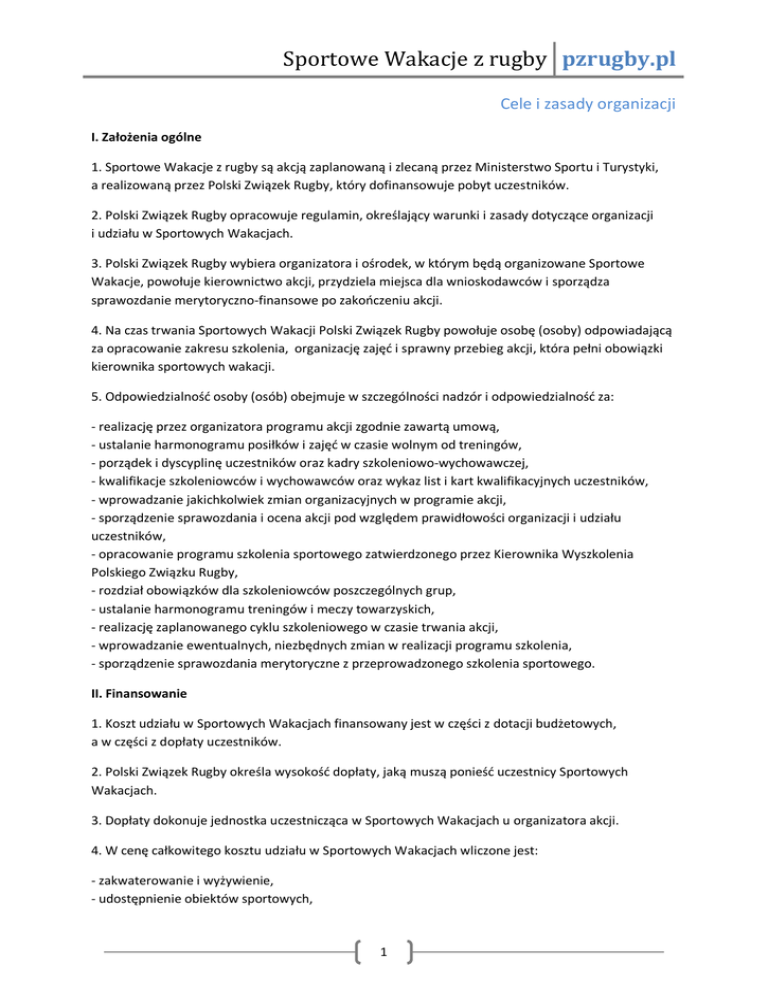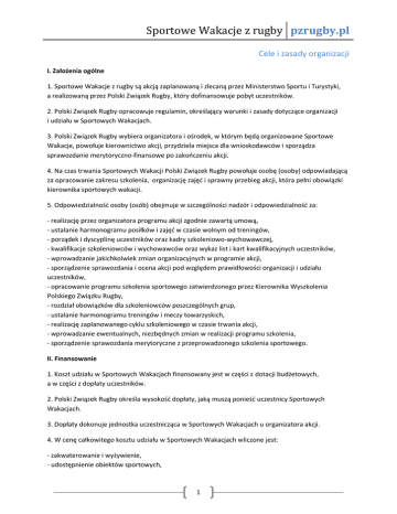 Sportowe Wakacje z rugby pzrugby.pl Cele i zasady organizacji I. Założenia ogólne 1. Sportowe Wakacje z rugby są akcją zaplanowaną i zlecaną przez Ministerstwo Sportu i Turystyki, a realizowaną przez Polski Związek Rugby, który dofinansowuje pobyt uczestników. 2. Polski Związek Rugby opracowuje regulamin, określający warunki i zasady dotyczące organizacji i udziału w Sportowych Wakacjach. 3. Polski Związek Rugby wybiera organizatora i ośrodek, w którym będą organizowane Sportowe Wakacje, powołuje kierownictwo akcji, przydziela miejsca dla wnioskodawców i sporządza sprawozdanie merytoryczno-finansowe po zakooczeniu akcji. 4. Na czas trwania Sportowych Wakacji Polski Związek Rugby powołuje osobę (osoby) odpowiadającą za opracowanie zakresu szkolenia, organizację zajęd i sprawny przebieg akcji, która pełni obowiązki kierownika sportowych wakacji. 5. Odpowiedzialnośd osoby (osób) obejmuje w szczególności nadzór i odpowiedzialnośd za: - realizację przez organizatora programu akcji zgodnie zawartą umową, - ustalanie harmonogramu posiłków i zajęd w czasie wolnym od treningów, - porządek i dyscyplinę uczestników oraz kadry szkoleniowo-wychowawczej, - kwalifikacje szkoleniowców i wychowawców oraz wykaz list i kart kwalifikacyjnych uczestników, - wprowadzanie jakichkolwiek zmian organizacyjnych w programie akcji, - sporządzenie sprawozdania i ocena akcji pod względem prawidłowości organizacji i udziału uczestników, - opracowanie programu szkolenia sportowego zatwierdzonego przez Kierownika Wyszkolenia Polskiego Związku Rugby, - rozdział obowiązków dla szkoleniowców poszczególnych grup, - ustalanie harmonogramu treningów i meczy towarzyskich, - realizację zaplanowanego cyklu szkoleniowego w czasie trwania akcji, - wprowadzanie ewentualnych, niezbędnych zmian w realizacji programu szkolenia, - sporządzenie sprawozdania merytoryczne z przeprowadzonego szkolenia sportowego. II. Finansowanie 1. Koszt udziału w Sportowych Wakacjach finansowany jest w części z dotacji budżetowych, a w części z dopłaty uczestników. 2. Polski Związek Rugby określa wysokośd dopłaty, jaką muszą ponieśd uczestnicy Sportowych Wakacjach. 3. Dopłaty dokonuje jednostka uczestnicząca w Sportowych Wakacjach u organizatora akcji. 4. W cenę całkowitego kosztu udziału w Sportowych Wakacjach wliczone jest: - zakwaterowanie i wyżywienie, - udostępnienie obiektów sportowych, 1 Sportowe Wakacje z rugby pzrugby.pl - podstawowa opieka medyczna, - organizacja programu szkoleniowego, - organizacja dodatkowego programu kulturalno-krajoznawczego. 5. Wszystkie inne koszty związane z pobytem uczestników tj. dojazd na miejsce akcji, sprzęt sportowy, stroje sportowe, napoje na treningi i mecze, odżywki, lekarstwa, itp. pokrywa jednostka (delegująca na akcję Sportowe Wakacje) III. Warunki uczestnictwa 1. W akcji Sportowe wakacje z rugby mogą uczestniczyd jednostki kultury fizycznej prowadzące szkolenie w rugby i uczestniczące we współzawodnictwie sportowym organizowanym przez Polski Związek Rugby i Okręgowe Związki Rugby. 2. Warunkiem udziału w Sportowych Wakacjach jest: - członkostwo w Okręgowym Związku Rugby lub Polskim Związku Rugby /jeśli na terenie województwa gdzie jest siedziba jednostki nie ma Okręgowego Związku Rugby/, - złożenie w określonym terminie do Polskiego Związku Rugby wniosku z podaniem propozycji liczby miejsc, - potwierdzenie udziału po otrzymaniu informacji o przyznanym limicie miejsc, - złożenie do Polskiego Związku Rugby listy uczestników i kadry szkoleniowo-wychowawczej, - dokonanie dopłaty. 3. Uczestnikami Sportowych Wakacji mogą byd tylko dzieci szkolone w rugby w następujących kategoriach wiekowych: młodzik, żak i mini-żak. 4. Każda jednostka wysyłająca grupę na Sportowe Wakacje jest zobowiązana: - zapewnid grupie własną kadrę wychowawczo-szkoleniową w ilości określonej przepisami i posiadającą obowiązujące uprawnienia, - przedłożyd kierownikowi akcji listy i karty kwalifikacyjne uczestników oraz kopie uprawnieo trenerów-opiekunów, - ponieśd odpowiedzialnośd materialną za szkody powstałe z winy swoich podopiecznych. IV. Przepisy końcowe 1. Wszyscy uczestnicy Sportowych Wakacji muszą stosowad się do niniejszego regulaminu. 2. Naruszenie przepisów regulaminu może spowodowad: a) upomnienie, b) wydalenie osoby lub grupy z udziału w akcji, c) ukaranie jednostki wysyłającej uczestników karą finansową, d) nie przyznanie miejsc na udział w Sportowych Wakacjach w kolejnym roku. 3. Decyzję o zastosowaniu kar (punkty a,b,c) w czasie trwania akcji podejmuje kierownik akcji po zasięgnięciu opinii Prezydium Zarządu PZR. 2 Sportowe Wakacje z rugby pzrugby.pl 4. Decyzję o zastosowaniu kary (punkt d) o nie przyznaniu miejsc na Sportowe Wakacje podejmuje Komisja Gier i Dyscypliny PZR na wniosek kierownika akcji. 5. Odwołanie od powyższych decyzji należy kierowad do Zarządu PZR. 6. Przepisy zatwierdzone przez Zarząd Związku. 3