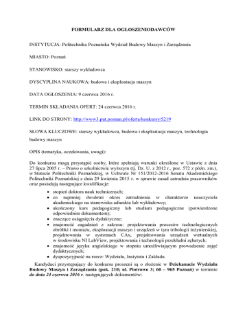 FORMULARZ DLA OGŁOSZENIODAWCÓW INSTYTUCJA: Politechnika Poznańska Wydział Budowy Maszyn i Zarządzania MIASTO: Poznań STANOWISKO: starszy wykładowca DYSCYPLINA NAUKOWA: budowa i eksploatacja maszyn DATA OGŁOSZENIA: 9 czerwca 2016 r. TERMIN SKŁADANIA OFERT: 24 czerwca 2016 r. LINK DO STRONY: http://www3.put.poznan.pl/oferta/konkursy/5219 SŁOWA KLUCZOWE: starszy wykładowca, budowa i eksploatacja maszyn, technologia budowy maszyn OPIS (tematyka, oczekiwania, uwagi): Do konkursu mogą przystąpić osoby, które spełniają warunki określone w Ustawie z dnia 27 lipca 2005 r. – Prawo o szkolnictwie wyższym (tj. Dz. U. z 2012 r., poz. 572 z późn. zm.), w Statucie Politechniki Poznańskiej, w Uchwale Nr 151/2012-2016 Senatu Akademickiego Politechniki Poznańskiej z dnia 29 kwietnia 2015 r. w sprawie zasad zatrudnia pracowników oraz posiadają następujące kwalifikacje: stopień doktora nauk technicznych; co najmniej dwuletni okres zatrudnienia w charakterze nauczyciela akademickiego na stanowisku adiunkta lub wykładowcy; ukończony kurs pedagogiczny lub studium pedagogiczne (potwierdzone odpowiednim dokumentem); znaczące osiągnięcia dydaktyczne; znajomość zagadnień z zakresu: projektowania procesów technologicznych obróbki i montażu, eksploatacji maszyn i urządzeń w tym tribologii inżynierskiej, projektowania w systemach CAx, projektowania urządzeń wirtualnych w środowisku NI LabView, projektowania i technologii przekładni zębatych; znajomość języka angielskiego w stopniu umożliwiającym prowadzenie zajęć dydaktycznych; dyspozycyjność na rzecz: Wydziału, Instytutu i Zakładu. Kandydaci przystępujący do konkursu proszeni są o złożenie w Dziekanacie Wydziału Budowy Maszyn i Zarządzania (pok. 210; ul. Piotrowo 3; 60 – 965 Poznań) w terminie do dnia 24 czerwca 2016 r. następujących dokumentów: 1. podania adresowanego do JM Rektora PP; życiorysu, kwestionariusza osobowego, arkusza kwalifikacyjnego, odpisów dyplomów oraz innych świadectw potwierdzających posiadane kwalifikacje; 2. świadectwa ukończenia kursu pedagogicznego lub studium pedagogicznego; 3. oświadczenia, że Politechnika Poznańska będzie dla Kandydata podstawowym miejscem pracy w rozumieniu ww. ustawy; 4. oświadczenia dla osoby ubiegającej się o zatrudnienie w charakterze nauczyciela akademickiego (zgodnie z art. 109 ww. ustawy); 5. oświadczenia o przekazaniu uprawnień dydaktycznych; 6. wykazu dorobku. Konkurs zostanie rozstrzygnięty w lipcu 2016 r. Kandydaci, których oferty nie zostaną przyjęte, otrzymują zwrot dokumentów. Zatrudnienie przewiduje się od 1 października 2016 r. do 30 września 2021 r. na podstawie umowy o pracę. W przypadku, gdy żaden z kandydatów nie uzyska pozytywnej oceny komisji konkursowej lub w przypadku braku kandydatów, Dziekan dokona zamknięcia konkursu. Dziekan może konkurs zamknąć lub unieważnić bez podania przyczyny.