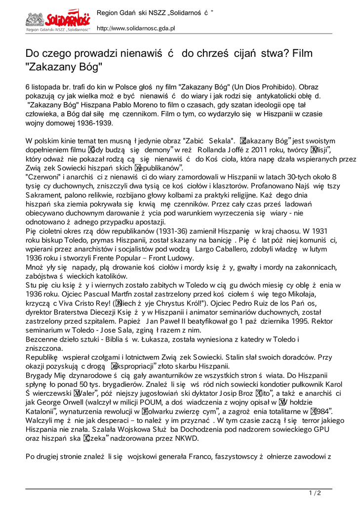 Region Gda ski NSZZ „Solidarno http://www.solidarnosc.gda.pl Do czego prowadzi nienawi "Zakazany Bóg" do chrze cija stwa? Film 6 listopada br. trafi do kin w Polsce gło ny film "Zakazany Bóg" (Un Dios Prohibido). Obraz pokazuj cy jak wielka mo e by nienawi do wiary i jak rodzi si antykatolicki obł d. "Zakazany Bóg" Hiszpana Pablo Moreno to film o czasach, gdy szatan ideologii op tał człowieka, a Bóg dał sił m czennikom. Film o tym, co wydarzyło si w Hiszpanii w czasie wojny domowej 1936-1939. W polskim kinie temat ten musn ł jedynie obraz "Zabi Sekala". „Zakazany Bóg jest swoistym dopełnieniem filmu „Gdy budz si demony w re Rollanda Joffé z 2011 roku, twórcy „Misji , który odwa nie pokazał rodz c si nienawi do Ko cioła, która nap dzała wspieranych przez Zwi zek Sowiecki hiszpa skich „republikanów . "Czerwoni" i anarchi ci z nienawi ci do wiary zamordowali w Hiszpanii w latach 30-tych około 8 tysi cy duchownych, zniszczyli dwa tysi ce ko ciołów i klasztorów. Profanowano Naj wi tszy Sakrament, palono relikwie, rozbijano głowy kolbami za praktyki religijne. Ka dego dnia hiszpa ska ziemia pokrywała si krwi m czenników. Przez cały czas prze ladowa obiecywano duchownym darowanie ycia pod warunkiem wyrzeczenia si wiary - nie odnotowano adnego przypadku apostazji. Pi cioletni okres rz dów republikanów (1931-36) zamienił Hiszpani w kraj chaosu. W 1931 roku biskup Toledo, prymas Hiszpanii, został skazany na banicj . Pi lat pó niej komuni ci, wpierani przez anarchistów i socjalistów pod wodz Largo Caballero, zdobyli władz w lutym 1936 roku i stworzyli Frente Popular ‒ Front Ludowy. Mno yły si napady, pl drowanie ko ciołów i mordy ksi y, gwałty i mordy na zakonnicach, zabójstwa wieckich katolików. Stu pi ciu ksi y i wiernych zostało zabitych w Toledo w ci gu dwóch miesi cy obl enia w 1936 roku. Ojciec Pascual Martfn został zastrzelony przed ko ciołem wi tego Mikołaja, krzycz c Viva Cristo Rey! („Niech yje Chrystus Król!"). Ojciec Pedro Ruiz de los Pa os, dyrektor Braterstwa Diecezji Ksi y w Hiszpanii i animator seminariów duchownych, został zastrzelony przed szpitalem. Papie Jan Paweł II beatyfikował go 1 pa dziernika 1995. Rektor seminarium w Toledo - Jose Sala, zgin ł razem z nim. Bezcenne dzieło sztuki - Biblia w. Łukasza, została wyniesiona z katedry w Toledo i zniszczona. Republik wspierał czołgami i lotnictwem Zwi zek Sowiecki. Stalin słał swoich doradców. Przy okazji pozyskuj c drog „ekspropriacji złoto skarbu Hiszpanii. Brygady Mi dzynarodowe ci gały awanturników ze wszystkich stron wiata. Do Hiszpanii spłyn ło ponad 50 tys. brygadierów. Znale li si w ród nich sowiecki kondotier pułkownik Karol wierczewski „Waler , pó niejszy jugosłowia ski dyktator Josip Broz „Tito , a tak e anarchi ci jak George Orwell (walczył w milicji POUM, a do wiadczenia z wojny opisał w „W hołdzie Katalonii , wynaturzenia rewolucji w „Folwarku zwierz cym , a zagro enia totalitarne w „1984 . Walczyli m nie jak desperaci ‒ to nale y im przyzna . W tym czasie zacz ł si terror jakiego Hiszpania nie znała. Szalała Wojskowa Słu ba Dochodzenia pod nadzorem sowieckiego GPU oraz hiszpa ska „Czeka nadzorowana przez NKWD. Po drugiej stronie znale li si wojskowi generała Franco, faszystowscy ołnierze zawodowi z 1/2 Region Gda ski NSZZ „Solidarno http://www.solidarnosc.gda.pl Italii oraz ochotnicy z Irlandii, a tak e lotnicy z niemieckiego Legionu Condor. Polityczny opór Frontowi Ludowemu stawiła Falanga Española Jose Antonia Primo de Rivery (rozstrzelany przez komunardów 20 listopada 1936 roku w Alicante). "Zakazany Bóg" opowiada histori 51 błogosławionych m czenników z Barbastro; ksi yi kleryków, którym przyszło odda ycie za wiar . Wszyscy mieli wybór. Mogli porzuci kapła stwo, wyrzec si Chrystusa i uratowa ycie. Ich cudem ocalałe notatki z wi zienia napisane przed egzekucj s jednymi z najpi kniejszych wiadectw wiary. ASG 2/2 Powered by TCPDF (www.tcpdf.org)