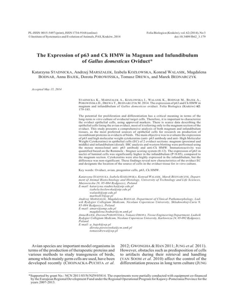 PL-ISSN 0015-5497 (print), ISSN 1734-9168 (online) Ó Institute of Systematics and Evolution of Animals, PAS, Kraków, 2014 Folia Biologica (Kraków), vol. 62 (2014), No 3 doi:10.3409/fb62_3.179 The Expression of p63 and Ck HMW in Magnum and Infundibulum of Gallus domesticus Oviduct* Katarzyna STADNICKA, Andrzej MARSZA£EK, Izabela KOZ£OWSKA, Konrad WALASIK, Magdalena BODNAR, Anna BAJEK, Dorota POROWIÑSKA, Tomasz DREWA, and Marek BEDNARCZYK Accepted May 15, 2014 S TADNICKA K., M ARSZA£EK A., K OZ£OWSKA I., W ALASIK K., B ODNAR M., B AJEK A., POROWIÑSKA D., D REWA T., B EDNARCZYK M. 2014. The expression of p63 and Ck HMW in magnum and infundibulum of Gallus domesticus oviduct. Folia Biologica (Kraków) 62: 179-185. The potential for proliferation and differentiation has a critical meaning in terms of the long-term in vitro culture of oviductal target cells. Therefore, it is important to characterize the oviduct epithelial cells, using approved markers. There is scarce data describing the epithelial cells lining the avian oviduct, most of it referring only to the magnum section of the oviduct. This study presents a comprehensive analysis of both magnum and infundibulum tissues, as the most preferred sources of epithelial cells for research on production of recombinant proteins in oviducts of birds. The main objective was to evaluate the expression of p63 and high molecular weight cytokeratins (anti- p63 antibody and anti- High Molecular Weight Cytokeratins) in epithelial cells (EC) of 2 oviduct sections: magnum (proximal and middle) and infundibulum (distal). IHC analysis and western blotting were performed using the mouse monoclonal anti- p63 antibody and anti-Ck HMW. Immunoreactivity was quantified based on the Remmele - Stegner scoring system (0-12). The expression of p63 in nuclei of luminal cells was significantly higher in the infundibulum (P<0.05), compared to the magnum section. Cytokeratins were also highly expressed in the infundibulum, but the difference was non-significant. These findings reveal new characteristics of the oviduct EC and designate the location of the source of cells in the oviduct tissue for in vitro culture. Key words: Oviduct, avian, progenitor cells, p63, Ck HMW. Katarzyna STADNICKA, Izabela KOZ£OWSKA, Konrad WALASIK, Marek BEDNARCZYK, Department of Animal Biotechnology and Histology, University of Technology and Life Sciences, Mazowiecka 28, 85-084 Bydgoszcz, Poland. E-mail: [email protected] [email protected] [email protected] [email protected] Andrzej M ARSZA£EK , Magdalena B ODNAR , Department of Clinical Pathomorphology, Ludwik Rydygier Collegium Medicum, Nicolaus Copernicus University, Sklodowskiej-Curie 9, 85-094 Bydgoszcz, Poland. E-mail: [email protected] [email protected] Anna B AJEK , Dorota P OROWIÑSKA , Tomasz D REWA , Tissue Engineering Department, Ludwik Rydygier Collegium Medicum, Nicolaus Copernicus University, Karlowicza 24, 05-092 Bydgoszcz, Poland. E-mail: [email protected] [email protected] [email protected] Avian species are important model organisms in terms of the production of therapeutic proteins and various methods to study transgenesis of birds, among which mainly germ cells are used, have been developed recently (CHOJNACKA-PUCHTA et al. 2012; GWONGHA & HAN 2011; JUNG et al. 2011). However, obstacles such as predisposition of cells to artifacts during their retrieval and handling (VAN SOOM et al. 2010) affect the control of the differentiation process in long term culture (JUNG _______________________________________ *Supported by grant No.: NCN 2011/03/N/NZ9/03814. The experiments were partially conducted with equipment co-financed by the European Regional Development Fund under the Regional Operational Program for Kujawy-Pomerania Province for the years 2007-2013. 180 K. STADNICKA et al. et al. 2010). Apart from being useful in the bioreactor approach, oviduct tissue serves as a good model for biomedical research by means of remarkable analogy between the ovulatory cycles of women and hens (JOHNSON & GILES 2013) and the spontaneous adenocarcinomas occurring in the latter (TREVINO et al. 2010; RICCI et al. 2013). Recently, attention has turned towards adult multipotent stem cells (DAVIES & FAIRCHILD 2011) which are well described in mammals, but not in birds (HEO et al. 2012). Together with the discovery of progenitor and stem cell niches, vast opportunities for biomodeling in clinical trials and in vitro studies, including toxicological evaluations, have appeared (GATTENGO-HO et al. 2012). Stem cell niches provide a suitable environment and are necessary to maintain homeostasis of colonizing stem cells (DREWA et al. 2009). Prospective use of avian oviduct stem cells requires the identification of specific markers allowing for precise recognition and isolation of adult stem cells. Two major groups of stem cell markers of epithelial origin are currently available, the first of which are intracellular proteins (cytokeratins) and the second are cell surface proteins. It is convenient that most primary antibodies applied in immunohistochemical (IHC) studies are known to cross-react with avian tissues (MANAROLLA et al. 2011) making them available for chicken studies. YANG et al. (1999) reported that the transcription factor p63 is critical for maintaining progenitor cell populations necessary to sustain epithelial development and morphogenesis. It is also highly expressed in embryonic ectoderm and in the nuclei of basal regenerative cells of many adult epithelial tissues including skin, prostate and urothelia (WESTFALL & PIETENPOL 2004). Monoclonal anti- Ck HMW (high-molecular weight cytokeratins) are a mixture of antibodies which can react with several cytokeratins (Ck 1-5-10-14), indicating the presence of highly proliferative myoepithelial cells in the epithelial basal cell layer. We demonstrate how the cells of infundibulum and magnum sections of hen oviducts react with epithelial cell markers. Material and Methods Experime