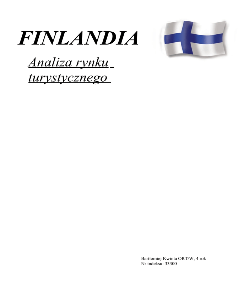 FINLANDIA Analiza rynku turystycznego Bartłomiej Kwinta ORT/W, 4 rok Nr indeksu: 33300 SPIS TREŚCI Wstęp I Rozdział- Podstawowe informacje 1.1 Położenie.........................................................................................................................4 1.2 Ludność...........................................................................................................................5 1.3 Gospodarka..................................................................................................................6,7 1.4 Regionalizacja turystyczna....................................................................................... 7,8,9 1.5 Atrakcje turystyczne..............................................................................................9,10,11 1.6 Dostępność komunikacyjna.....................................................................................11,12 II Rozdział 2.1 Przyjazdy..................................................................................................................12,13 2.2 Regiony....................................................................................................................13,14 2.3 Charakterystyka podróżujących....................................................................................15 2.4 Cele przyjazdów............................................................................................................16 2.5 Transport..................................................................................................................16,17 2.6 Długość pobytu.............................................................................................................17 2.7 Typ zakwaterowania.....................................................................................................18 2.8 Wydatki..........................................................................................................................19 2.9 Bilans turystyczny.....................................................................................................19,20 III Rozdział-Rynek emisji turystycznej 3.1 Wyjazdy i długości pobytu............................................................................................20 IV Rozdział-Znaczenie rynku turystycznego Finlandii dla Polski 4.1 Przyjazdy.......................................................................................................................21 4.2 Struktura wydatków..................................................................................................21,22 4.3 Zakwaterowanie............................................................................................................22 Bibliografia...........................................................................................................................23 Spis Tabel.............................................................................................................................23 Spis Wykresów.....................................................................................................................23 Wstęp Uzasadnienie wybranego państwa Wybrałem Finlandie ponieważ uważam że jest to jest niesamowite miejsce co przekłada się również na jej wyjątkowość z punktu widzenia turystyki. Niesamowicie indywidualna kultura narodu fińskiego oraz odmienność Finlandii od innych państw Europy dotyka przybywających tu turystów. Zwiedzając Finlandię, turysta spotyka odmienną kulturę w zupełnie inny sposób niż tylko i wyłącznie przez poznawanie zabytków. Kultura Finów widoczna jest w każdym aspekcie ich życia. Jest ona bardzo naznaczona klimatem Skandynawii, ukształtowana w zgodzie i harmonii z naturą, dlatego również w niej samej dostrzec można wpływy północnej przyrody. Uważam, że fińska kultura doskonale uzupełnia piękno walorów przyrodniczych, również wyjątkowych w skali świata. Turysta doświadcza ich podczas całego pobytu: doświadcza inności, doświadcza Północy. Uważam, że nigdzie indziej kultura skandynawska nie jest bardziej obecna i wyraźna niż właśnie w Finlandii: w Finach i fińskiej przyrodzie. Dlatego wydaje mi się, że pod względem czynników kulturalnych i przyrodniczych Finlandia śmiało konkurować może z innymi państwami skandynawskimi, jeśli tylko umiejętnie wypromuje swój wizerunek. Turysta odwiedzający Skandynawię, to turysta wybrany, szukający nie „atrakcji”, ale „przeżycia turystycznego”. W obliczu zmiany kultury uprawiania turystyki: przejścia z turystyki twardej na miękką, wzrostu zainteresowania aktywnymi formami spędzania wypoczynku, ekoturystyką i krajoznawstwem, Finlandia stanowić może destynację przyszłości dla turysty indywidualnego, szukającego głębszego przeżycia, a nie tylko wypoczynku na plaży. Wizyta w Finlandii nie stanowi rozrywki, czy atrakcji. Jest ona swoistym doświadczeniem turystycznym, zetknięciem z dziką przyrodą i ze skandynawską kulturą, tak bardzo ze sobą połączonymi. Nieskażona przyroda i indywidualność narodu fińskiego są, moim zdaniem, największymi walorami turystycznymi tego kraju. Są one widoczne na przestrzeni każdego regionu turystycznego, w każdej części Finlandii. I.PODSTAWOWE INFORMACJE 1.1 POŁOZENIE Powierzchnia: 338 145 km2 (w tym: 10% wody, 69% lasów) Najwyższy szczyt: Haltia (1324 m n.p.m.) Najdłuższa rzeka: Kemi - 483 km Największe jezioro: Saimaa - 4400 km2 Obszary wodne: 187 888 jezior, 5 100 wodospadów, 179 584 wysp Finlandia leży w Europie północnej, pomiędzy 60 a 70 równoleżnikiem szerokości geograficznej północnej. Graniczy ze Szwecją na zachodzie, Norwegią na północy, Rosją na wchodzie i południu oraz z Estonią - poprzez Zatokę Fińską. Większa część powierzchnii kraju to pofałdowany płaskowyż, zbudowany ze zerodowanego podłoża skalnego i pokryty północnym lasem co w sumie tworzy krajobraz urozmaicony