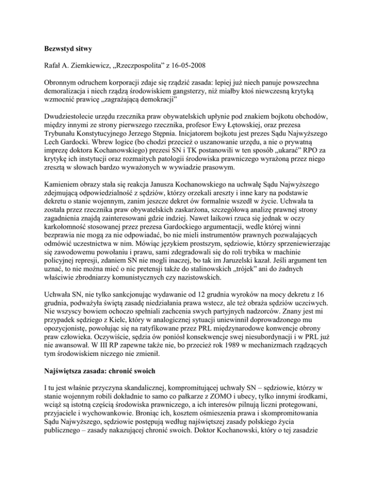 Bezwstyd sitwy Rafał A. Ziemkiewicz, „Rzeczpospolita” z 16-05-2008 Obronnym odruchem korporacji zdaje się rządzić zasada: lepiej już niech panuje powszechna demoralizacja i niech rządzą środowiskiem gangsterzy, niż miałby ktoś niewczesną krytyką wzmocnić prawicę „zagrażającą demokracji” Dwudziestolecie urzędu rzecznika praw obywatelskich upłynie pod znakiem bojkotu obchodów, między innymi ze strony pierwszego rzecznika, profesor Ewy Łętowskiej, oraz prezesa Trybunału Konstytucyjnego Jerzego Stępnia. Inicjatorem bojkotu jest prezes Sądu Najwyższego Lech Gardocki. Wbrew logice (bo chodzi przecież o uszanowanie urzędu, a nie o prywatną imprezę doktora Kochanowskiego) prezesi SN i TK postanowili w ten sposób „ukarać” RPO za krytykę ich instytucji oraz rozmaitych patologii środowiska prawniczego wyrażoną przez niego zresztą w słowach bardzo wyważonych w wywiadzie prasowym. Kamieniem obrazy stała się reakcja Janusza Kochanowskiego na uchwałę Sądu Najwyższego zdejmującą odpowiedzialność z sędziów, którzy orzekali areszty i inne kary na podstawie dekretu o stanie wojennym, zanim jeszcze dekret ów formalnie wszedł w życie. Uchwała ta została przez rzecznika praw obywatelskich zaskarżona, szczegółową analizę prawnej strony zagadnienia znajdą zainteresowani gdzie indziej. Nawet laikowi rzuca się jednak w oczy karkołomność stosowanej przez prezesa Gardockiego argumentacji, wedle której winni bezprawia nie mogą za nie odpowiadać, bo nie mieli instrumentów prawnych pozwalających odmówić uczestnictwa w nim. Mówiąc językiem prostszym, sędziowie, którzy sprzeniewierzając się zawodowemu powołaniu i prawu, sami zdegradowali się do roli trybika w machinie policyjnej represji, zdaniem SN nie mogli inaczej, bo tak im Jaruzelski kazał. Jeśli argument ten uznać, to nie można mieć o nic pretensji także do stalinowskich „trójek” ani do żadnych właściwie zbrodniarzy komunistycznych czy nazistowskich. Uchwała SN, nie tylko sankcjonując wydawanie od 12 grudnia wyroków na mocy dekretu z 16 grudnia, podważyła świętą zasadę niedziałania prawa wstecz, ale też obraża sędziów uczciwych. Nie wszyscy bowiem ochoczo spełniali zachcenia swych partyjnych nadzorców. Znany jest mi przypadek sędziego z Kielc, który w analogicznej sytuacji uniewinnił doprowadzonego mu opozycjonistę, powołując się na ratyfikowane przez PRL międzynarodowe konwencje obrony praw człowieka. Oczywiście, sędzia ów poniósł konsekwencje swej niesubordynacji i w PRL już nie awansował. W III RP zapewne także nie, bo przecież rok 1989 w mechanizmach rządzących tym środowiskiem niczego nie zmienił. Najświętsza zasada: chronić swoich I tu jest właśnie przyczyna skandalicznej, kompromitującej uchwały SN – sędziowie, którzy w stanie wojennym robili dokładnie to samo co pałkarze z ZOMO i ubecy, tylko innymi środkami, wciąż są istotną częścią środowiska prawniczego, a ich interesów pilnują liczni protegowani, przyjaciele i wychowankowie. Broniąc ich, kosztem ośmieszenia prawa i skompromitowania Sądu Najwyższego, sędziowie postępują według najświętszej zasady polskiego życia publicznego – zasady nakazującej chronić swoich. Doktor Kochanowski, który o tej zasadzie zapomniał i zgodnie z logiką swego urzędu poczuł się rzecznikiem Obywateli, a nie sitwy, z którą powinien trzymać z racji zawodu, jest zaś czarną owcą i zdrajcą. Jest nim zresztą już od dawna, choćby przez fakt, że ośmielił się niegdyś zwrócić uwagę wspomnianej już prof. Łętowskiej na niestosowność jej zaangażowania w polityczną akcję mającą na celu odwołanie ministra sprawiedliwości. Dlatego też czcigodni prezesi uznali, że przyszedł czas, by zmobilizować przeciwko niemu oburzenie środowiska. Nie dam pięciu groszy, czy ich akcja nie jest przygotowaniem do powtórzenia operacji wypróbowanej już na osobie pani Sowińskiej. Innym zdrajcą i czarną owcą środowiska jest prof. Lech Morawski, który swego czasu na łamach „Państwa i Prawa” miażdżąco skrytykował, jako sprzeczne z konstytucją, cechowe praktyki korporacji prawniczych, mające na celu zamknięcie intratnych zawodów dla osób niespokrewnionych i niezaproszonych przez nie same. Pośrednio zmiażdżył też swą argumentacją orzeczenie Trybunału Konstytucyjnego unieważniające ustawę, która dostęp do zawodów prawniczych próbowała otworzyć. Przypomnijmy, że TK zinterpretował art. 17 konstytucji mówiący, iż w drodze ustaw można (tylko można!) tworzyć samorządy dbające o poziom wykonywania zawodów, jako dający samorządom prawo wyłączności w selekcjonowaniu kandydatów do zawodu. Jednocześnie zupełnie zignorował TK istnienie art. 20. Stanowi on, iż żaden obywatel Polski nie może być pozbawiany prawa do swobodnego podejmowania działalności gospodarczej (a zważywszy, jak ochoczo skorzystali prawnicy z wprowadzonego przez rząd Millera liniowego podatku CIT dla podmiotów gospodarczych, nikt nie ma wątpliwości, iż zawody prawnicze do tej właśnie kategorii się zaliczają). Użyto tu argumentu, iż TK jedynie odpowiada na zadane mu pytanie, a we wniosku złożonym przez korporacje pytano tylko o zgodność ustawy z art. 17. Gdy jednak TK zabrał się do ustawy lustracyjnej, nie czuł się związany żadnym wnioskiem, ale swobodnie wybrał sobie partie ustawy do zbadania zgodności z wybranymi zapisami konstytucji. Około miesiąca po tym wyroku Trybunał Europejski, obalając w precedensowej sprawie wyrok Trybunału Konstytucyjnego Słowenii z tej przyczyny, iż jeden z jego sędziów pracował przedtem dla firmy będącej stroną w sprawie, wyznaczył pewien standard co do wymogu bezstronności sędziów. W tym świetle nie ulega wątpliwości, że gdyby wyrok polskiego TK w sprawie lustracji został zaskarżony (czego, niestety, żadna ze stron nie uczyniła) – nie miałby sz
