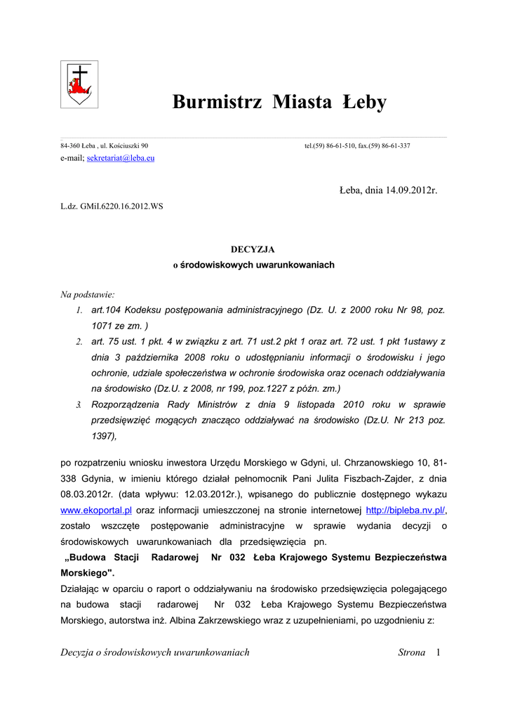 Burmistrz Miasta Łeby _______________________________________________________________________________________________________________________________________________________________________________________________________________________________________________________________________________________________________________________________________________________________________________________------------------------------------------------------------------------------------------------------------------------ 84-360 Łeba , ul. Kościuszki 90 tel.(59) 86-61-510, fax.(59) 86-61-337 e-mail; [email protected] Łeba, dnia 14.09.2012r. L.dz. GMiI.6220.16.2012.WS DECYZJA o środowiskowych uwarunkowaniach Na podstawie: 1. art.104 Kodeksu postępowania administracyjnego (Dz. U. z 2000 roku Nr 98, poz. 1071 ze zm. ) 2. art. 75 ust. 1 pkt. 4 w związku z art. 71 ust.2 pkt 1 oraz art. 72 ust. 1 pkt 1ustawy z dnia 3 października 2008 roku o udostępnianiu informacji o środowisku i jego ochronie, udziale społeczeństwa w ochronie środowiska oraz ocenach oddziaływania na środowisko (Dz.U. z 2008, nr 199, poz.1227 z późn. zm.) 3. Rozporządzenia Rady Ministrów z dnia 9 listopada 2010 roku w sprawie przedsięwzięć mogących znacząco oddziaływać na środowisko (Dz.U. Nr 213 poz. 1397), po rozpatrzeniu wniosku inwestora Urzędu Morskiego w Gdyni, ul. Chrzanowskiego 10, 81338 Gdynia, w imieniu którego działał pełnomocnik Pani Julita Fiszbach-Zajder, z dnia 08.03.2012r. (data wpływu: 12.03.2012r.), wpisanego do publicznie dostępnego wykazu www.ekoportal.pl oraz informacji umieszczonej na stronie internetowej http://bipleba.nv.pl/, zostało wszczęte postępowanie administracyjne w sprawie wydania decyzji o środowiskowych uwarunkowaniach dla przedsięwzięcia pn. „Budowa Stacji Radarowej Nr 032 Łeba Krajowego Systemu Bezpieczeństwa Morskiego". Działając w oparciu o raport o oddziaływaniu na środowisko przedsięwzięcia polegającego na budowa stacji radarowej Nr 032 Łeba Krajowego Systemu Bezpieczeństwa Morskiego, autorstwa inż. Albina Zakrzewskiego wraz z uzupełnieniami, po uzgodnieniu z: Decyzja o środowiskowych uwarunkowaniach Strona 1 1. Regionalnym Dyrektorem Ochrony Środowiska w Gdańsku, postanowienie znak: RDOŚ-Gd-WOO.4242.52.2012.ASP.6. z dnia 14.08.2012r. (data wpływu:21.08.2012r.) 2. Państwowym Wojewódzkim Inspektorem Sanitarnym w Gdańsku, opinia znak: SENS-80.9022.4961.17.2012.AS z dnia 26.04.2012r. (data wpływu: 02.05.2012r.), orzekam I. ustalić dla przedsięwzięcia pn. „Budowa Stacji Radarowej Nr 032 Łeba Krajowego Systemu Bezpieczeństwa Morskiego", polegającego na budowie stacji radarowej Nr 032 Łeba Krajowego Systemu Bezpieczeństwa Morskiego, następujące środowiskowe uwarunkowania realizacji przedsięwzięcia: 1) rodzaj i miejsce realizacji przedsięwzięcia: Przedsięwzięcie będzie polegać na budowie stacji radarowej, wyposażonej w urządzenia radarowe. Projektowana inwestycja obejmuje: • budowę wieży żelbetowej o wysokości 28m z pomostem przy szczycie, • posadowienie obok wieży kontenera żelbetowego, prefabrykowanego na urządzenia technologiczne i na agregat prądotwórczy; • montaż i instalację w kontenerze urządzeń radiowych, nadawczoodbiorczych, sterujących i zasilających, • montaż na szczycie wieży anteny radaru, szczelinowej o wielkości 21', • montaż na pomoście wieży anteny parabolicznej radiolinii, • montaż na pomoście wieży dwóch anten prętowych, dookólnych dla dwóch radiostacji VHF, • montażu na pomoście wieży kamery TV oraz urządzeń meteorologicznych. Urządzenia stacji będą zasilane z sieci niskiego napięcia 230/400 V, 50 Hz. Planowany obiekt będzie pracował w sposób ciągły, bezobsługowo, z okresową kontrolą obsługi technicznej. Stacja stanowić będzie jeden z elementów Krajowego Systemu Bezpieczeństwa Morskiego. Wdrożenie tego systemu ma na celu poprawę dostępu do portów polskich od strony morza, podniesienia stopnia bezpieczeństwa morskiego i reagowania w niebezpieczeństwie, ochronę środowiska morskiego przez stworzenie systemu monitorowania ruchu statków w obszarach morskich Rzeczpospolitej Polskiej, przekazywanie informacji w ramach sieci bezpieczeństwa morskiego oraz wprowadzenia systemu wczesnego ostrzegania. Decyzja o środowiskowych uwarunkowaniach Strona 2 Projektowana stacja radarowa będzie zlokalizowana na wydzielonej, nieużytkowanej części działki nr 365/71, w obrębie pasa technicznego wybrzeża, obok kanału portowego. Wzdłuż nabrzeża portowego, w pobliżu którego położona jest działka, biegnie droga z nawierzchnią z płyt betonowych. Zabudowa mieszkaniowa znajduje się w odległości około 500 m w kierunku południowym i południowo-wschodnim od planowanej stacji radarowej. Inwestycja zlokalizowana jest poza obszarami Natura 2000. Najbliżej położone obszary Natura 2000 to: • ok. 80 metrów na północ Przybrzeżne Wody Bałtyku PLB 220002, • ok. 1,5 km na południowy wchód Mierzeja Sarbska PLH 220018, • ok. 1,5 km na zachód Pobrzeże Słowińskie PLB 220003, • ok. 1,5 km na zachód Ostoja Słowińska PLH 220023. Planowane przedsięwzięcie usytuowane jest w otulinie Słowińskiego Parku Narodowego. Parametry techniczne urządzeń radarowych Nazwa parametru Radar Typ urządzenia TERMA SCANTER 2001 Częstotliwość pracy 9170-9438 MHz Nominalna moc w impulsie 25 kW Czas trwania impulsu 50-1000 ns Częstotliwość powtarzania impulsów 50-120ns 800 - 8000 Hz 120-300 ns 600-3300 Hz 300-600 ns 400 - 2200 Hz 600-1000 ns 400-1200 Hz Średnia moc sygnału 30 W Antena szczelinowa Wymiary anteny 21' -6560 mm Zysk energetyczny 38dBi Decyzja o środowiskowych uwarunkowaniach Strona 3 Szerokość wiązki promieniowania ≤0,36° (-3 dB) w azymucie Szerokość wiązki promieniowania ≤11°(-3dB) w elewacji Szybkość obrotu anteny 6 - 60/min Zakres działania radaru w 180°-080° = 260° azymucie Zasilanie Pobór mocy 240 